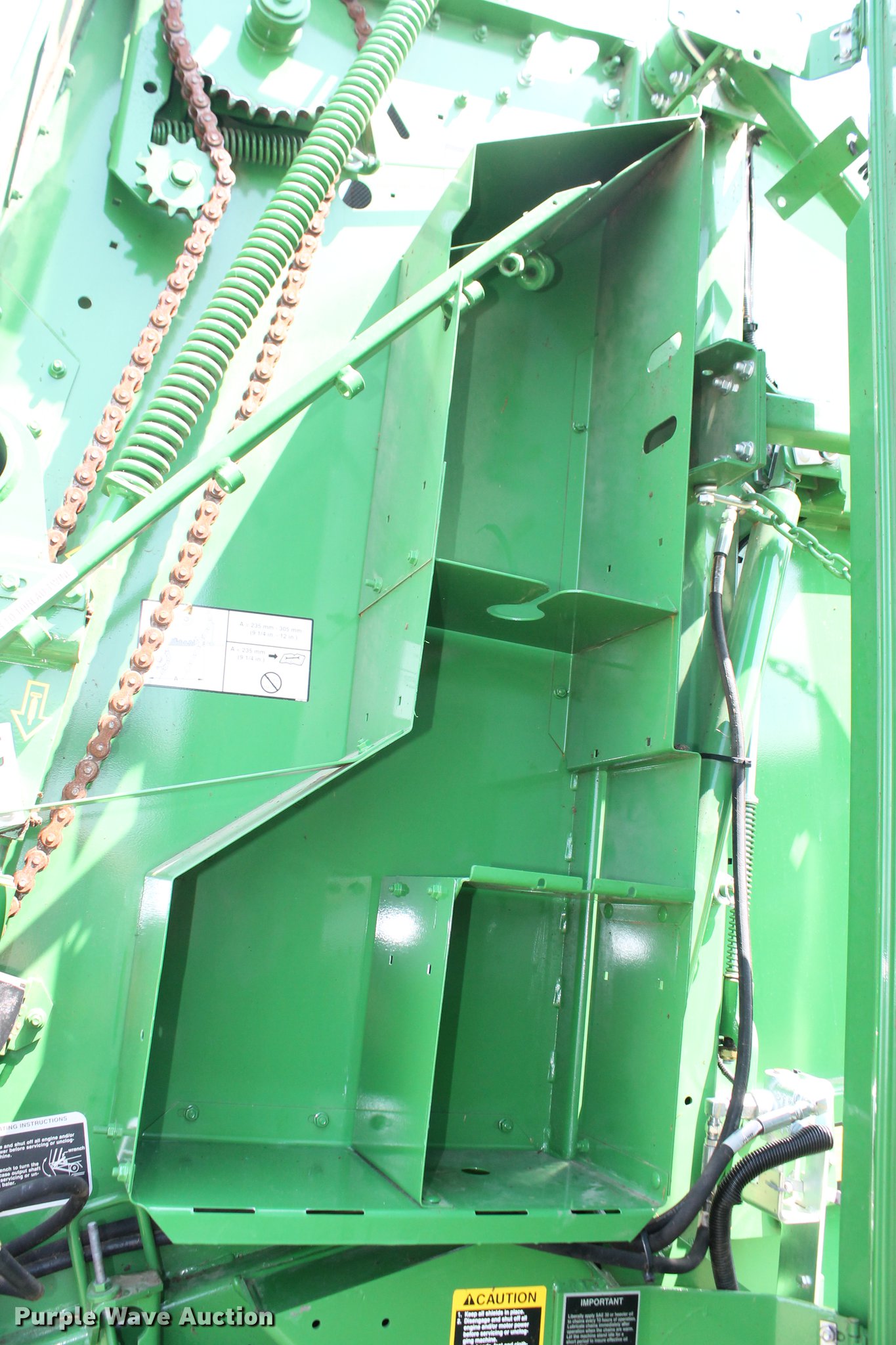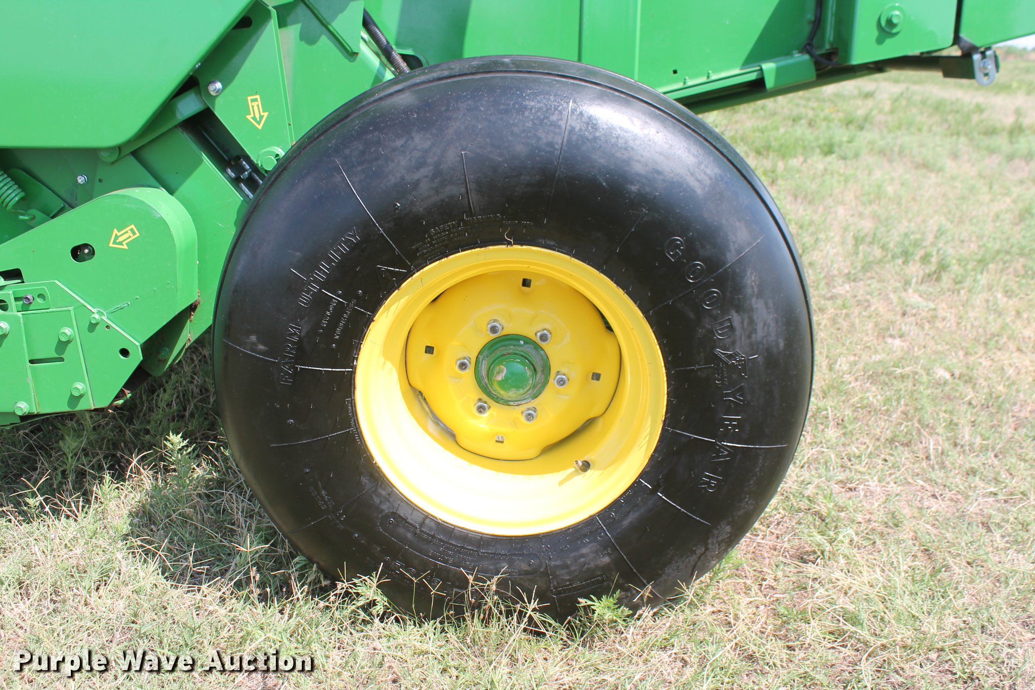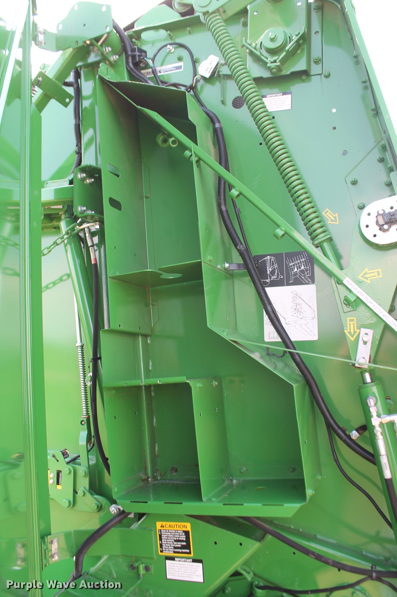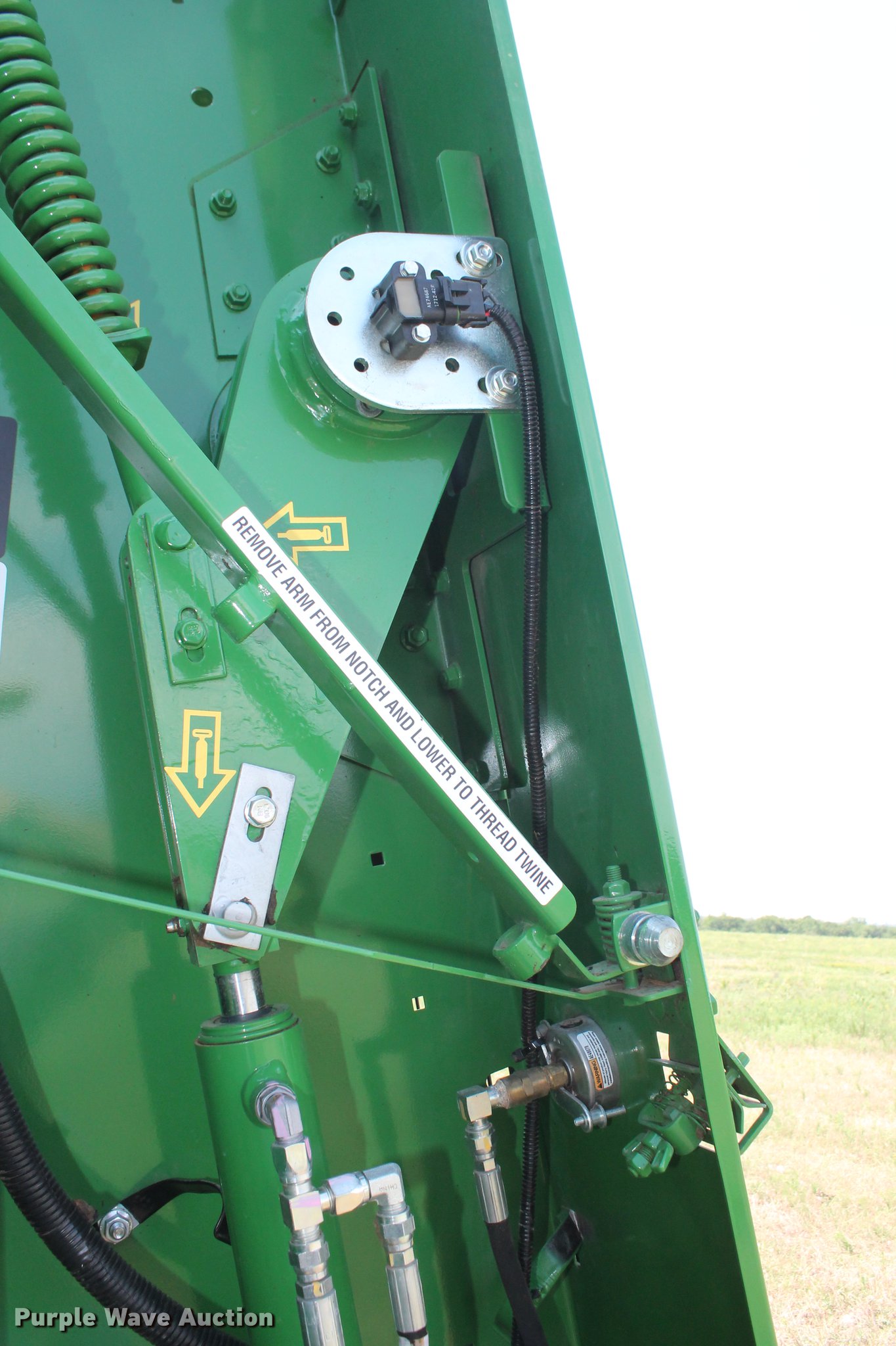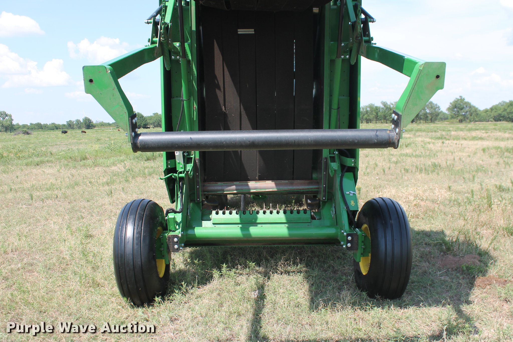 Purple Wave is selling a used Round Baler in Oklahoma. This item is a 2017 John Deere 469 Mega Wide Plus Silage Special round baler with the following: 504 bale count, 4' x 6' bale capacity, 60"W pickup, Hydraulic pickup lift, 4.80-8/3.75 gauge wheels, Rotor cutter, Feed assist roller, John Deere Bale Rak Pro AFH210762 monitor, Auto-tie, Twin twine tie, CoverEdge net-wrap, Bale kicker, Transport lights, Pin hitch, Goodyear 14L-16.1SL tires, Serial 1E00469SLHH432043