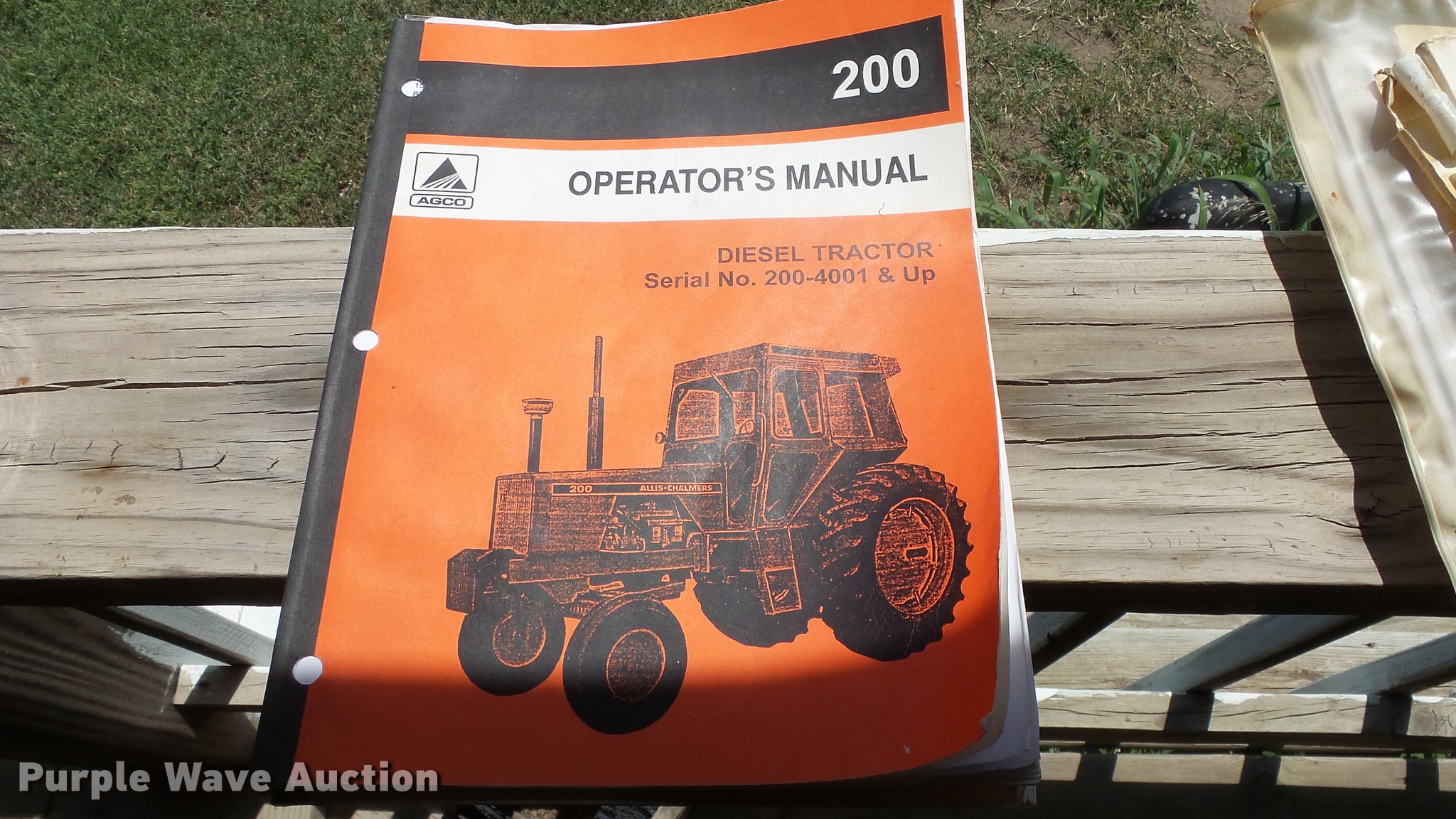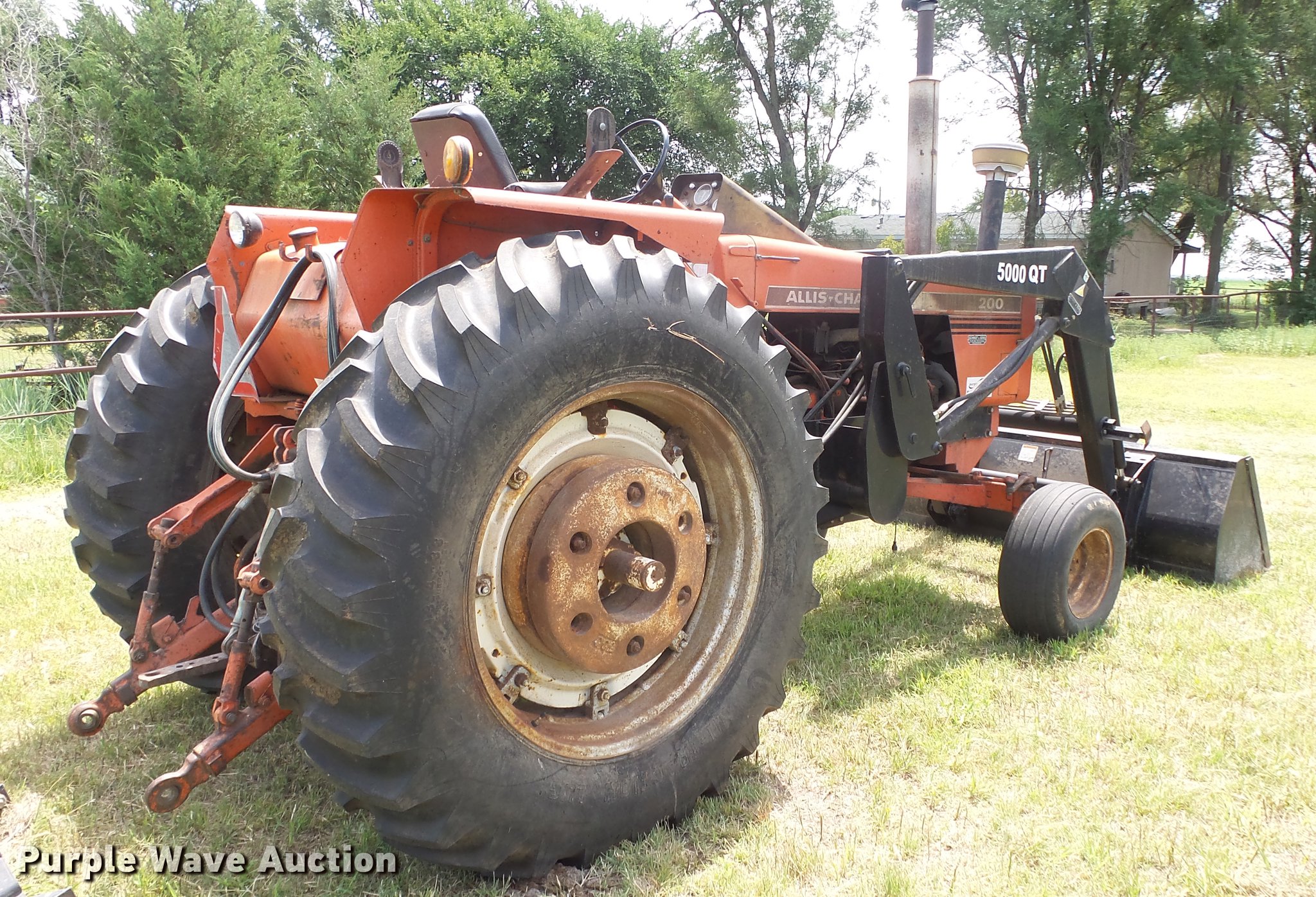 Purple Wave is selling a used Tractor in Kansas. This item is a Allis Chalmers 200 tractor with the following: 4,735 hours on meter, Allis Chalmers 4.9L six cylinder diesel engine, Manual transmission, 8F-2R gears, Work lights, Block heater, Schmidt & Sons QT5000 loader, 84"W bucket, Three point, 540 PTO, (2) rear hydraulic remote sets, 11L-15 front tires, 18.4-38 rear tires
