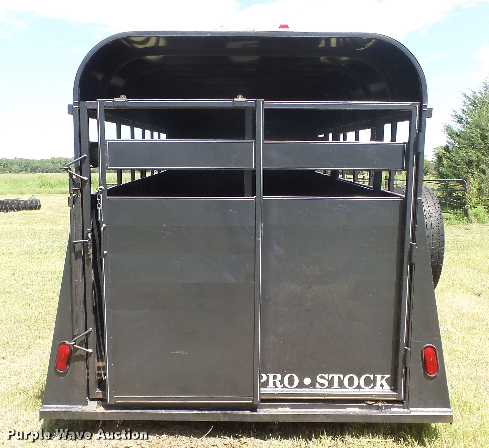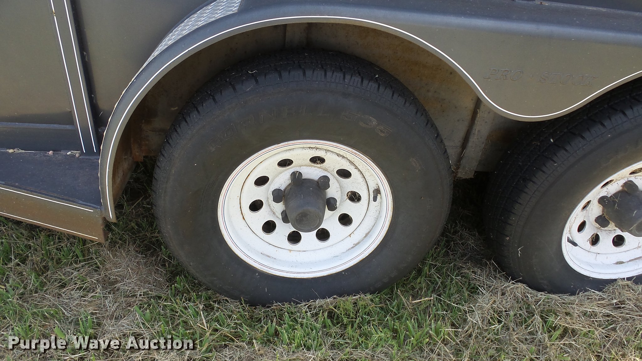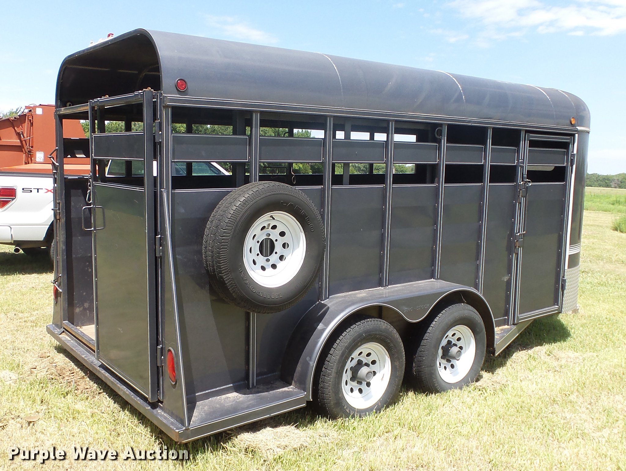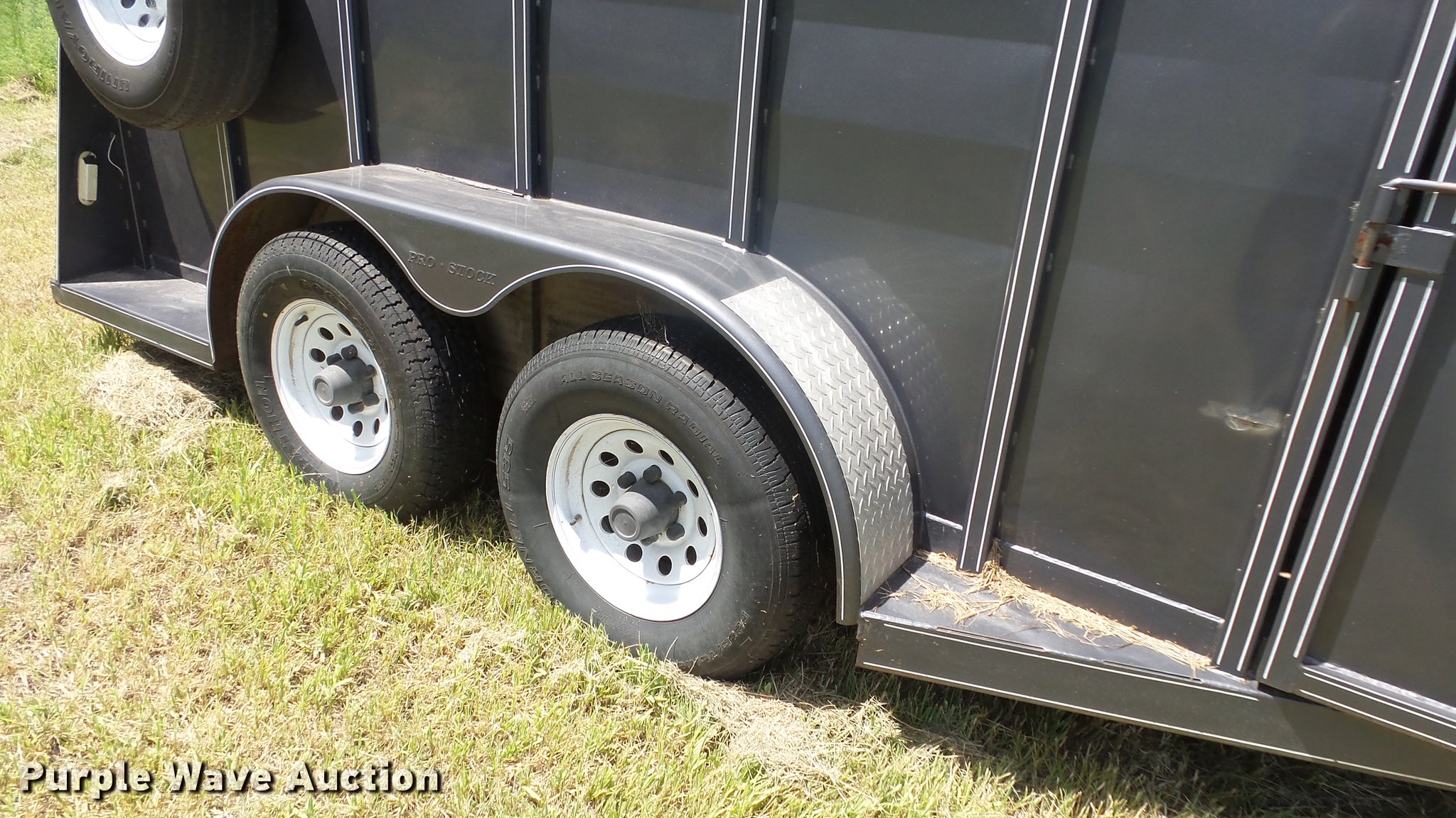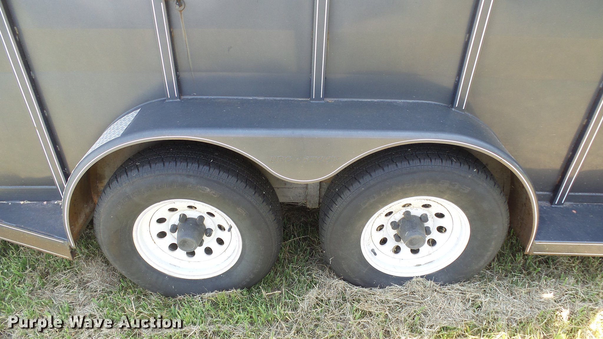 Purple Wave is selling a used Livestock Trailer in Kansas. This item is a 2004 Pro Stock livestock trailer with the following: 16'L x 6'W, 80"H interior, Wood floor, Rear swing door, Side access door, Divider gate, Full fenders, Ball hitch, Engager break-away system, Tandem axle, 225/75R15 tires, GVWR 7,000 lbs