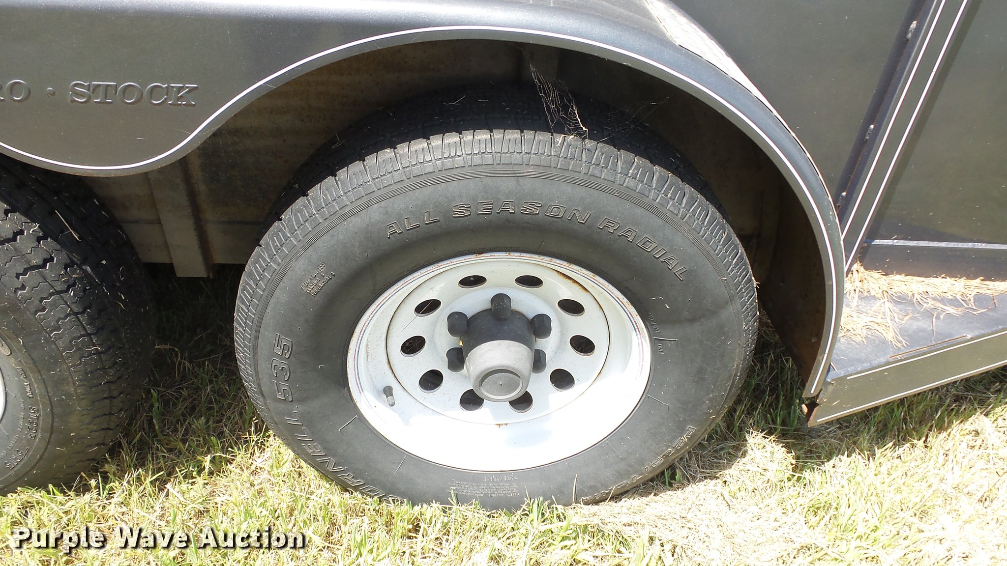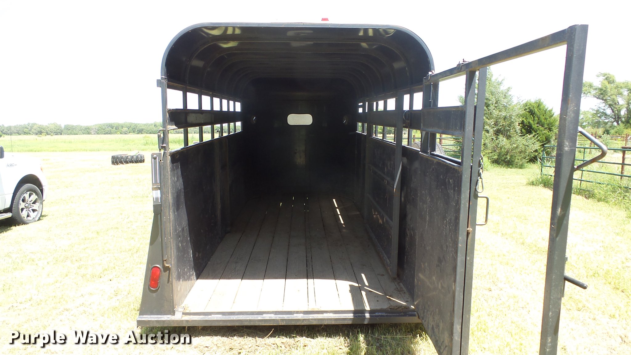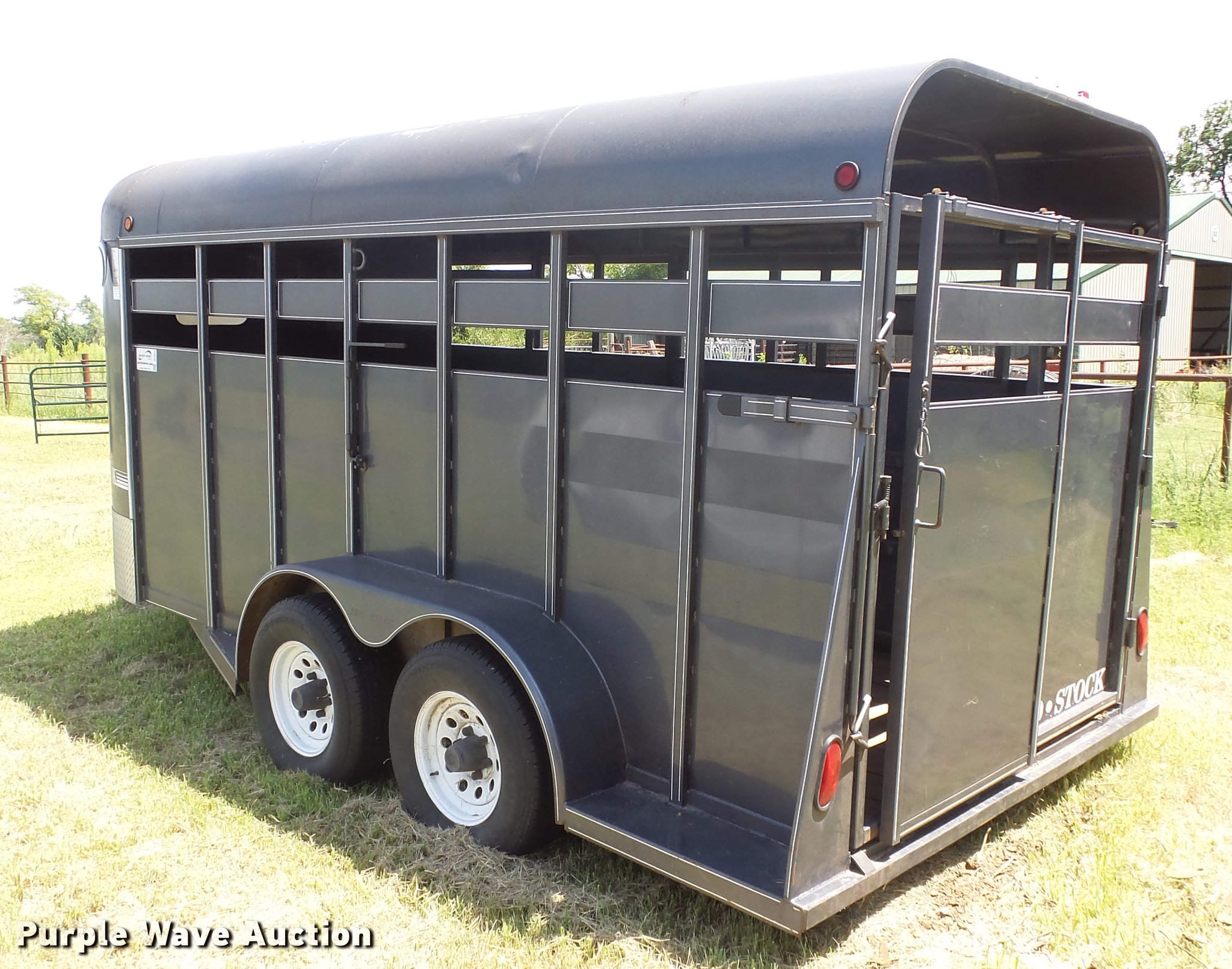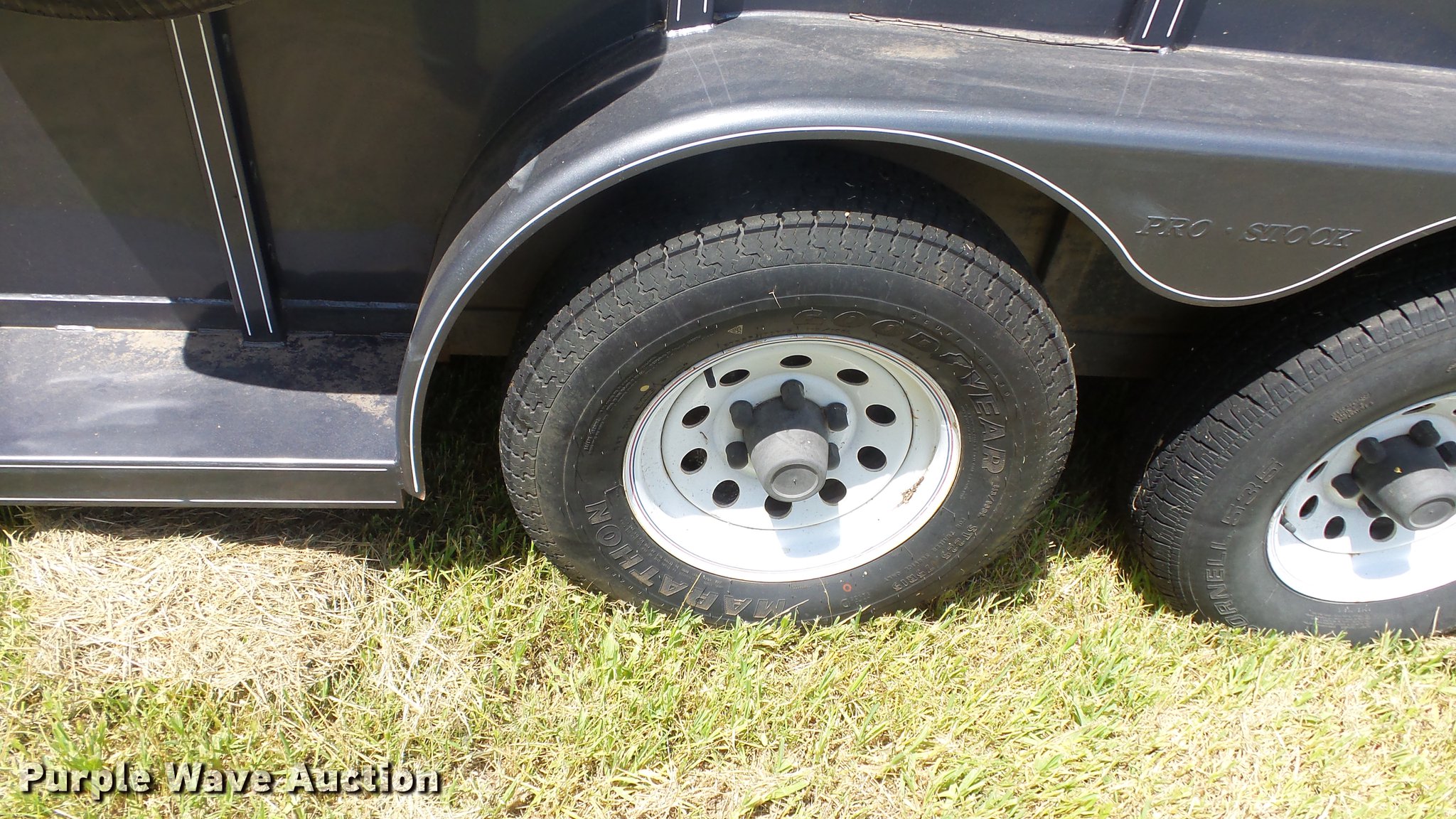 Purple Wave is selling a used Livestock Trailer in Kansas. This item is a 2004 Pro Stock livestock trailer with the following: 16'L x 6'W, 80"H interior, Wood floor, Rear swing door, Side access door, Divider gate, Full fenders, Ball hitch, Engager break-away system, Tandem axle, 225/75R15 tires, GVWR 7,000 lbs