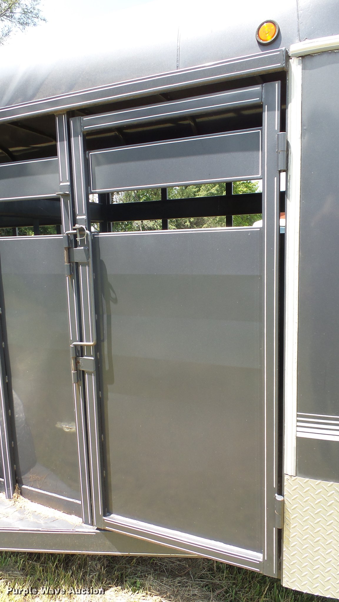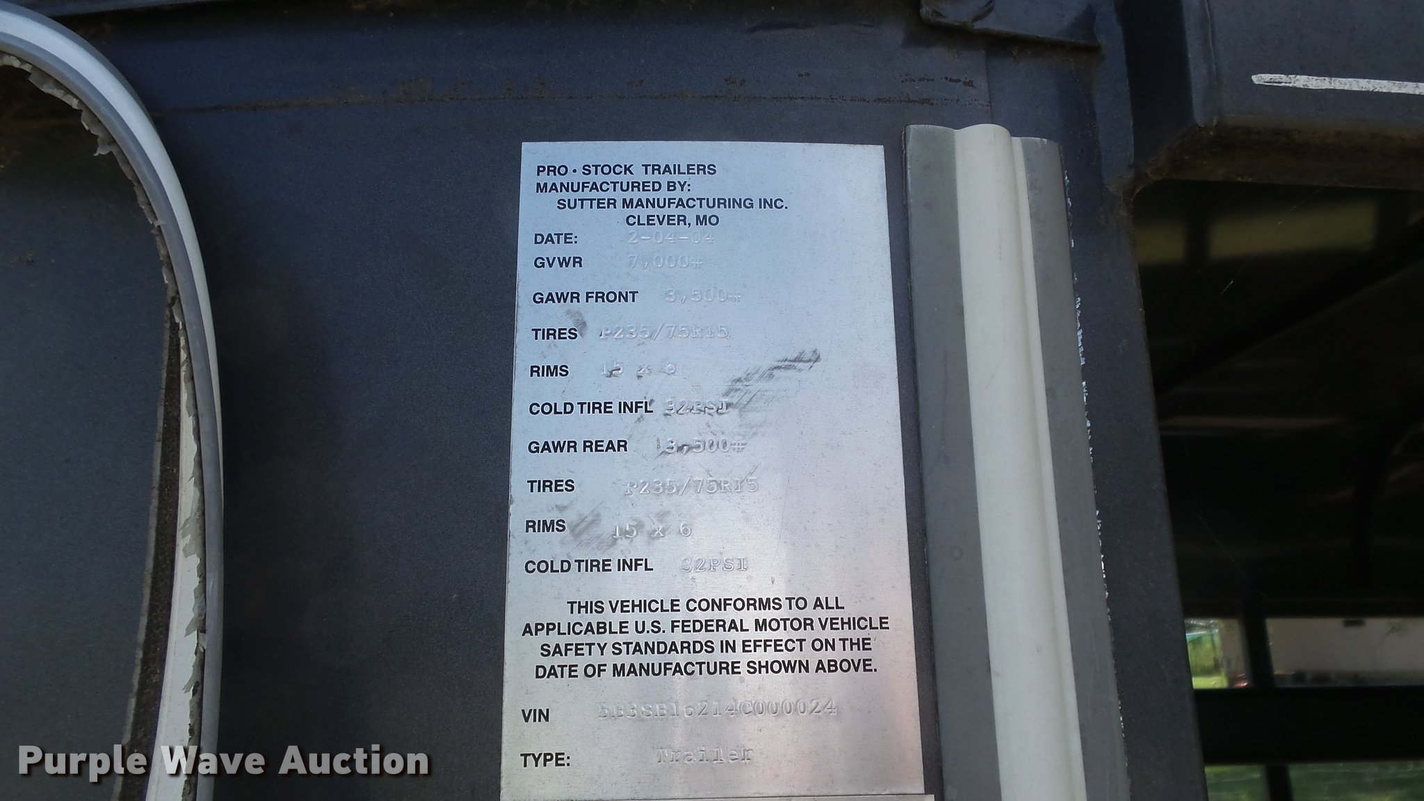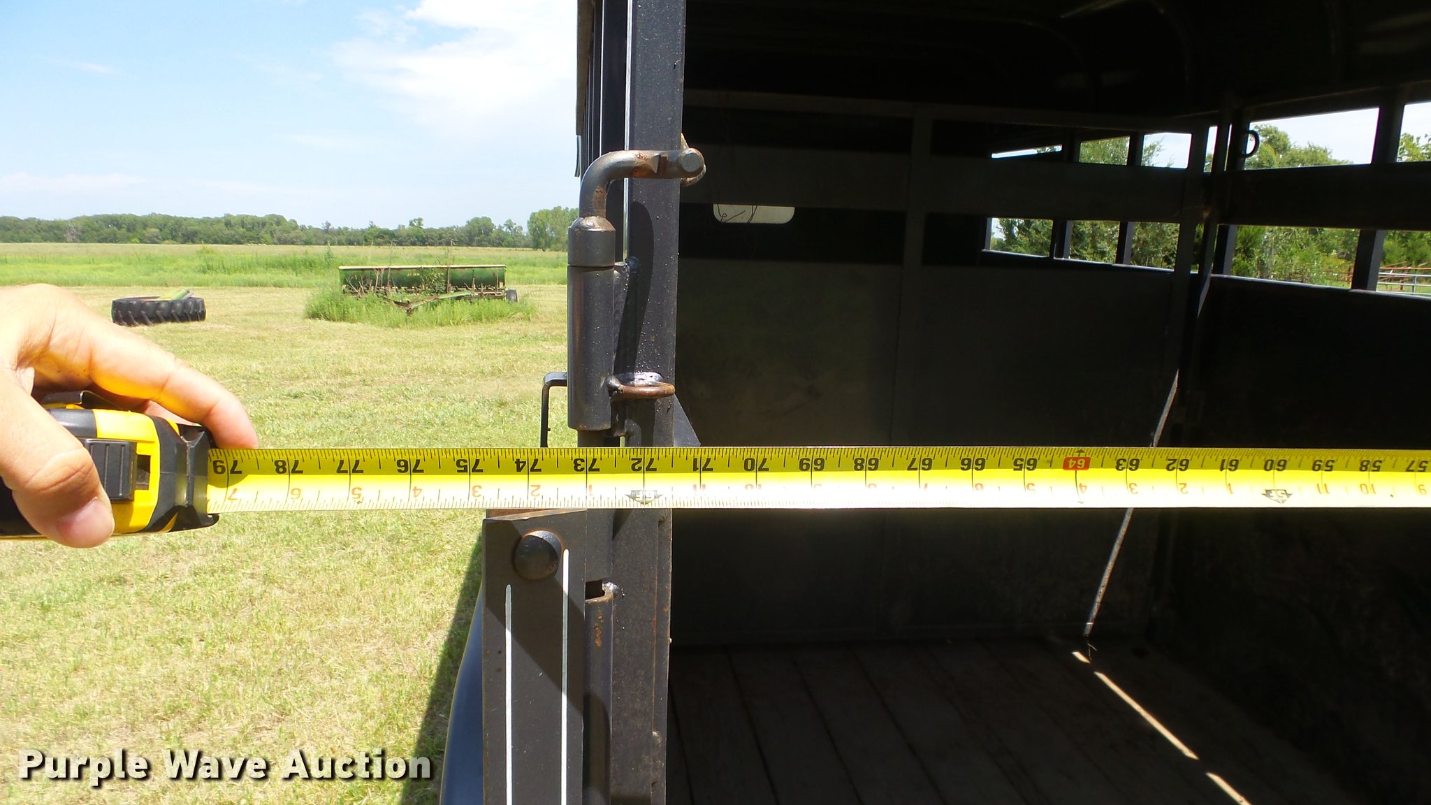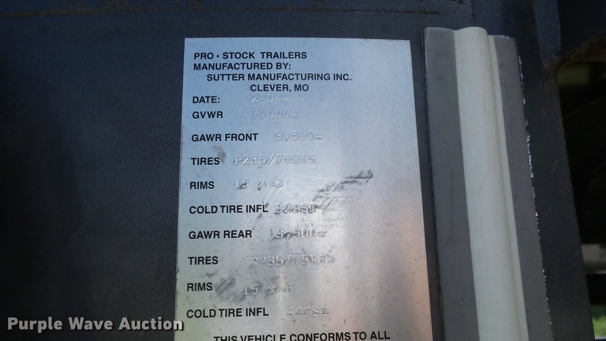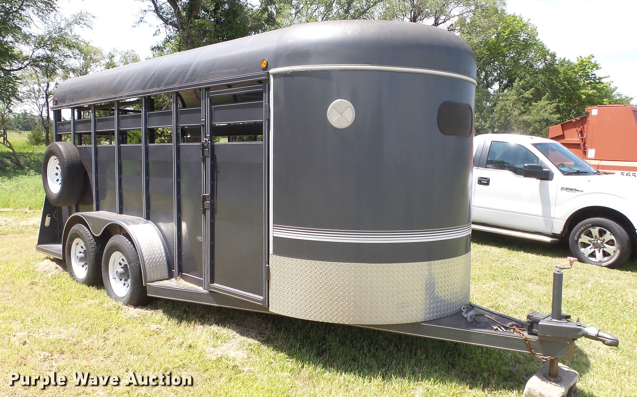 Purple Wave is selling a used Livestock Trailer in Kansas. This item is a 2004 Pro Stock livestock trailer with the following: 16'L x 6'W, 80"H interior, Wood floor, Rear swing door, Side access door, Divider gate, Full fenders, Ball hitch, Engager break-away system, Tandem axle, 225/75R15 tires, GVWR 7,000 lbs