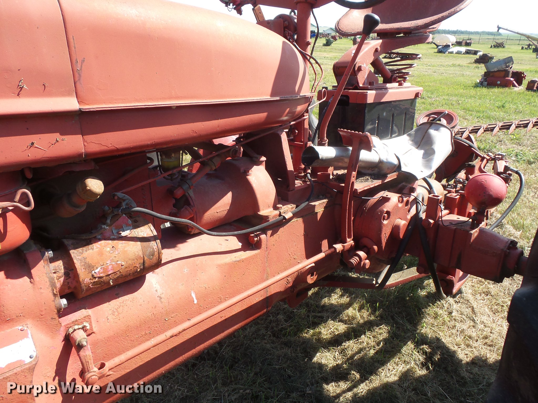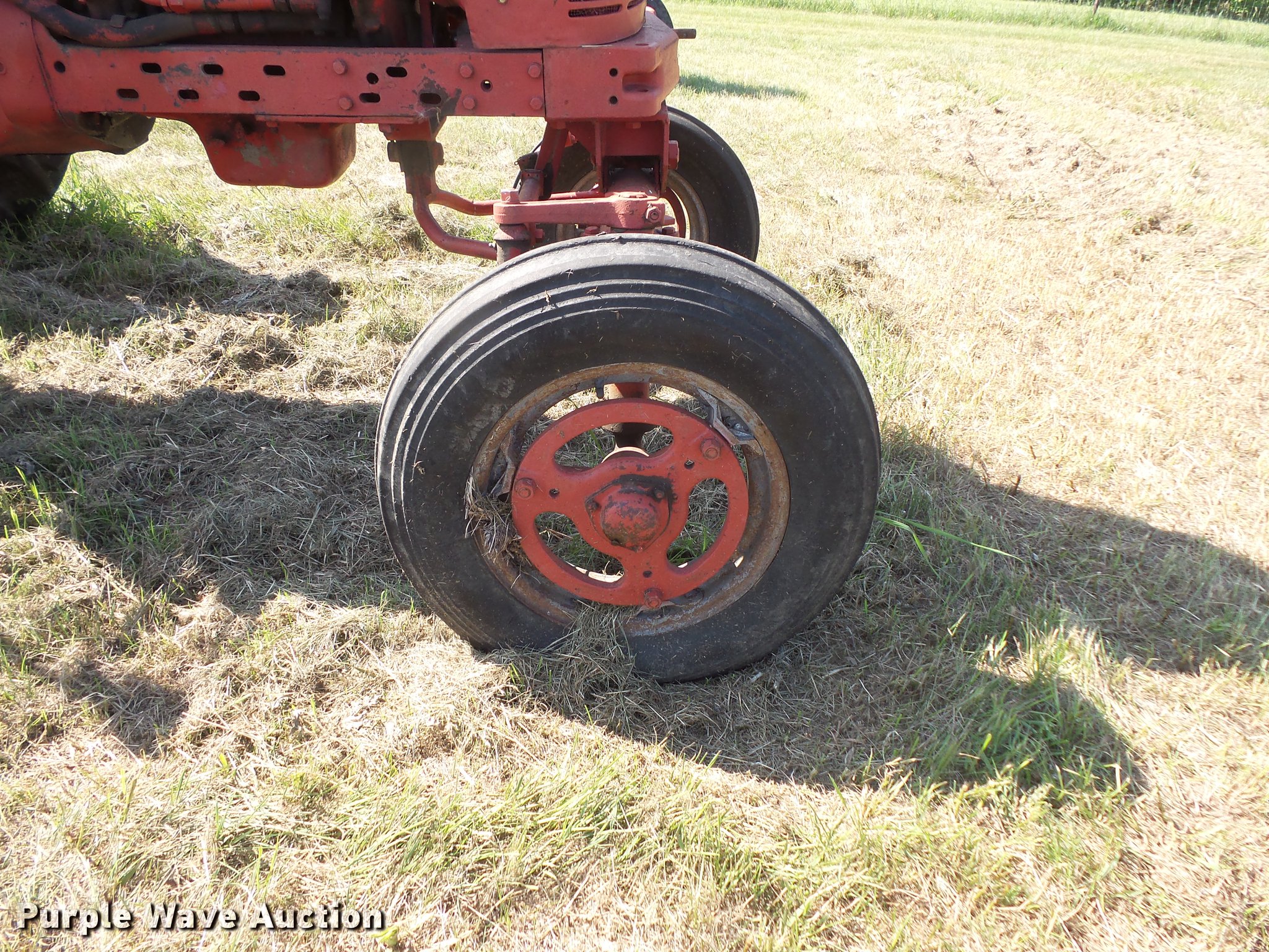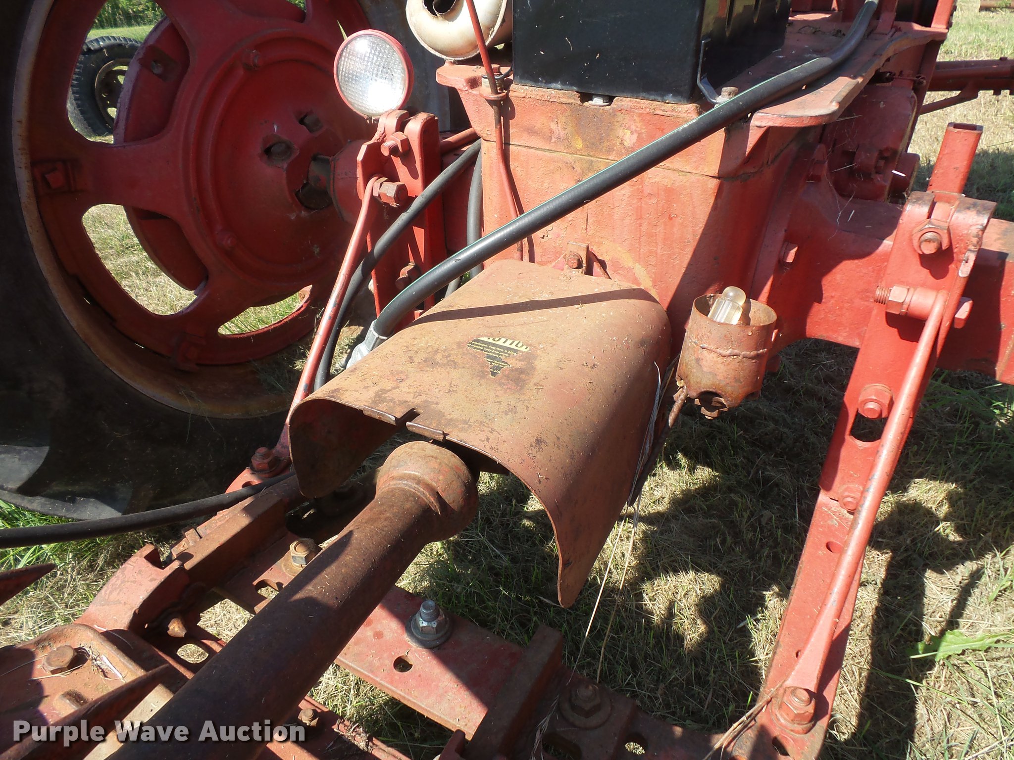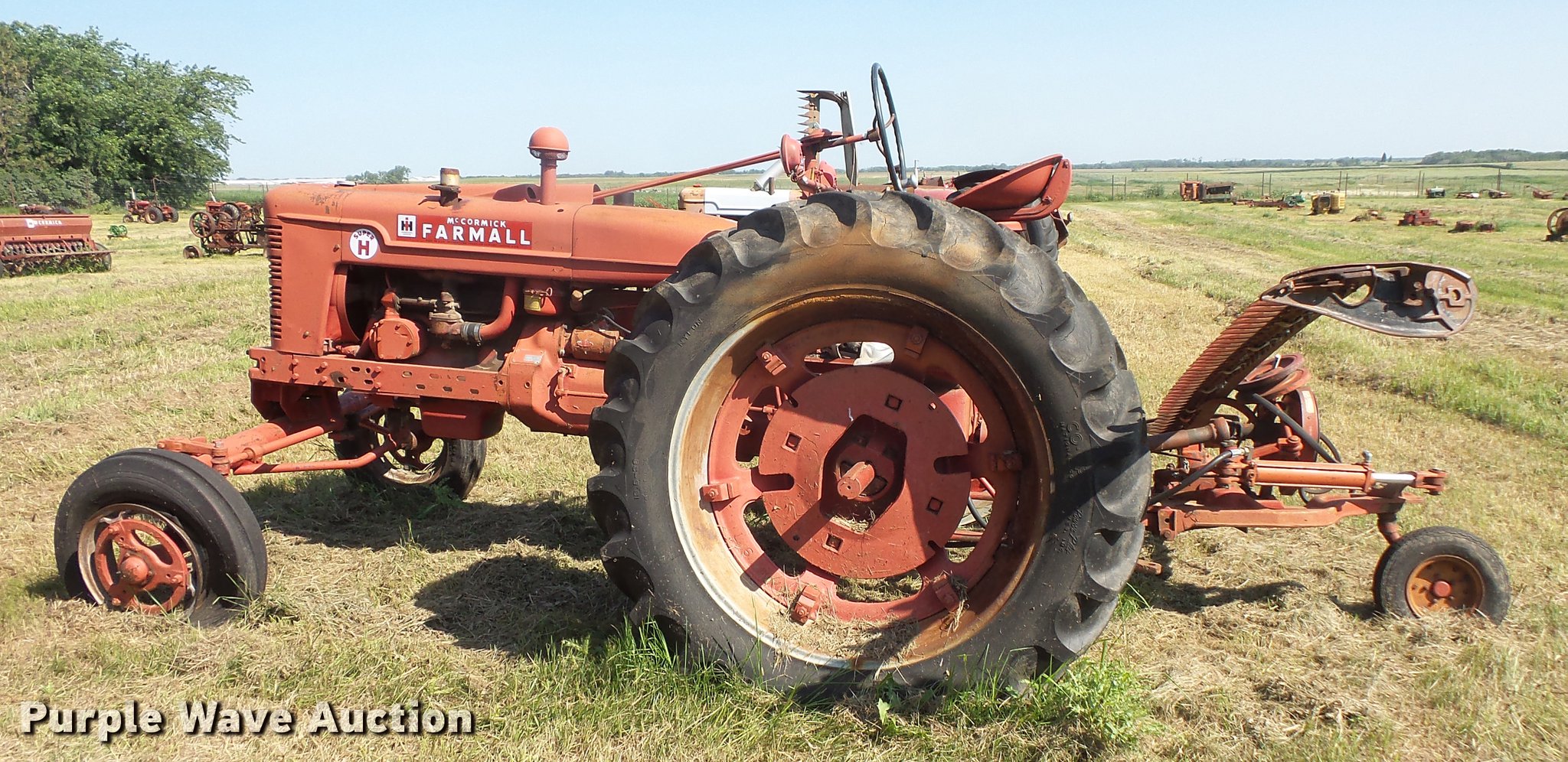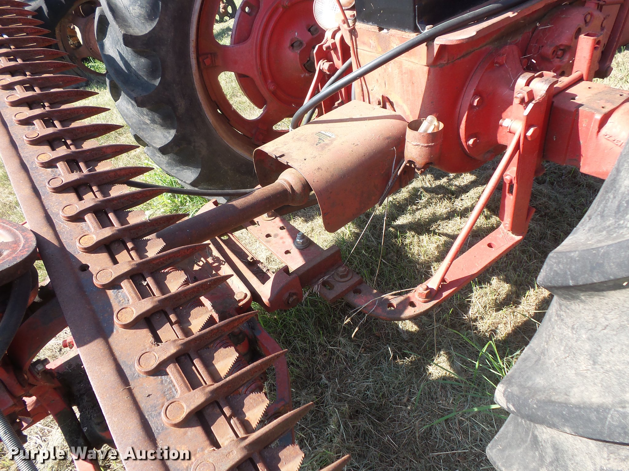 Purple Wave is selling a used Tractor in South Dakota. This item is a Farmall Super H tractor with the following: Four cylinder gas engine, Manual transmission, 5F-1R gears, 540 PTO, International sickle mower, 9'W, Wheel weights, 8.00-16 front tires, 13.6-38 rear tires, Engine stuck, Non-operational, Serial 26479J