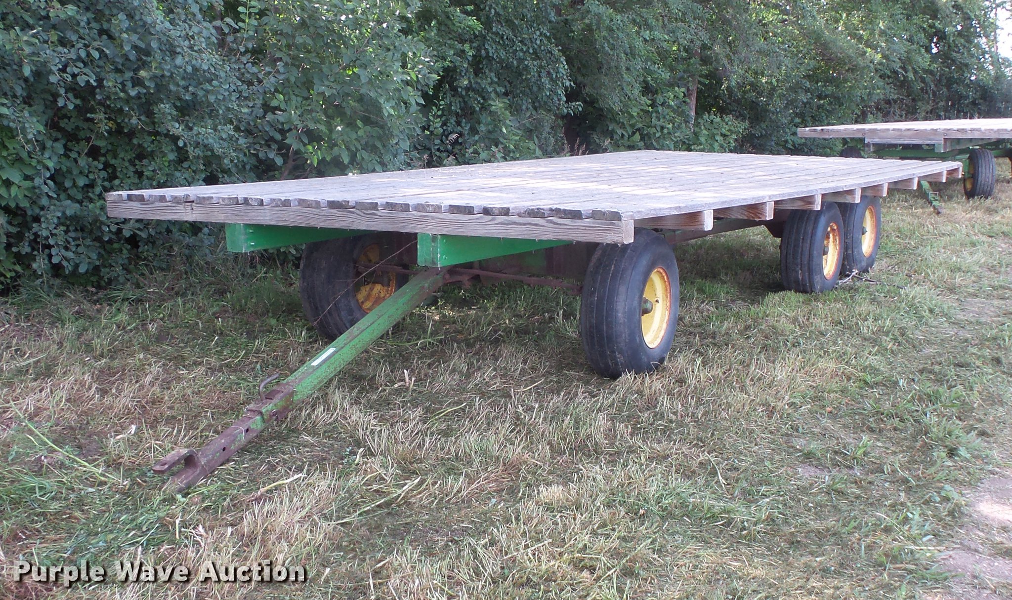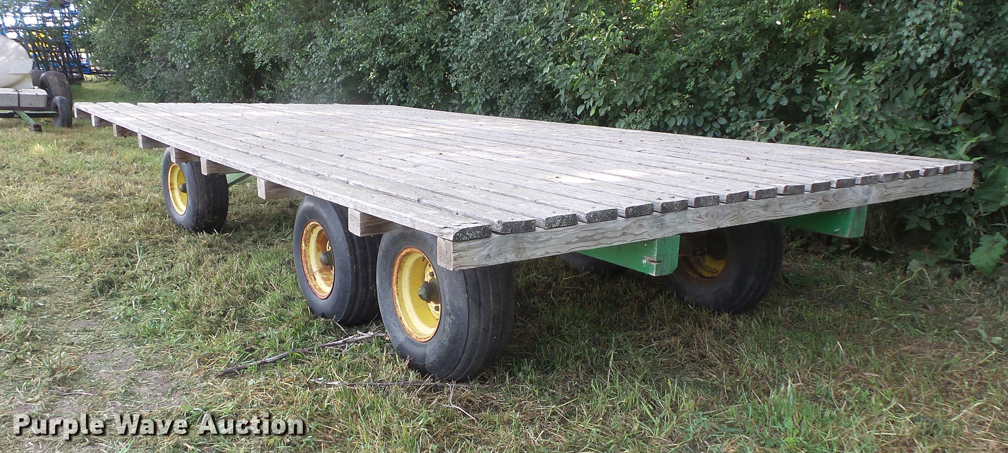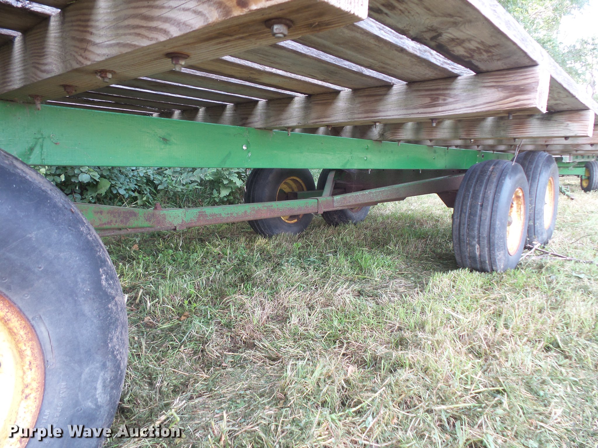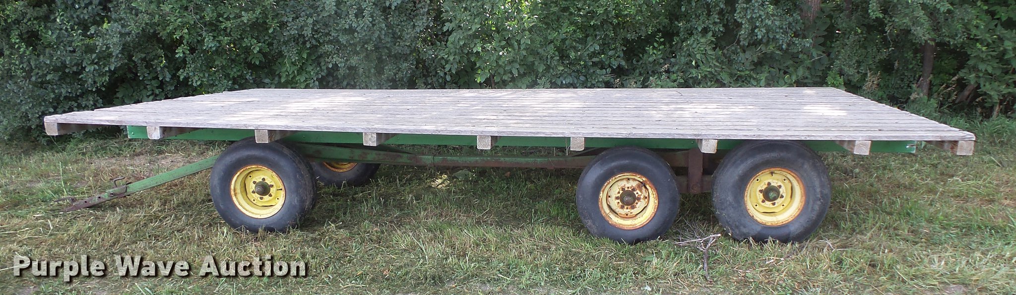 Purple Wave is selling a used Hay Handling in South Dakota. This item is a Hay wagon with the following: 20'L x 10'W, Adjustable tongue, John Deere running gear, Pin hitch, Beam suspension, Tandem axle, 12.5L-15 tires