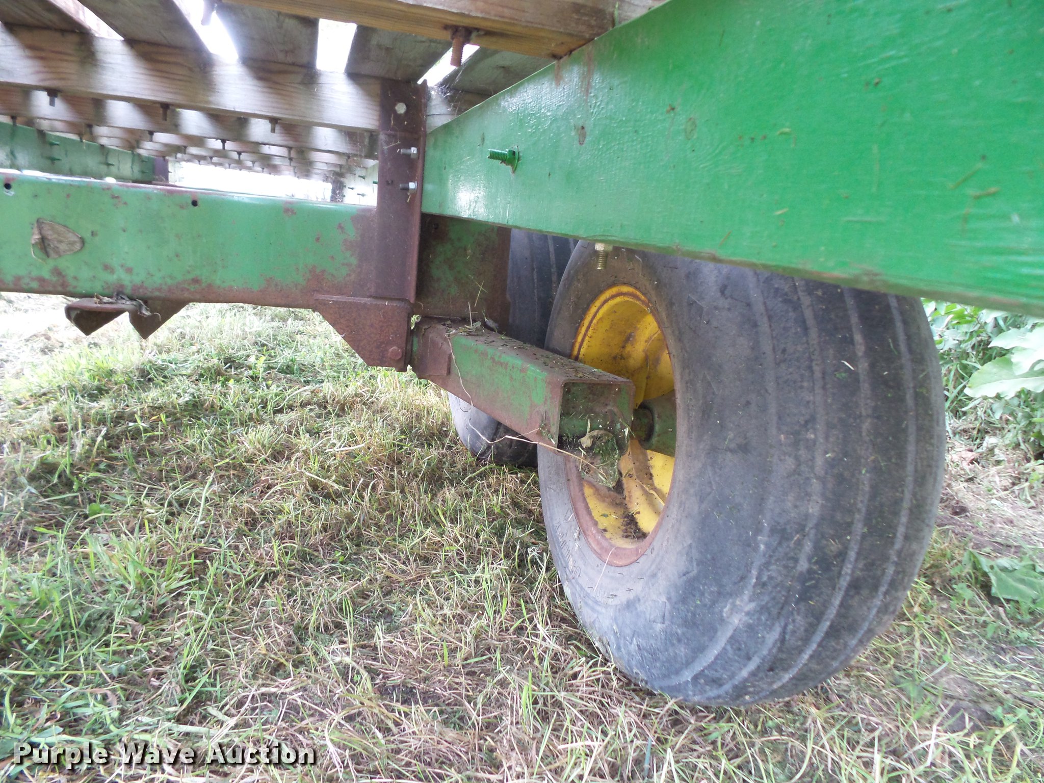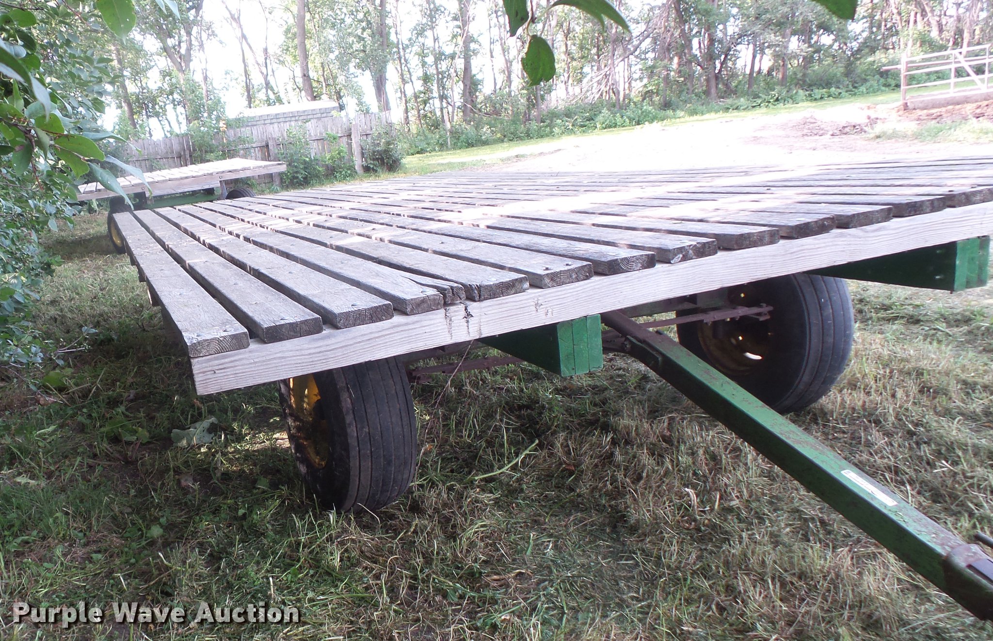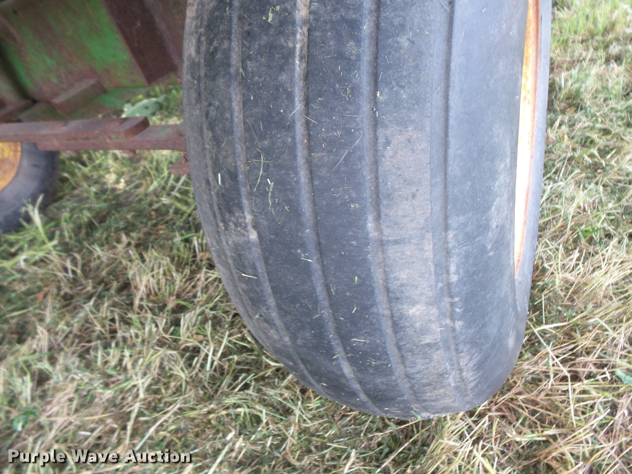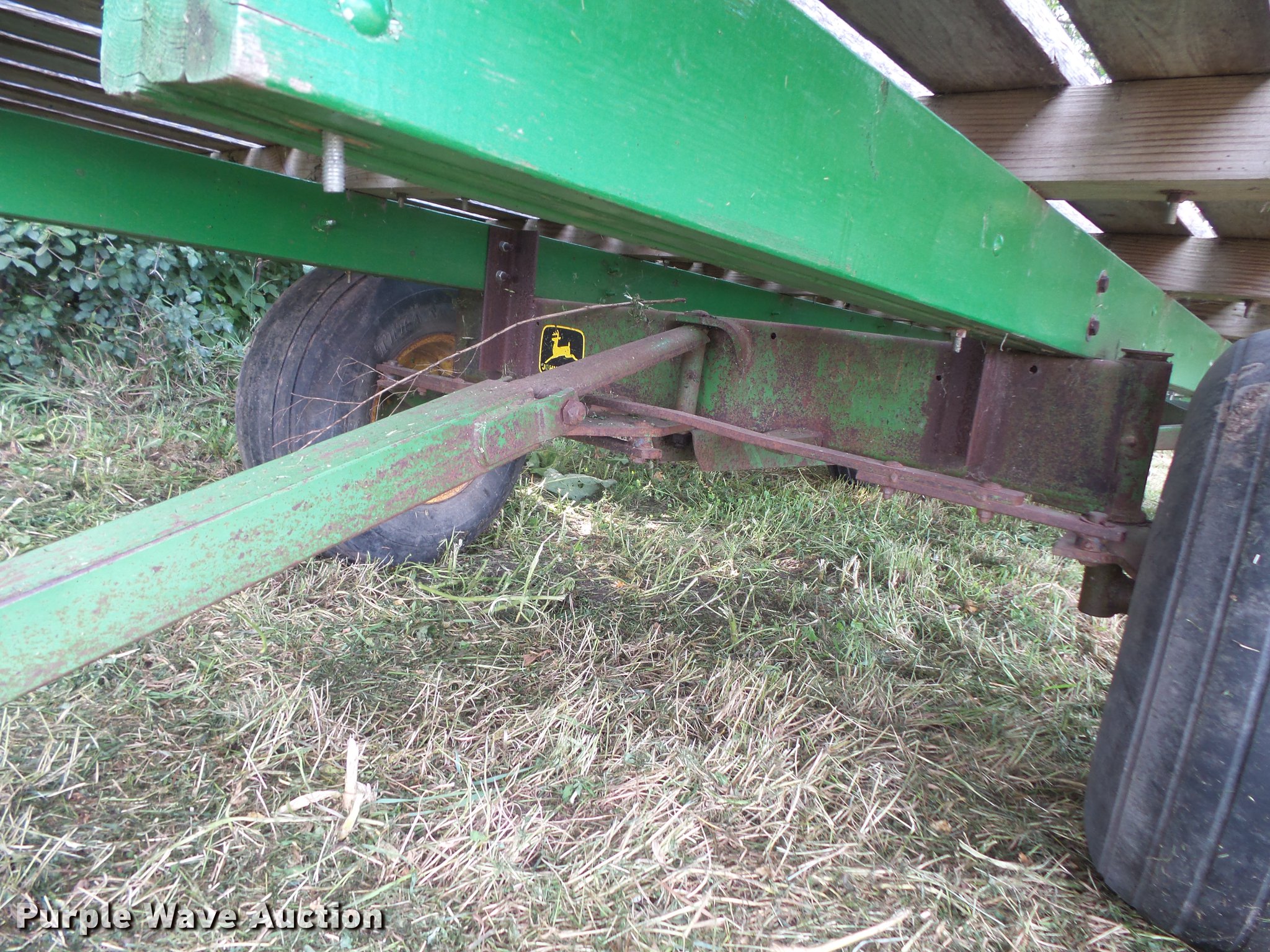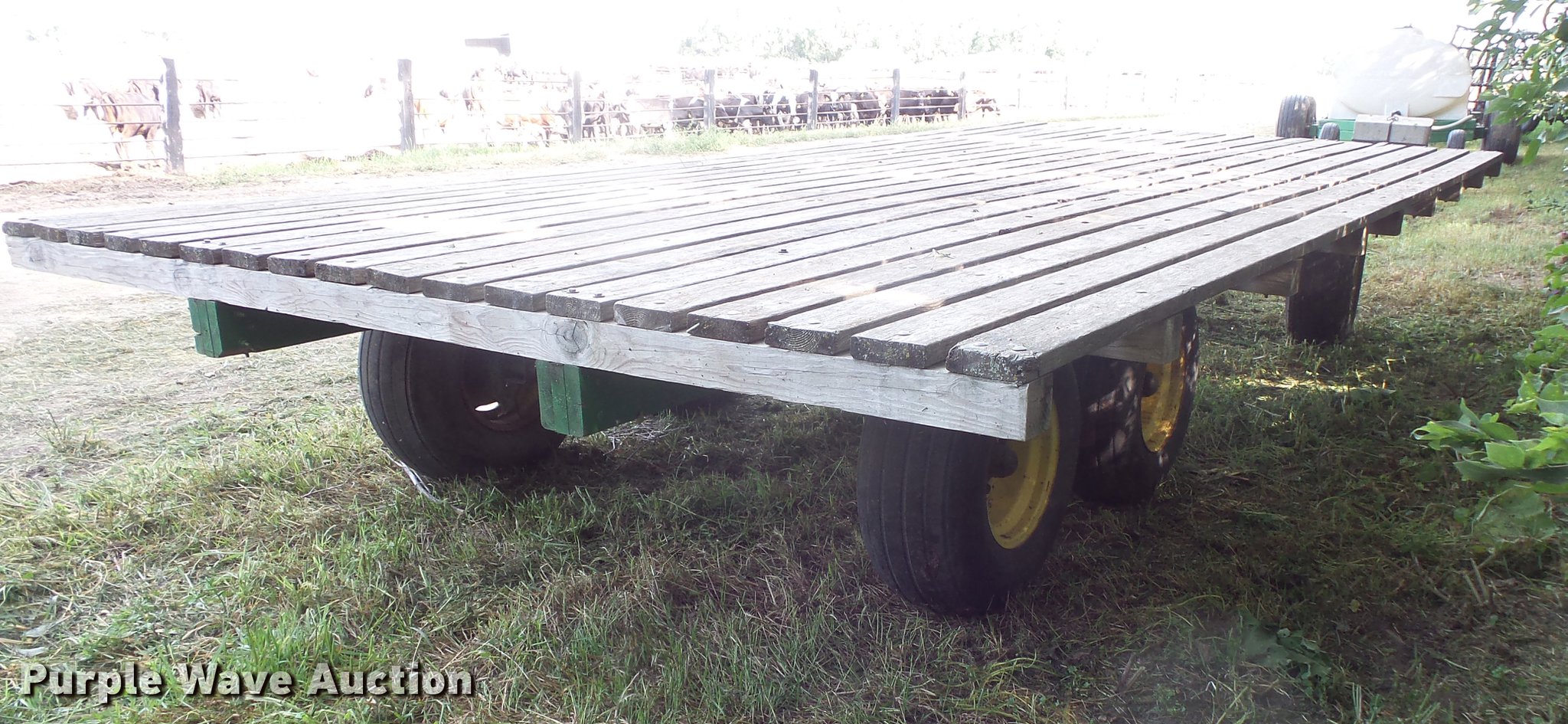 Purple Wave is selling a used Hay Handling in South Dakota. This item is a Hay wagon with the following: 20'L x 10'W, Adjustable tongue, John Deere running gear, Pin hitch, Beam suspension, Tandem axle, 12.5L-15 tires