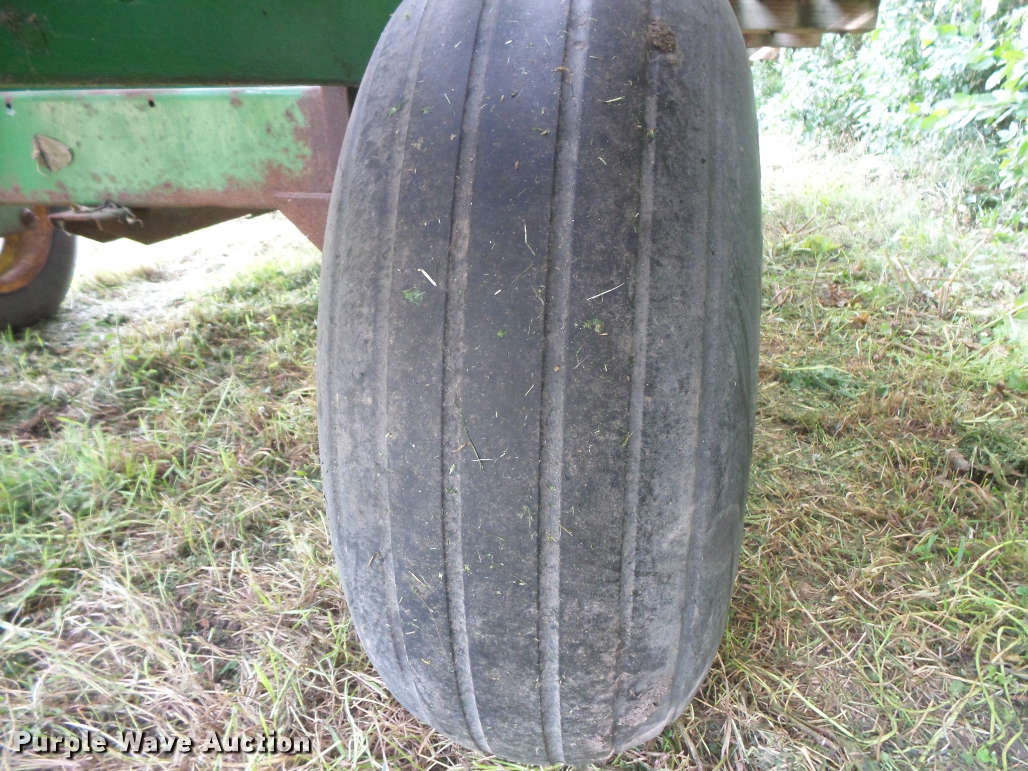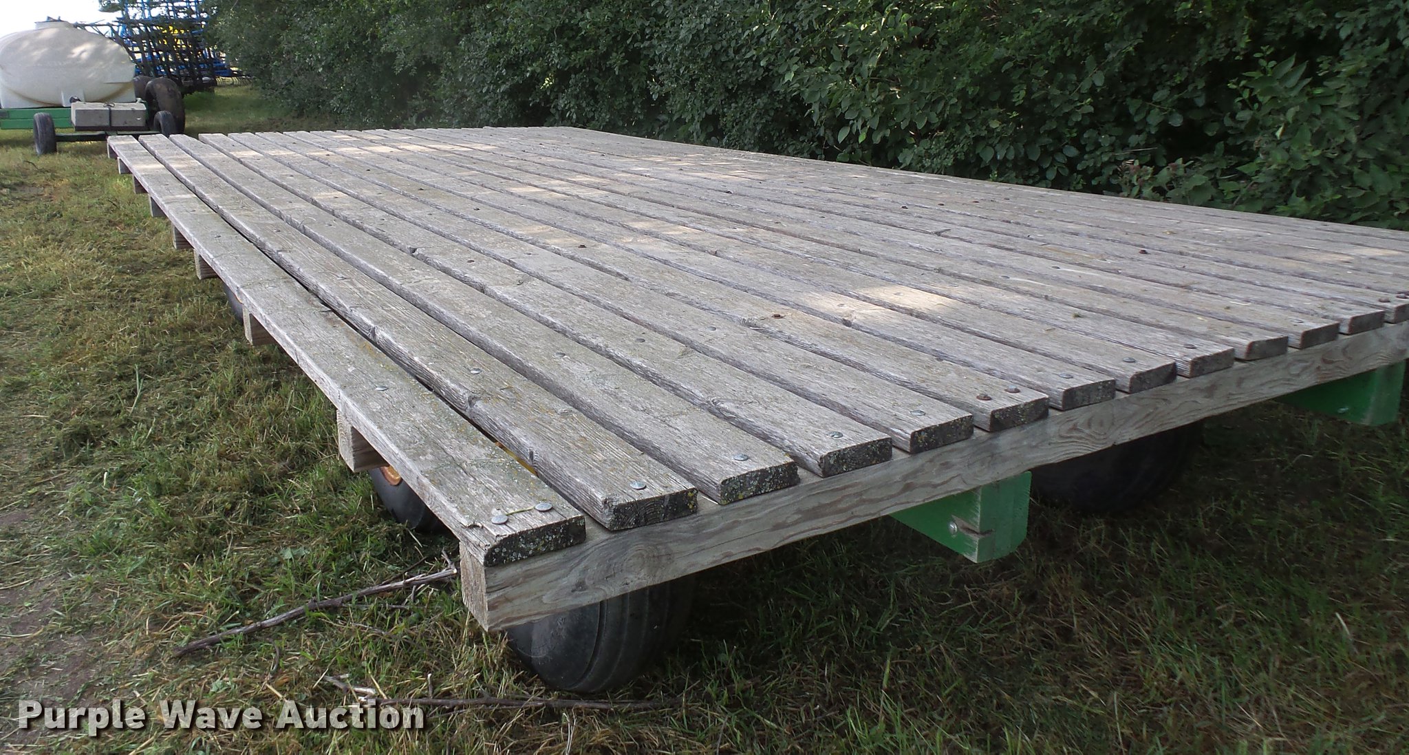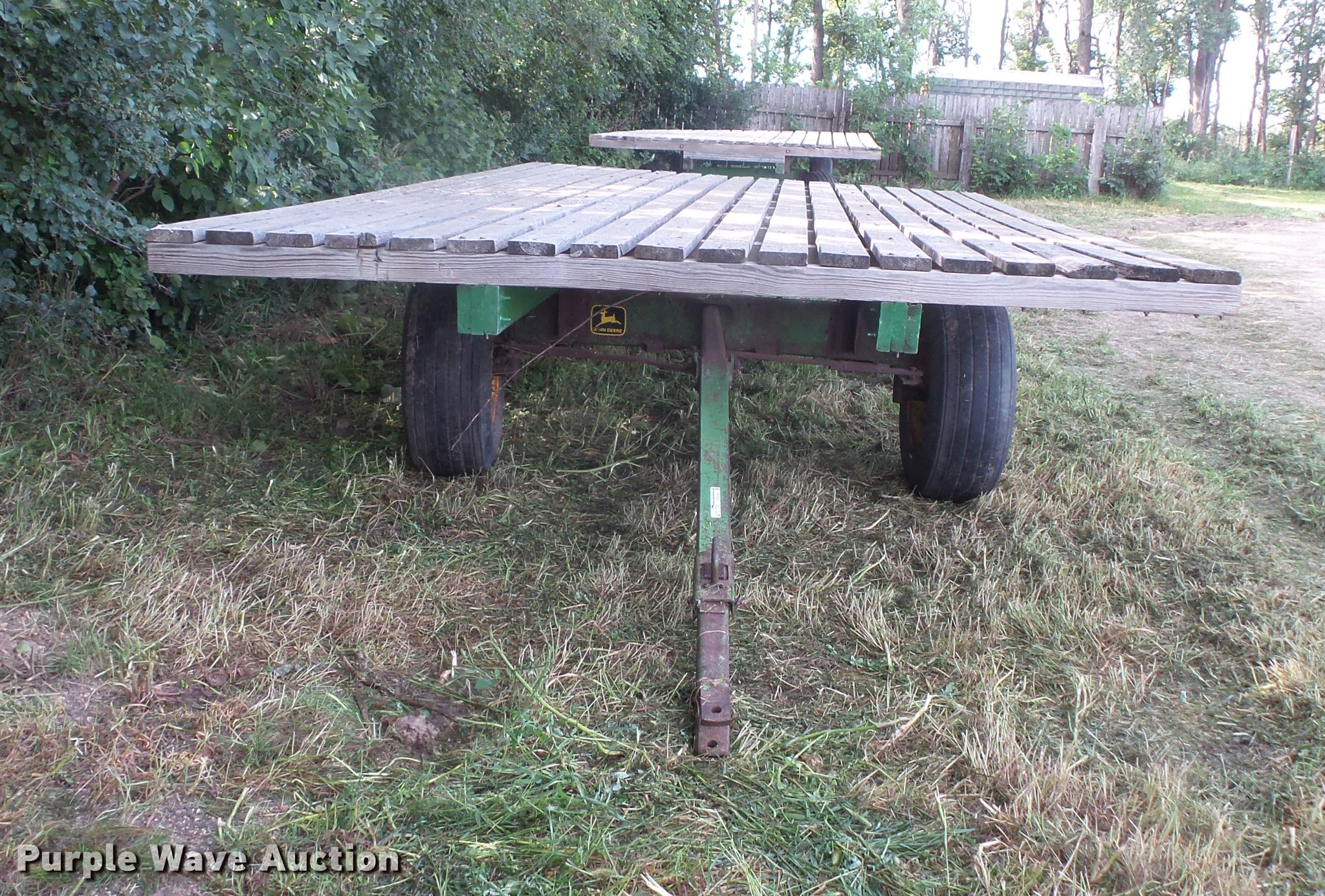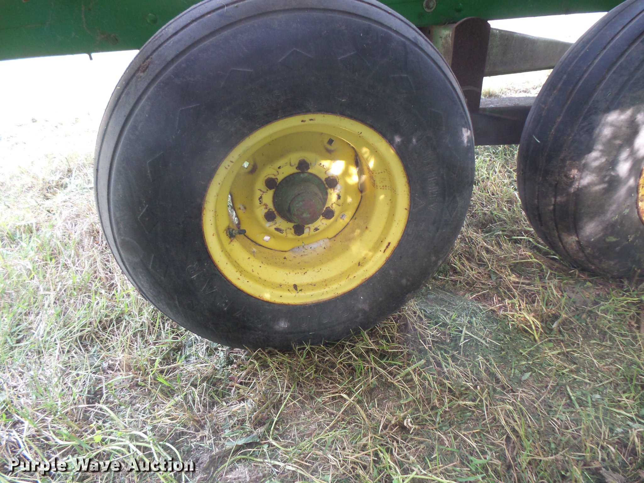 Purple Wave is selling a used Hay Handling in South Dakota. This item is a Hay wagon with the following: 20'L x 10'W, Adjustable tongue, John Deere running gear, Pin hitch, Beam suspension, Tandem axle, 12.5L-15 tires
