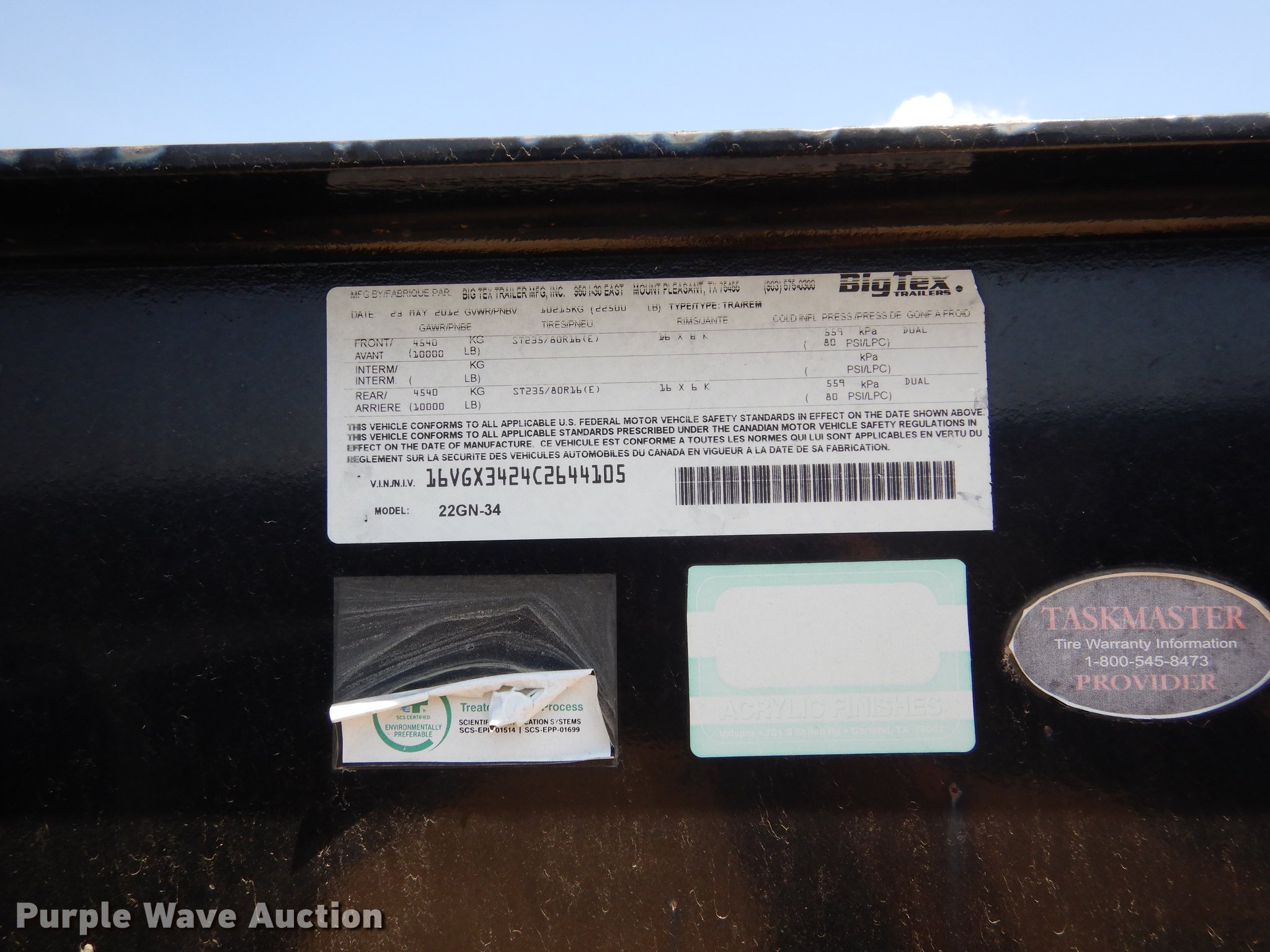 Purple Wave is selling a used Equip. Trailer in Texas. This item is a 2012 Big Tex 22GN-34 equipment trailer with the following: 44'L x 102"W overall, 34'L wood deck, Stake pockets, Toolbox, Gooseneck hitch, Dual leg landing gear, Spring suspension, Air brakes, Tandem axle, Steel wheels, ST235/80R16 tires, GVWR 22,500 lbs, Unit# T156