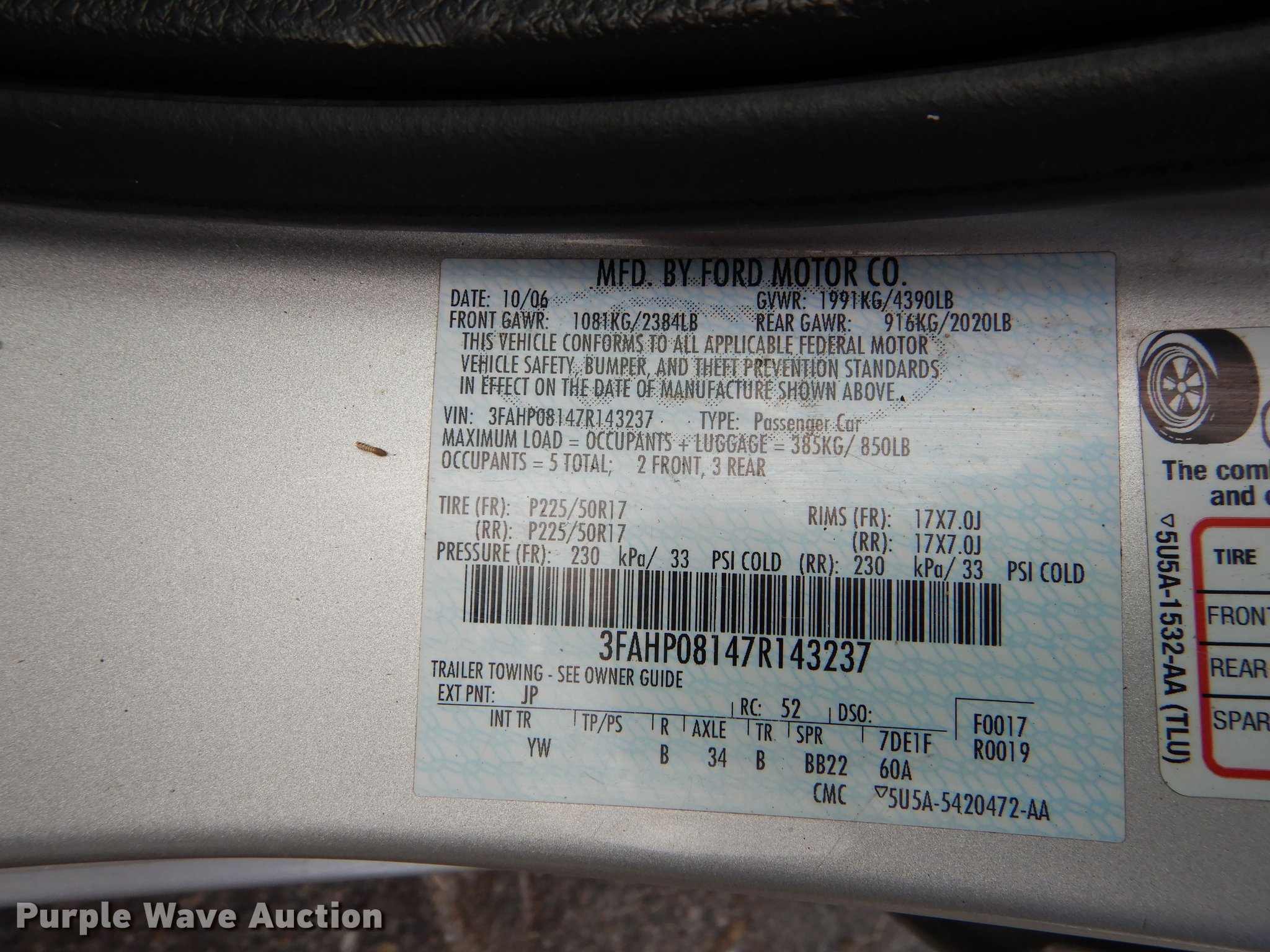 Purple Wave is selling a used Passenger Vehicle in Kansas. This item is a 2007 Ford Fusion SEL with the following: 202,878 miles on odometer, 3.0L V6 DOHC 24V gas engine, Automatic transmission, AC and heat, Tilt, Cruise, AM/FM/CD, Power windows, locks, mirrors, and seat, Heated mirrors, Leather interior, Fog lights, Power sunroof, Continental 215/55R17 tires