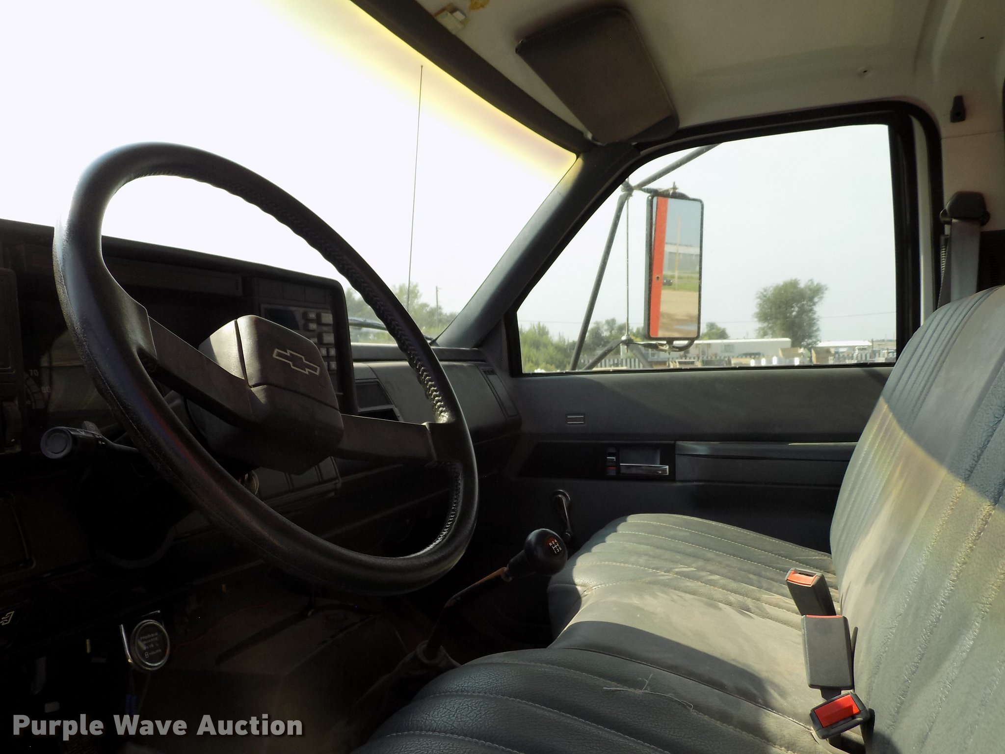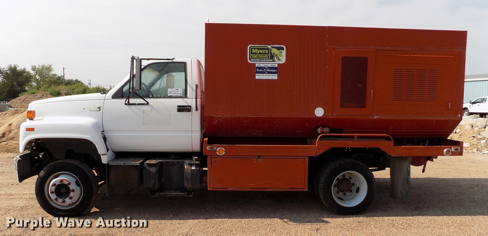 Purple Wave is selling a used Truck Chassis in Kansas. This item is a 1991 Chevrolet Kodiak C6500 sewer jetter truck with the following: 6,497 miles on odometer, 6.0L V8 gas engine, Five speed manual transmission, Single axle, Heat, AM/FM, Myers high velocity sewer cleaner, Ford 4.9L six cylinder gas engine, 5,106 hours on meter, Hose splitting, Radiator needs replaced, Dual fuel tanks, Mud flaps, Spring suspension, Hydraulic brakes, 225/70R19.5 tires, GVWR 20,680 lbs