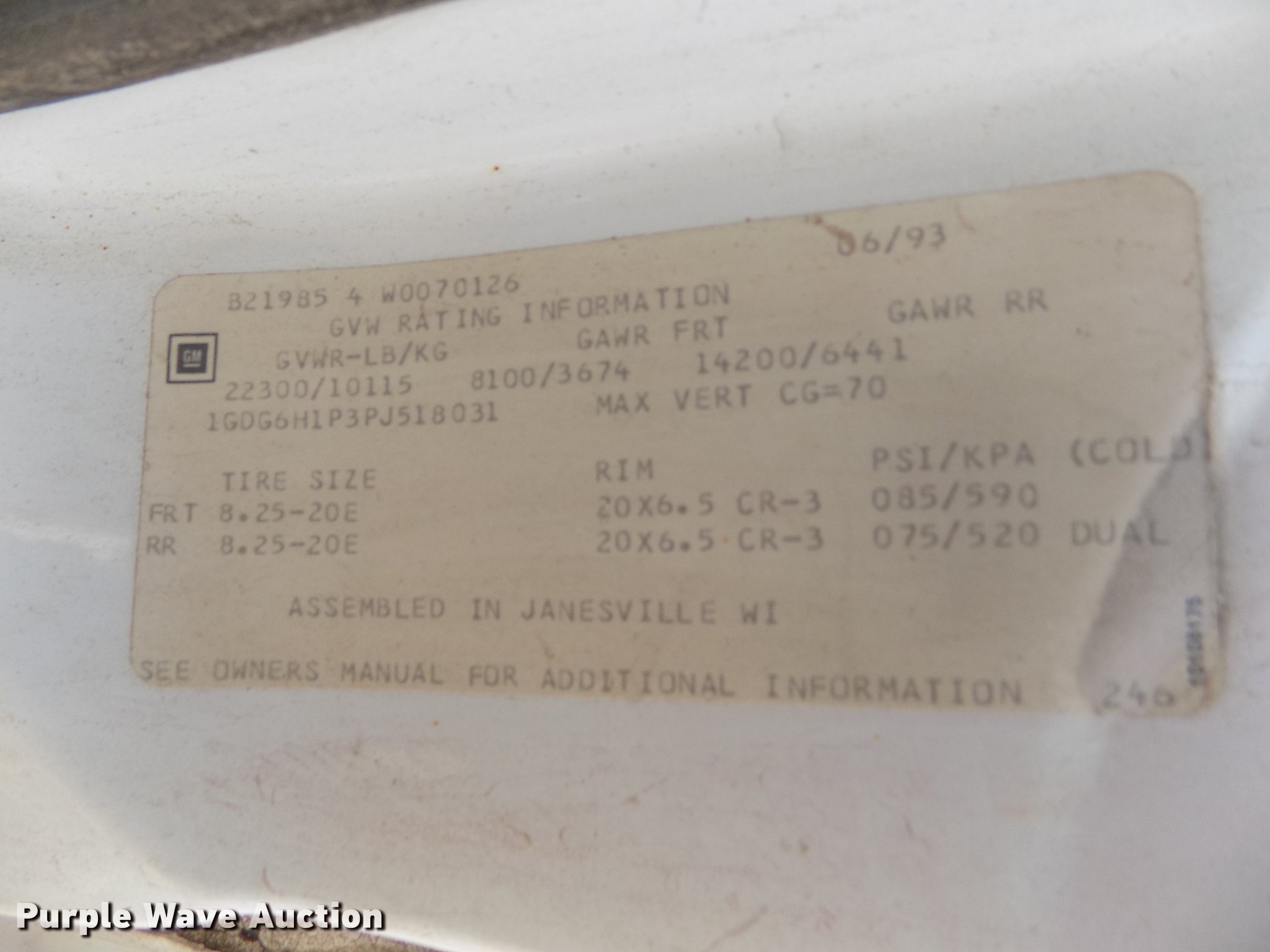 1993 GMC TopKick dump truck. 64,481 miles on odometer, 6.0L V8 gas engine, Five speed manual transmission, Steerable lift axle, Heat, AM/FM, PTO, 15.5'L x 92"W steel dump bed 17" side board height, Single ram hoist, Single fuel tank, Spring suspension, Hydraulic brakes, 9.00-20 tires, GVWR 22,300 lbs, FAWR 8,100 lbs, RAWR 14,200 lbs, Windshield cracked, Hydraulic pump weak Will not lift loaded bed. Kansas title. 1GDG6H1P3PJ518031. City of Ulysses. 409 W Miller. Ulysses, KS 67880