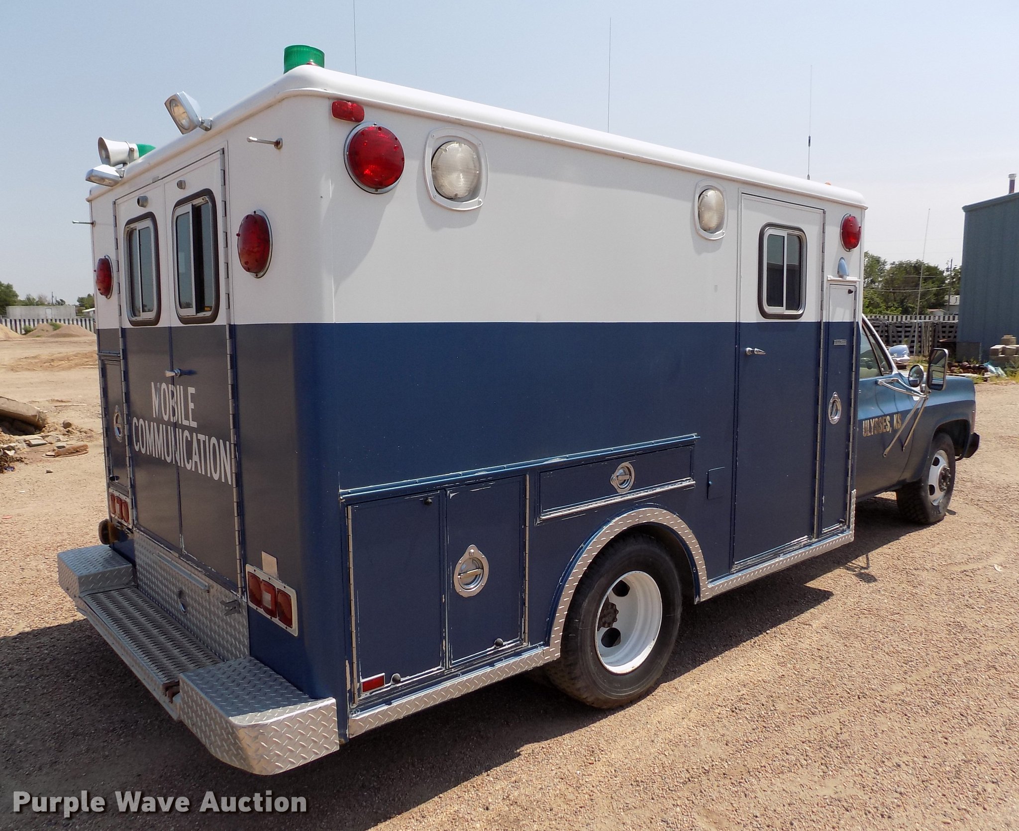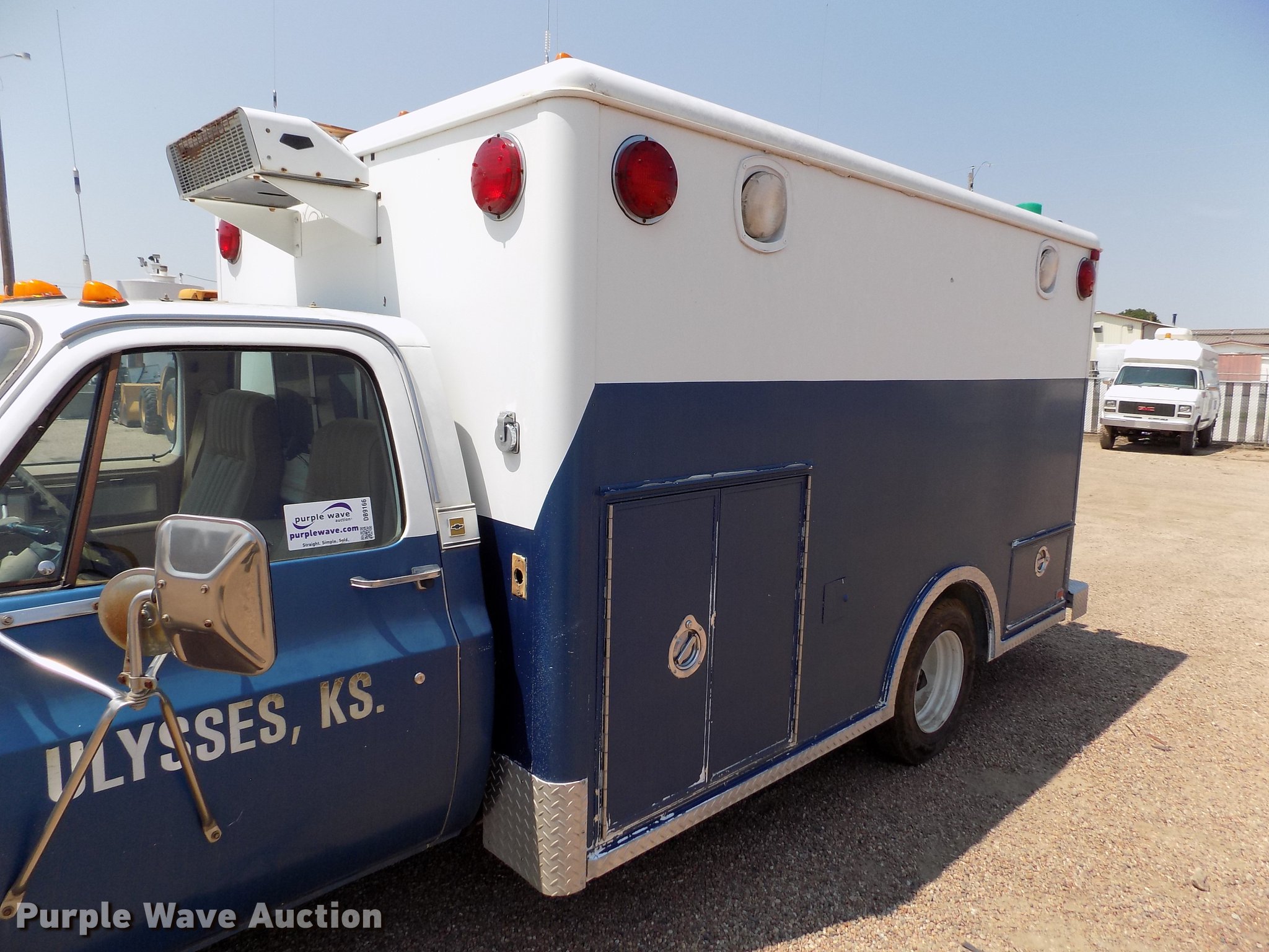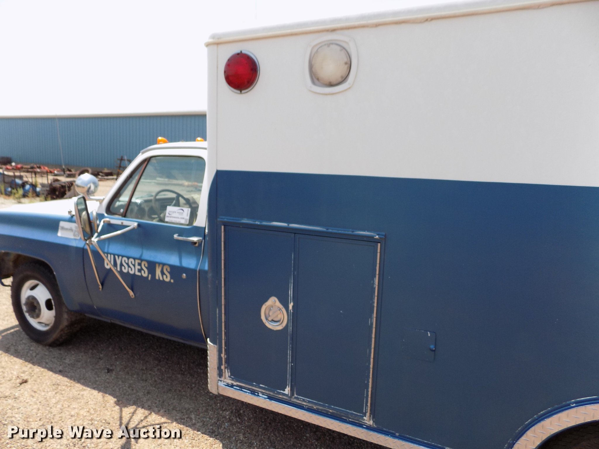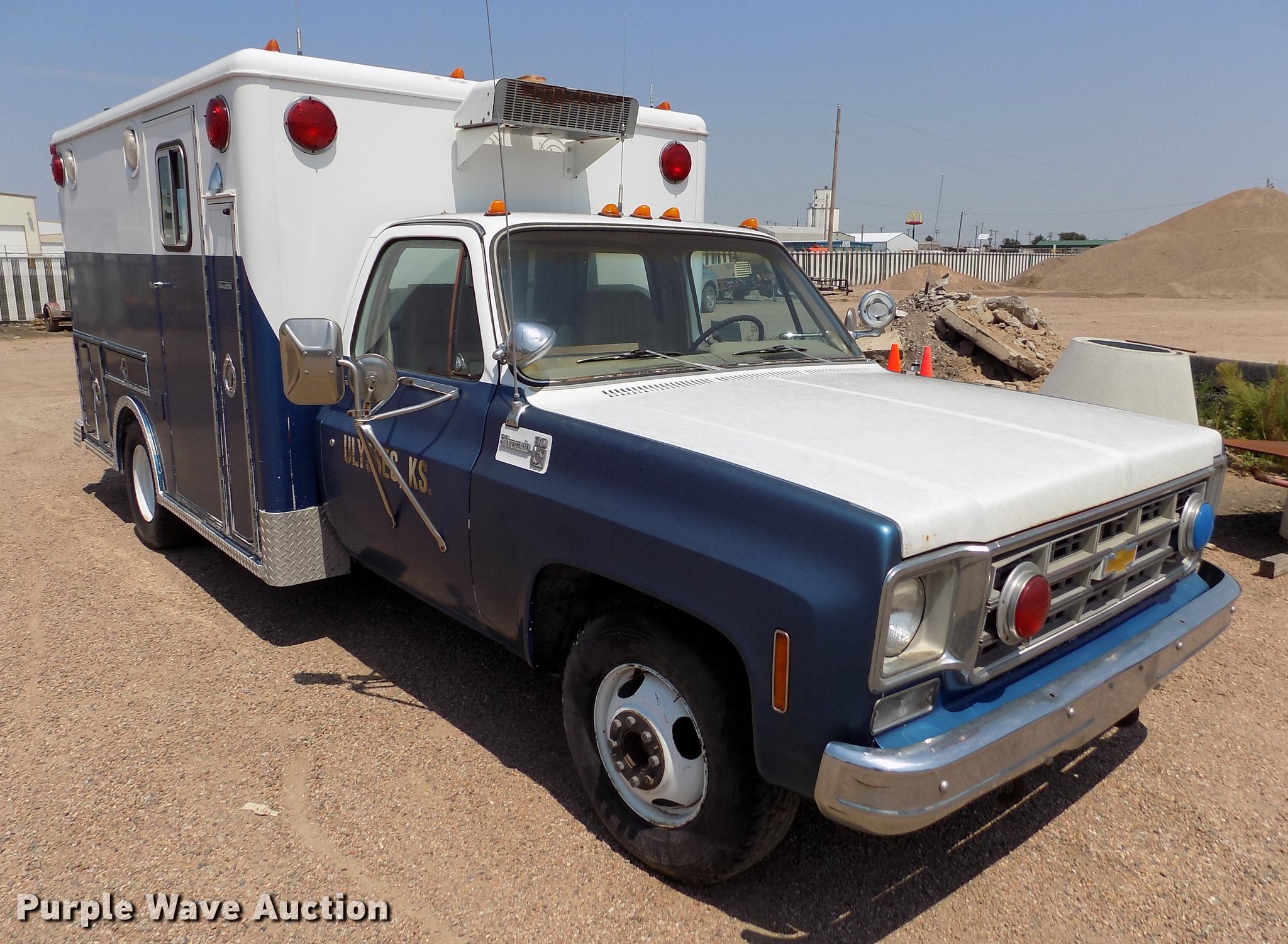 Purple Wave is selling a used Fire Truck or Emergency Vehicle in Kansas. This item is a 1978 Chevrolet C30 ambulance with the following: 48,430 miles on odometer, 7.4L V8 gas engine, Automatic transmission, AC and heat, Cruise, AM/FM, Manual windows and locks, Vinyl interior, Yankee Coach body, Front tow hook, 9.5R16.5 tires, Unknown operating condition, Parts missing