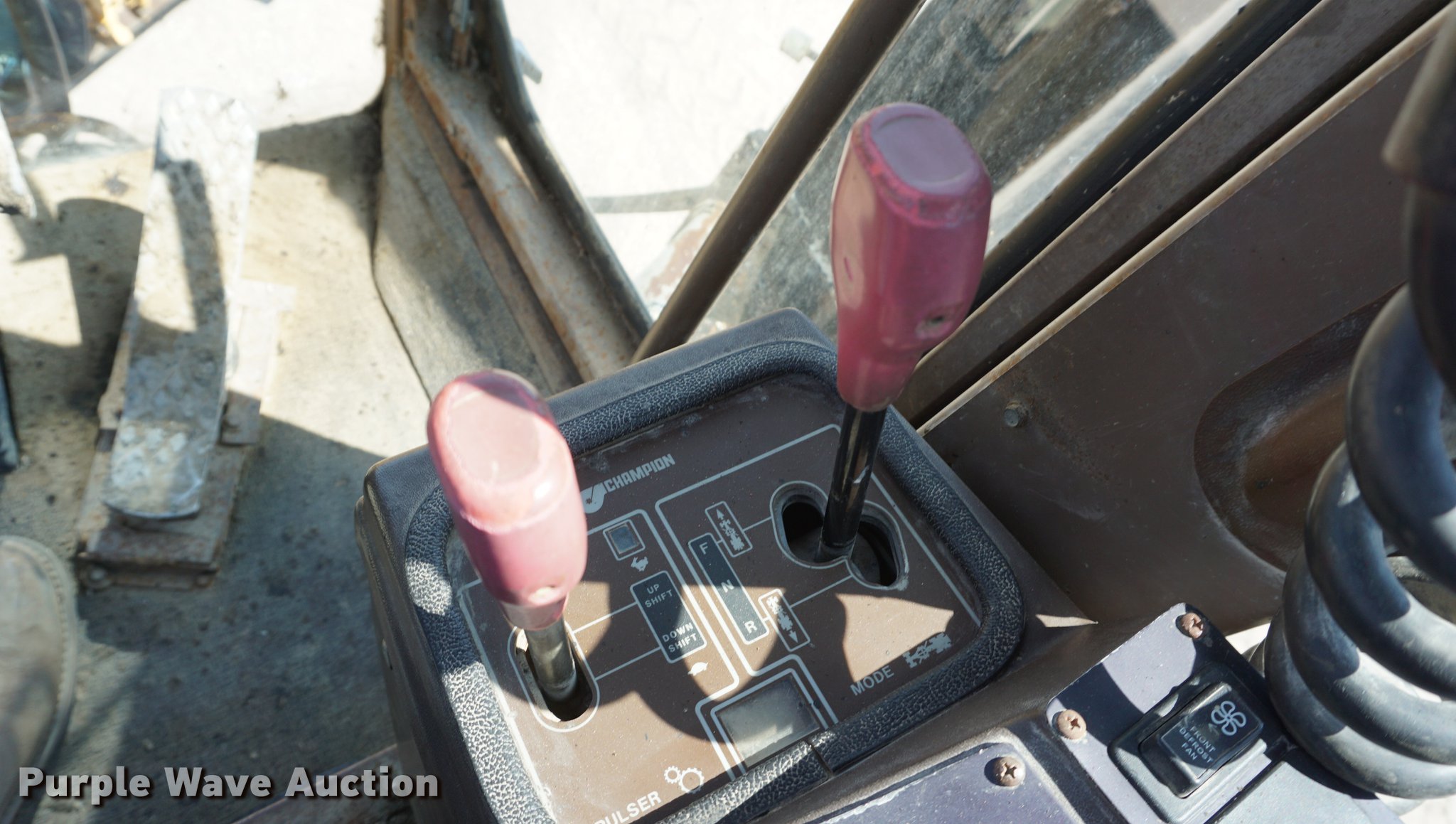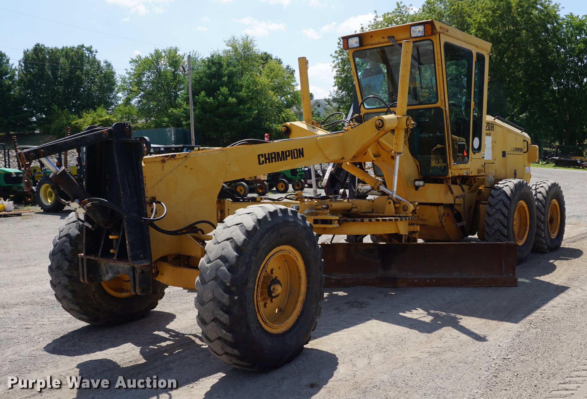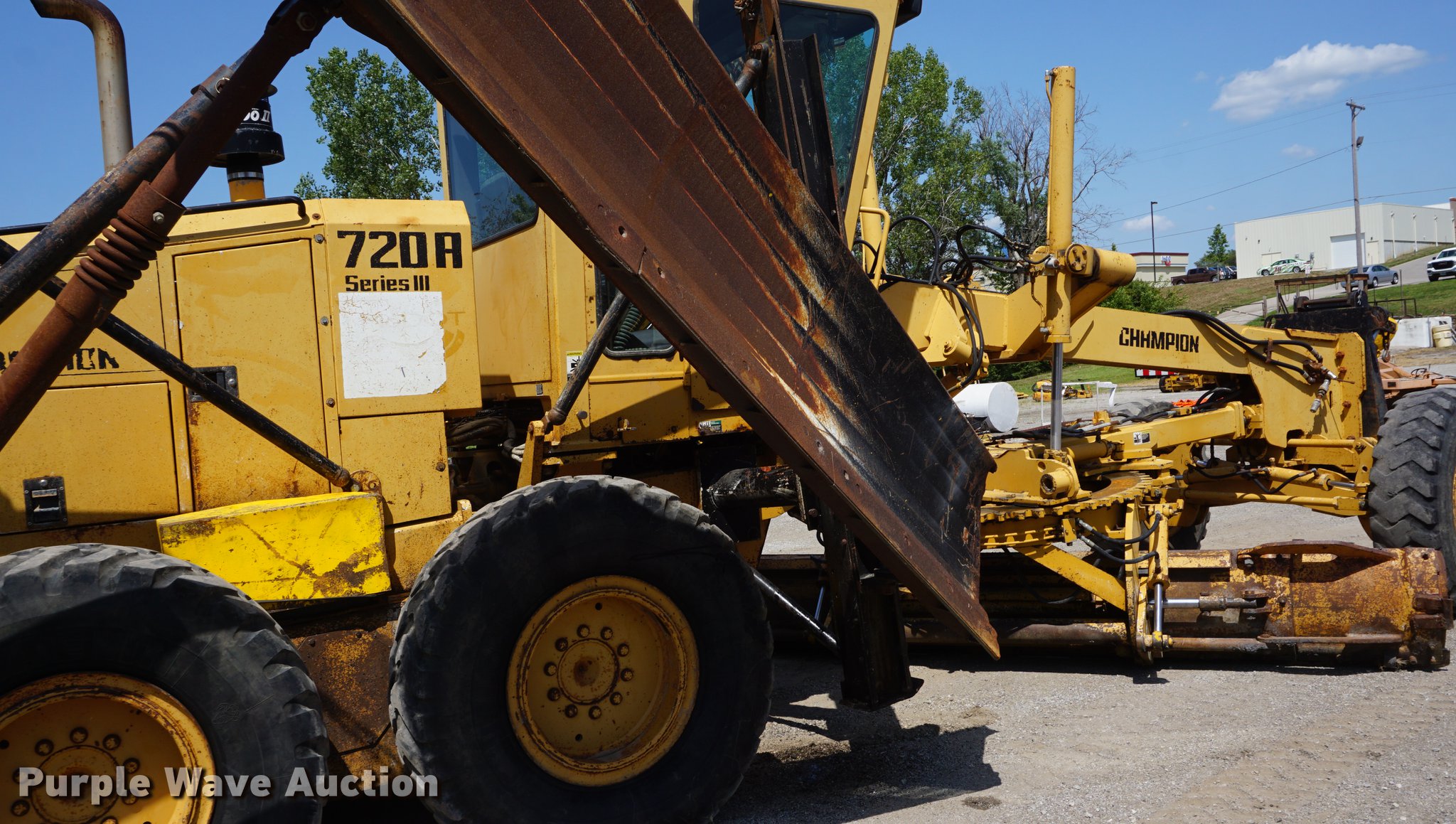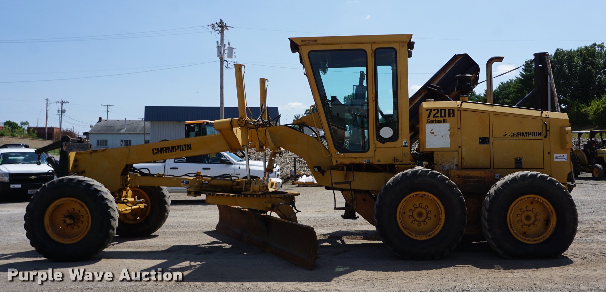 Purple Wave is selling a used Motor Grader in Missouri. This item is a 1995 Champion 720A Series III motor grader with the following: 3,785 hours on meter, 5,181 total hours, Cummins 8.3L six cylinder turbo diesel engine, 160 HP, Powershift transmission, 8F-4R gears, EROPS/enclosed cab, Heat, Suspension seat, Front work lights, Eight hydraulic control valves, 14'W moldboard, Tip control, Side shift, Right blade extension, Front mounted lift group, Otis 12'W snow wing, 14.00R24 tires, Clutch slave cylinder leaks, Assorted leaks, Serial 024518