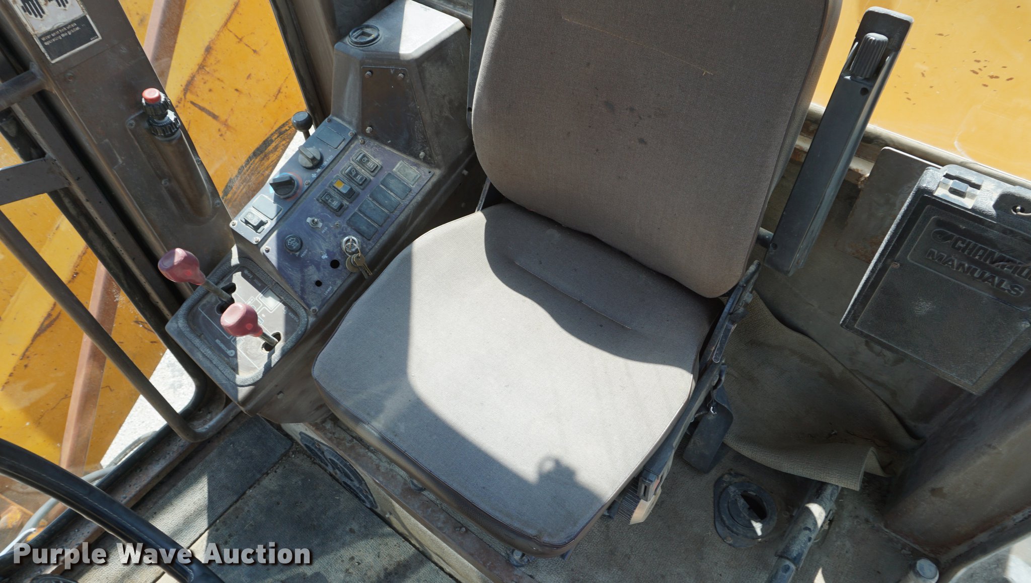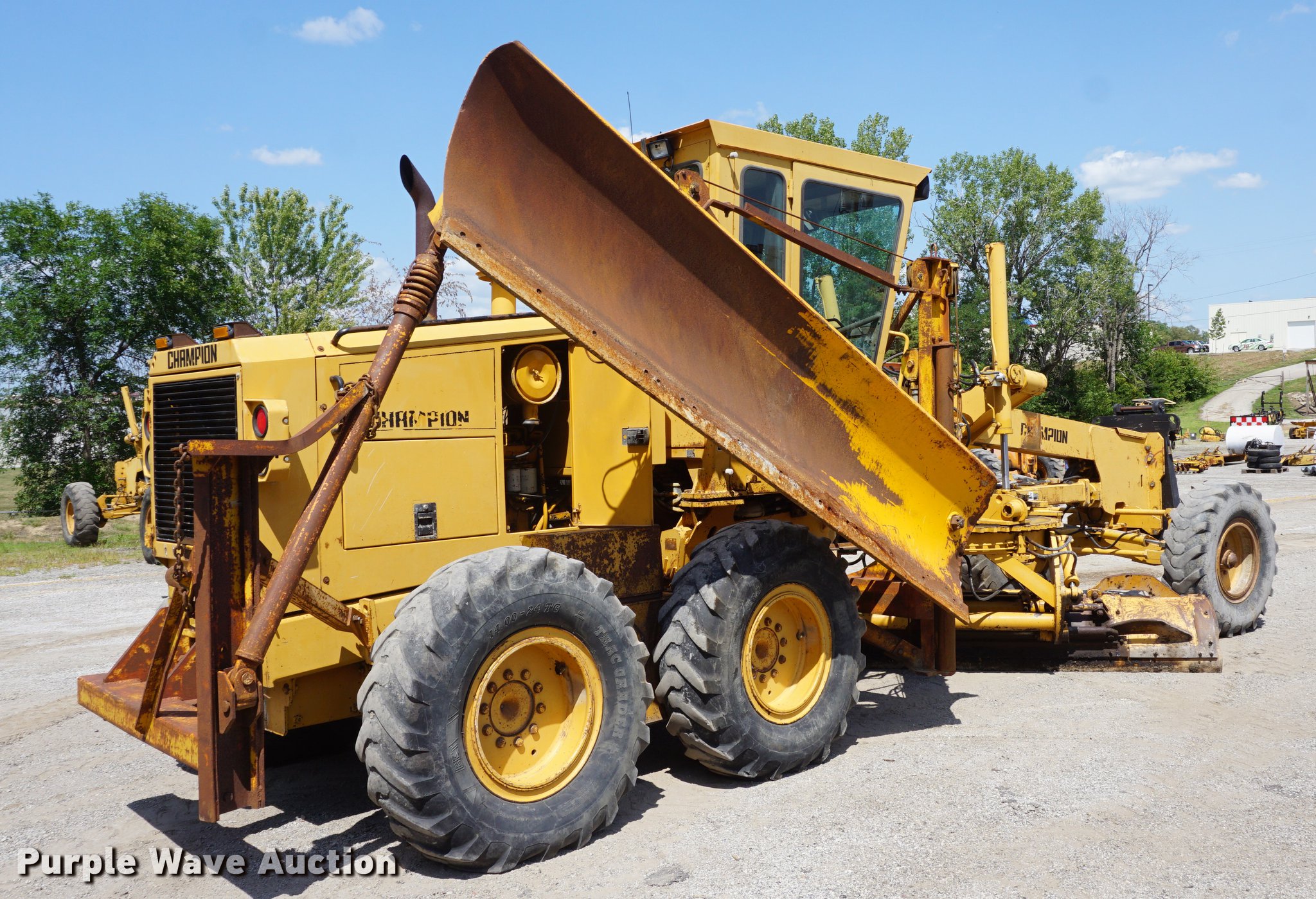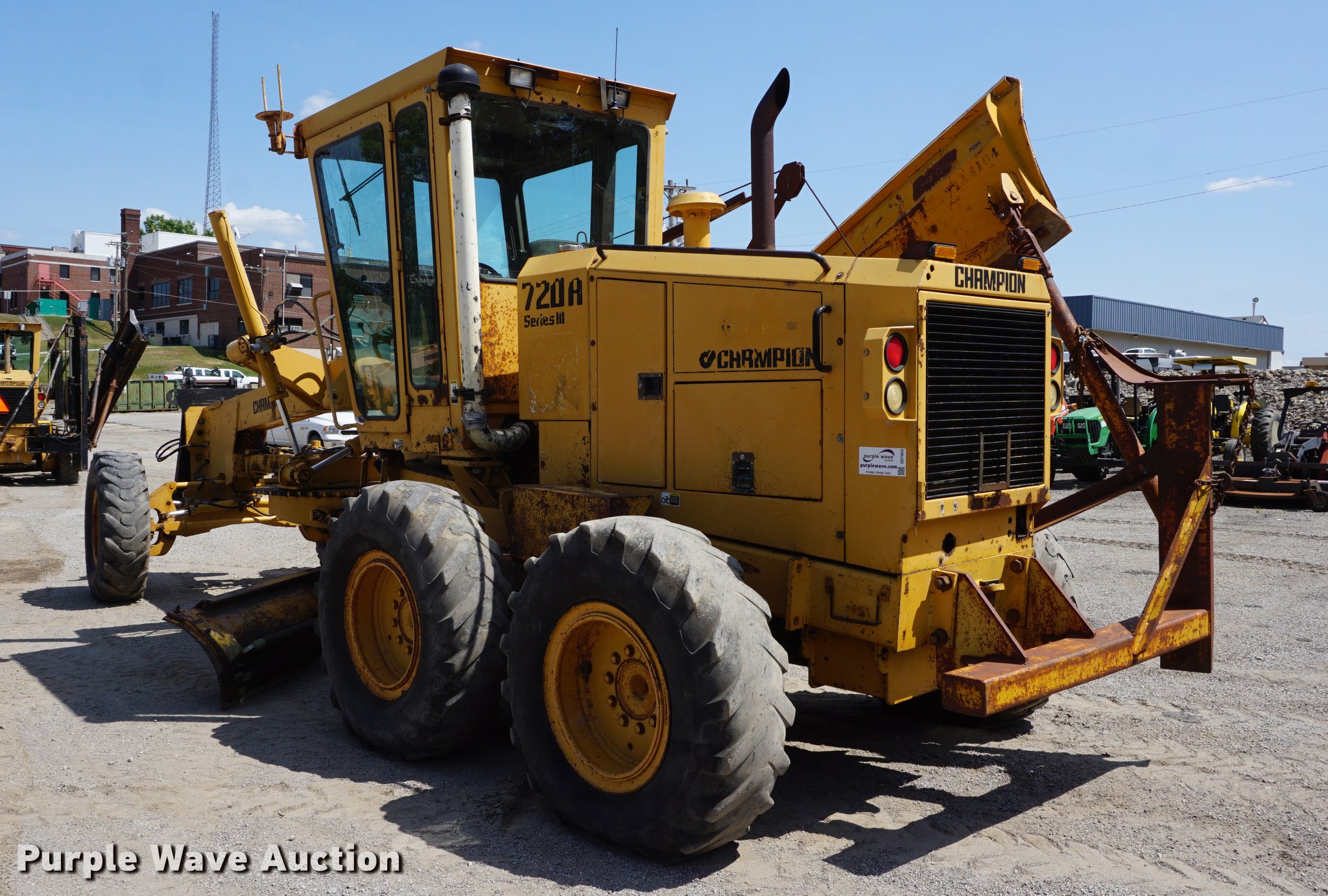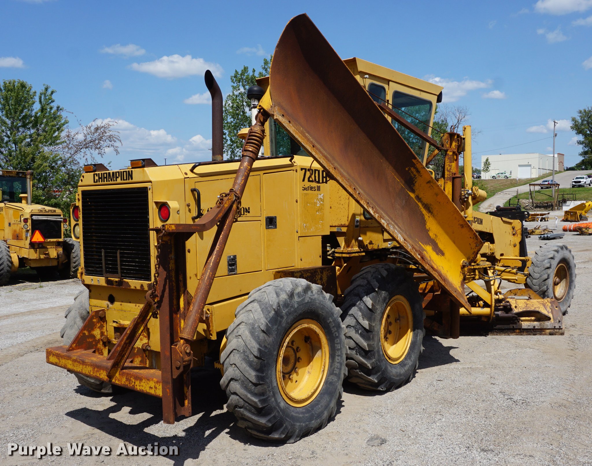 Purple Wave is selling a used Motor Grader in Missouri. This item is a 1995 Champion 720A Series III motor grader with the following: 6,584 hours on meter, Cummins 8.3L six cylinder turbo diesel engine, 160 HP, Powershift transmission, 8F-4R gears, EROPS/enclosed cab, Heat, Suspension seat, Front work lights, Eight hydraulic control valves, 14'W moldboard, Tip control, Side shift, Right blade extension, Front mounted lift group, 12'W snow wing, 14.00-24 tires, Pivot and circle lift cylinders leak, Serial 024511
