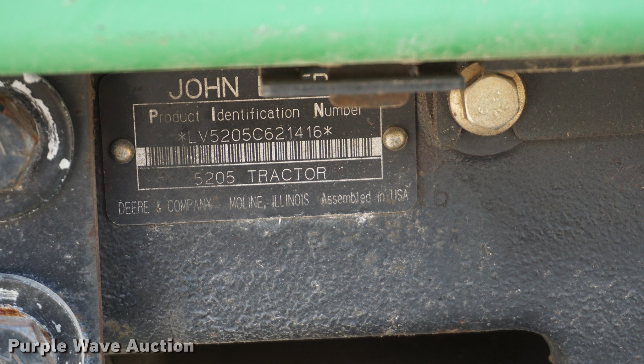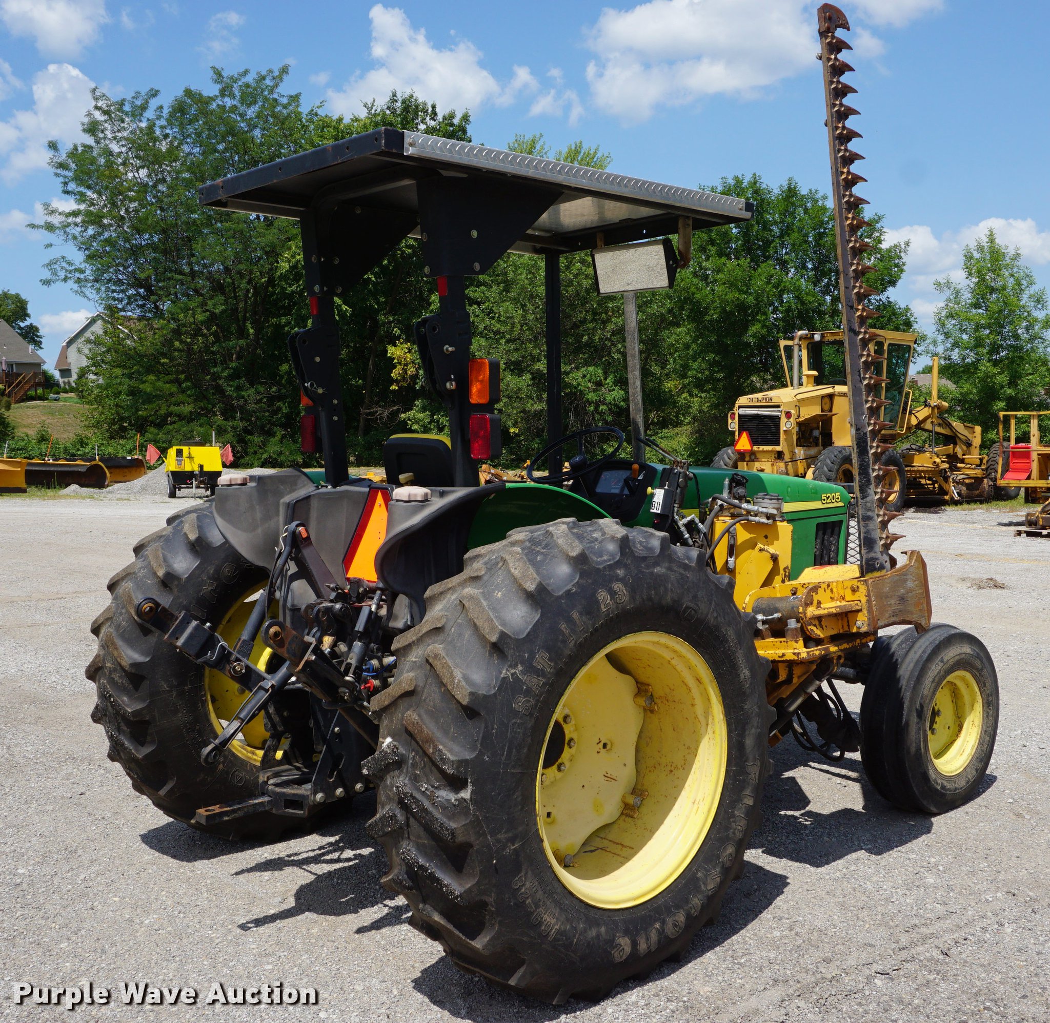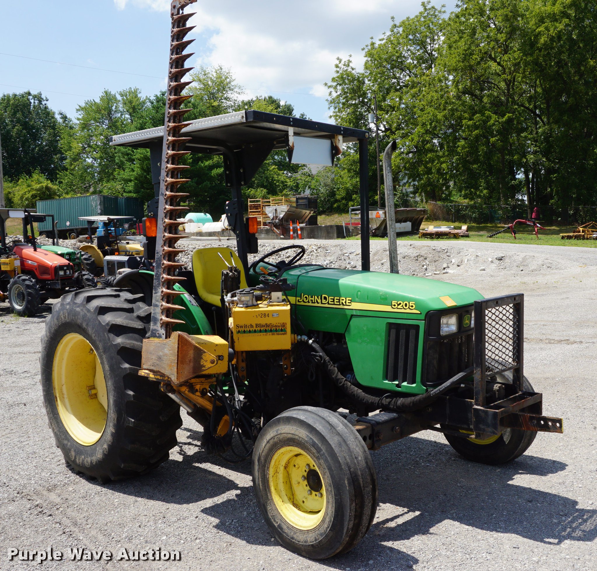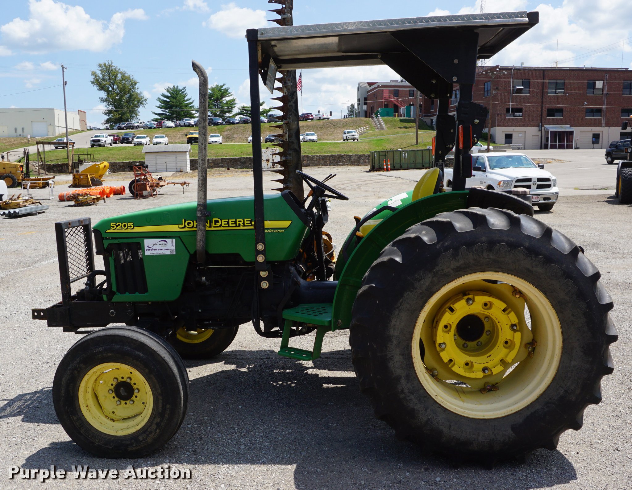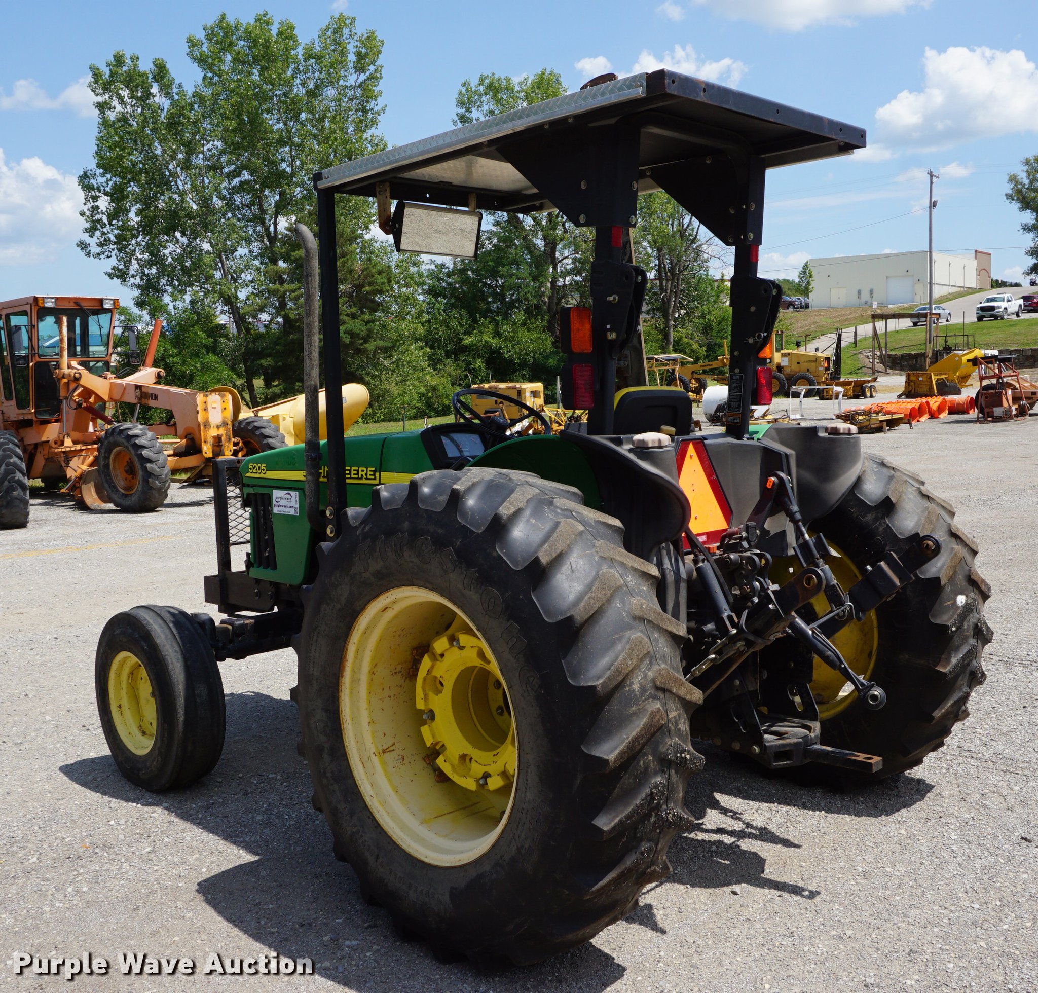 Purple Wave is selling a used Tractor in Missouri. This item is a 2005 John Deere 5205 tractor with the following: 1,472 hours on meter, John Deere 3029D 2.9L three cylinder diesel engine, 53 HP, Sync Reverser transmission, 8F-4R gears, Canopy, Suspension seat, Three point, Top link, 540 PTO, Rear hydraulic remote set, Front mounted hydraulic pump, 6'W sickle mower, 9.5L-15 front tires, 16.9-28 rear tires, Serial LV5205C621416