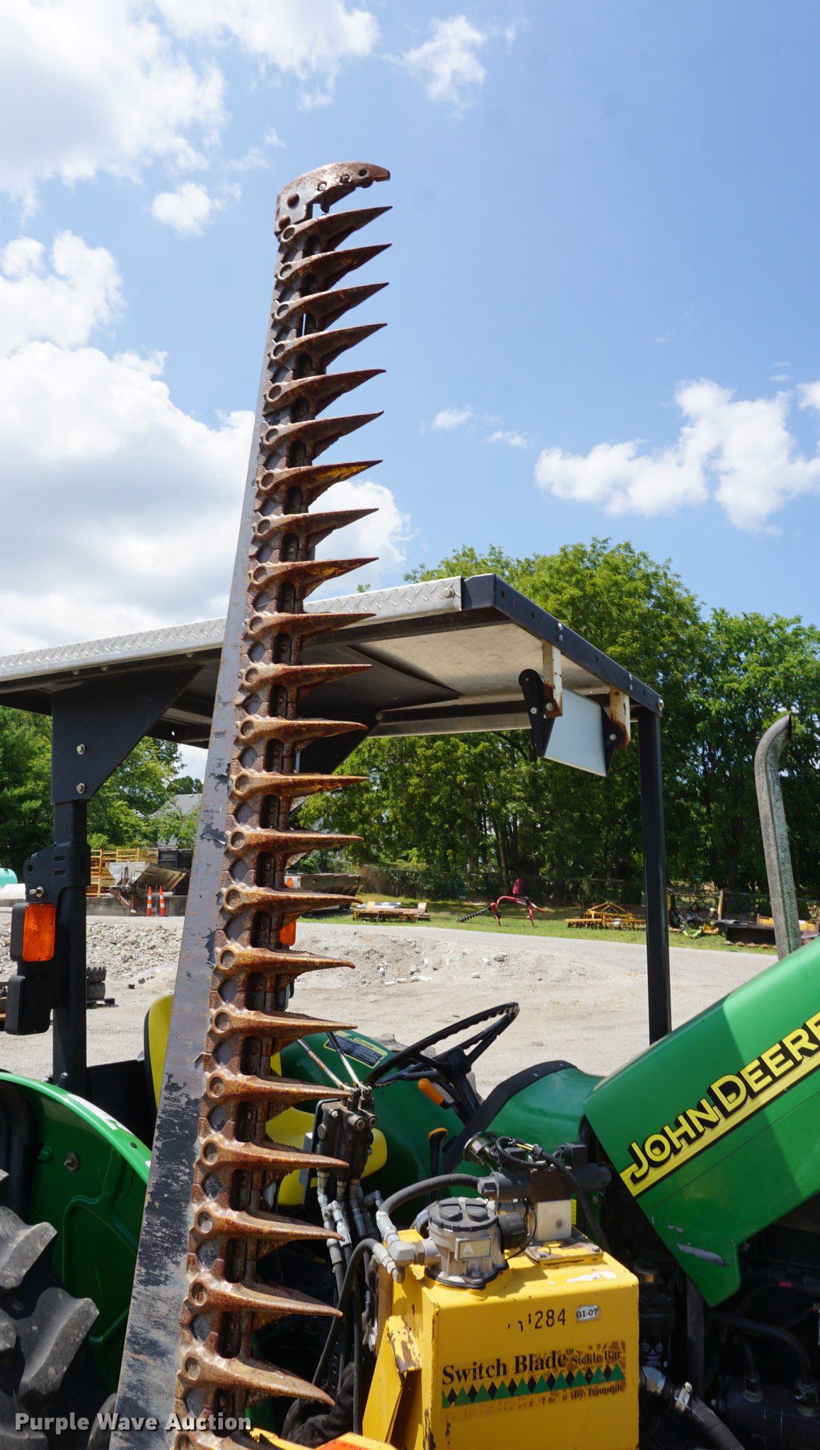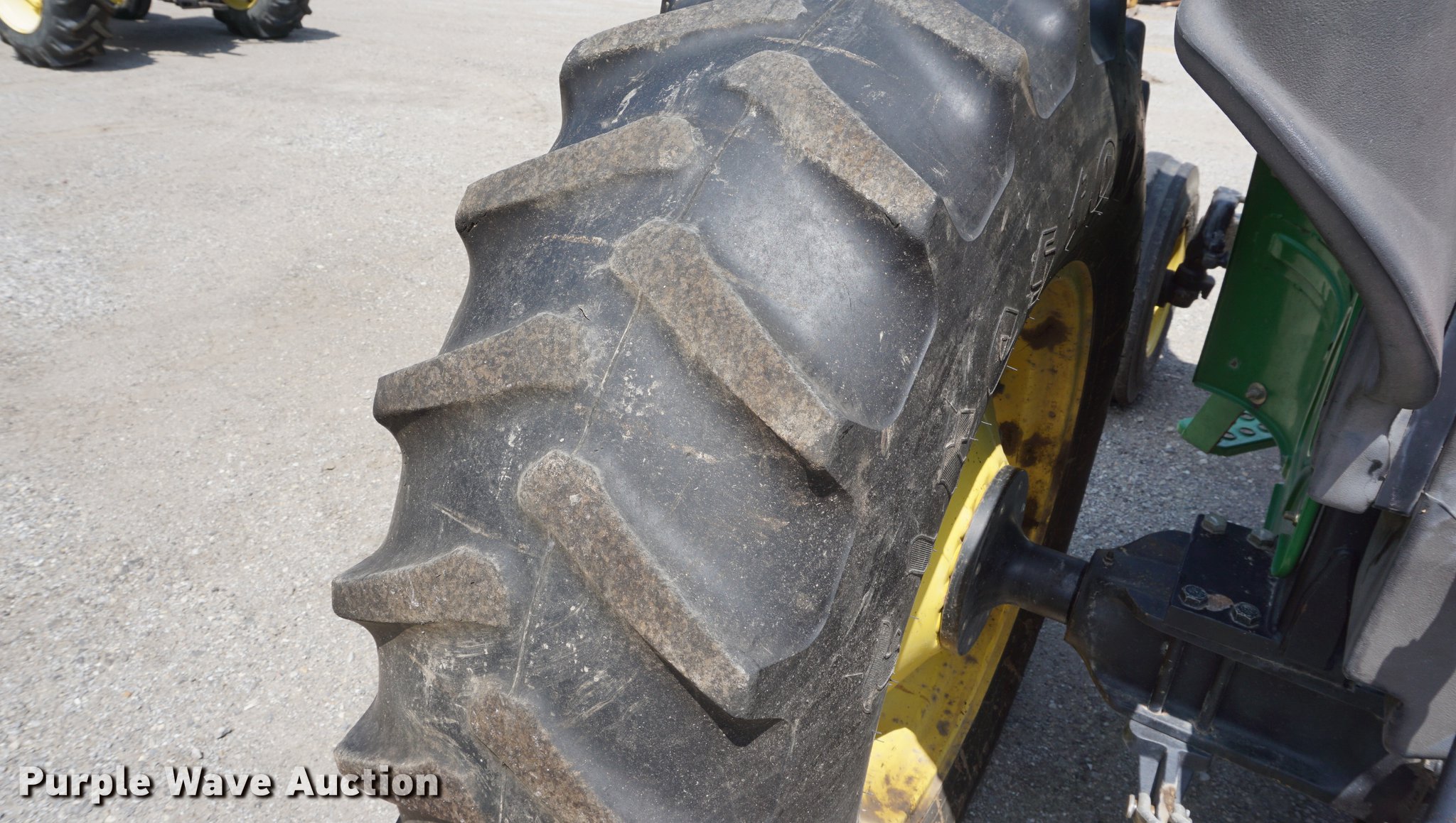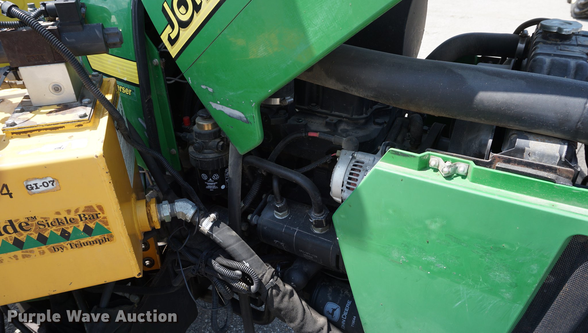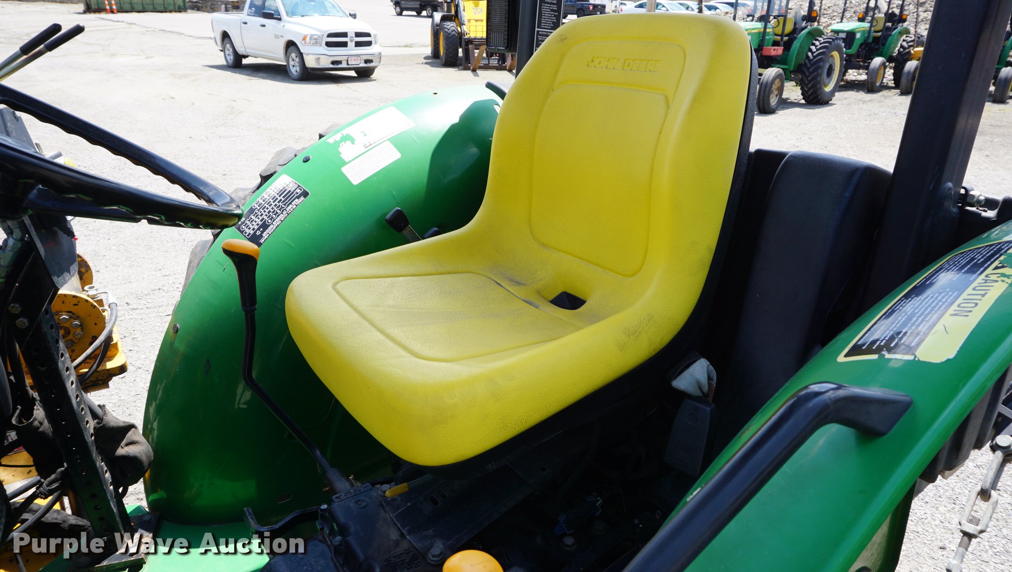 Purple Wave is selling a used Tractor in Missouri. This item is a 2005 John Deere 5205 tractor with the following: 1,472 hours on meter, John Deere 3029D 2.9L three cylinder diesel engine, 53 HP, Sync Reverser transmission, 8F-4R gears, Canopy, Suspension seat, Three point, Top link, 540 PTO, Rear hydraulic remote set, Front mounted hydraulic pump, 6'W sickle mower, 9.5L-15 front tires, 16.9-28 rear tires, Serial LV5205C621416