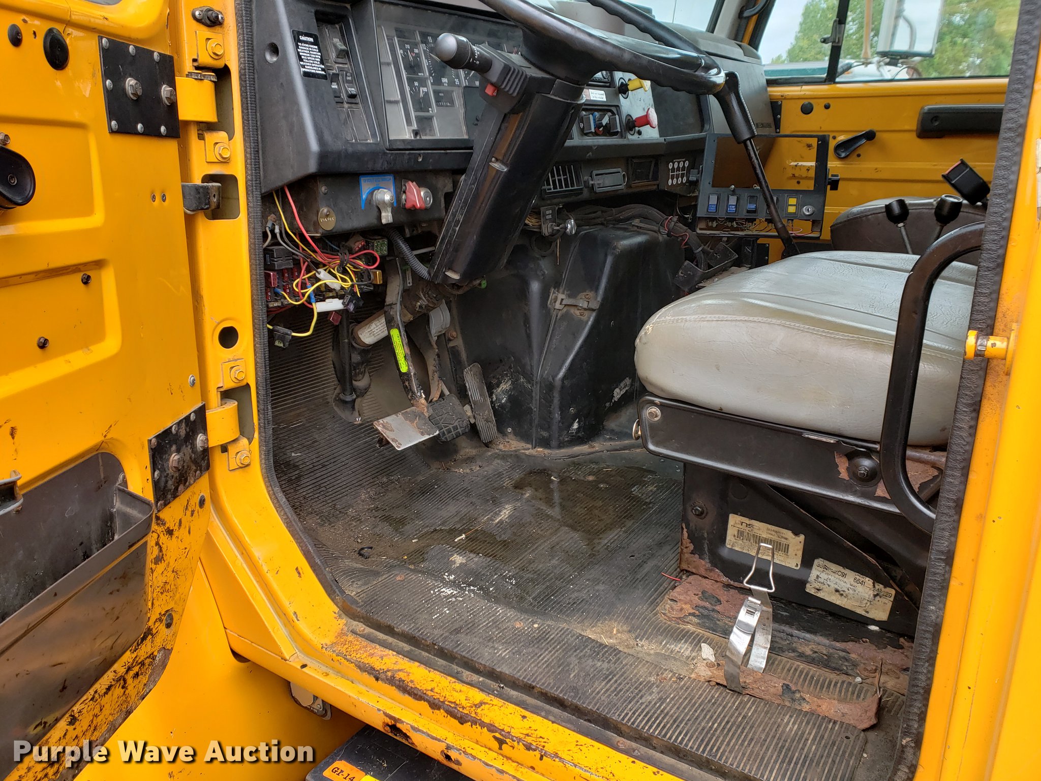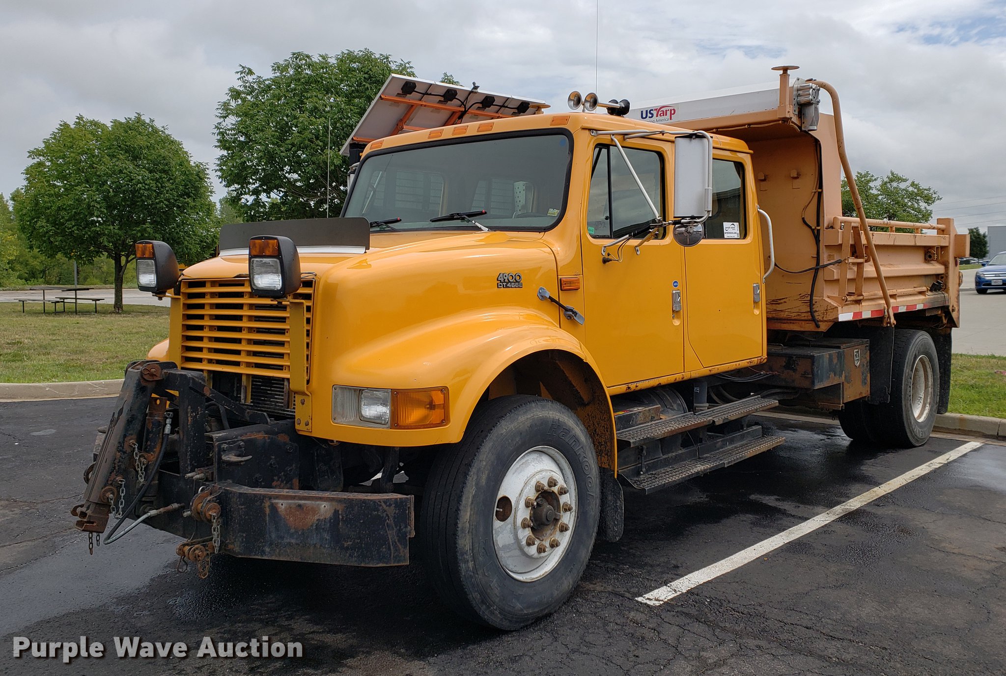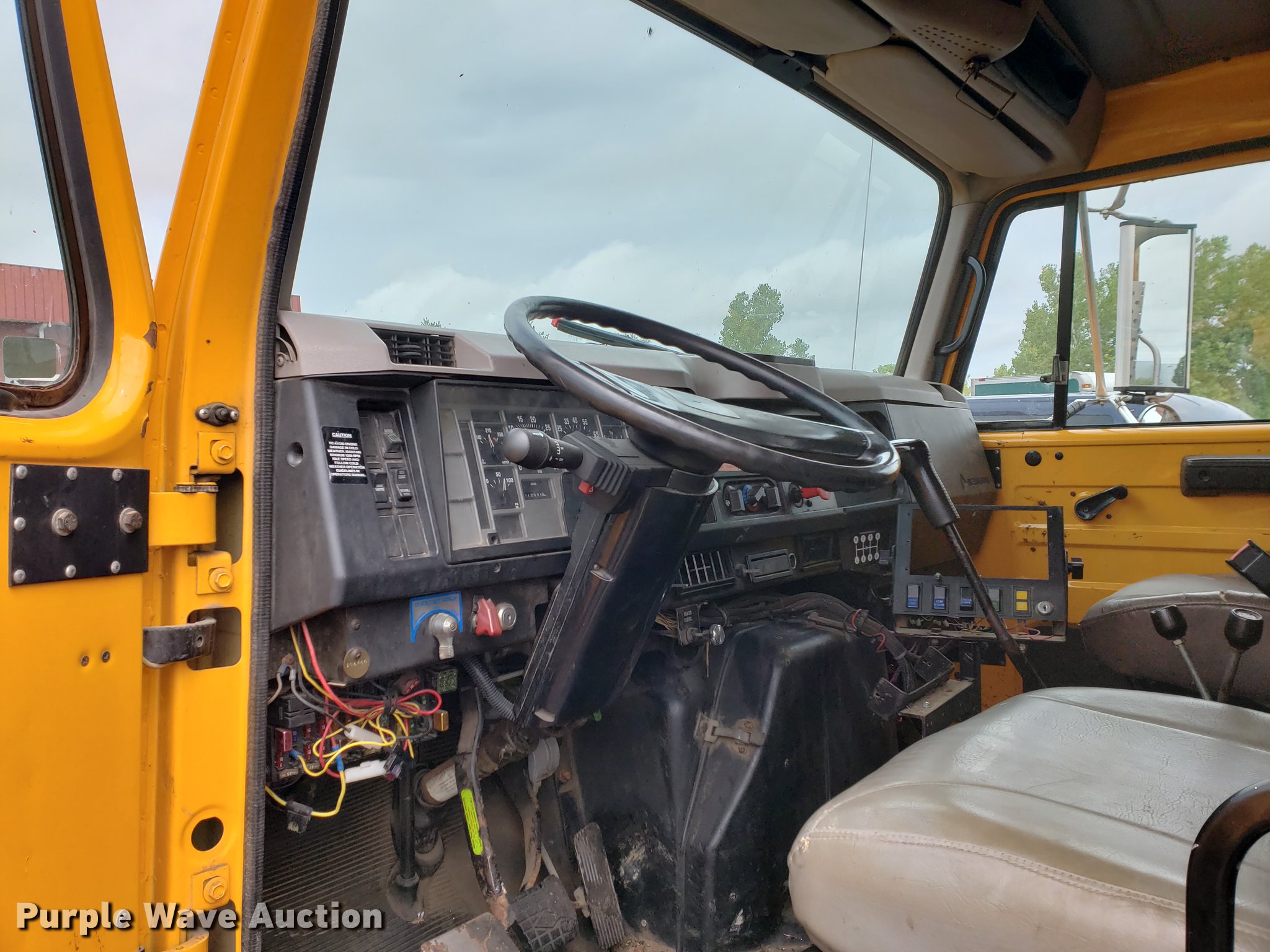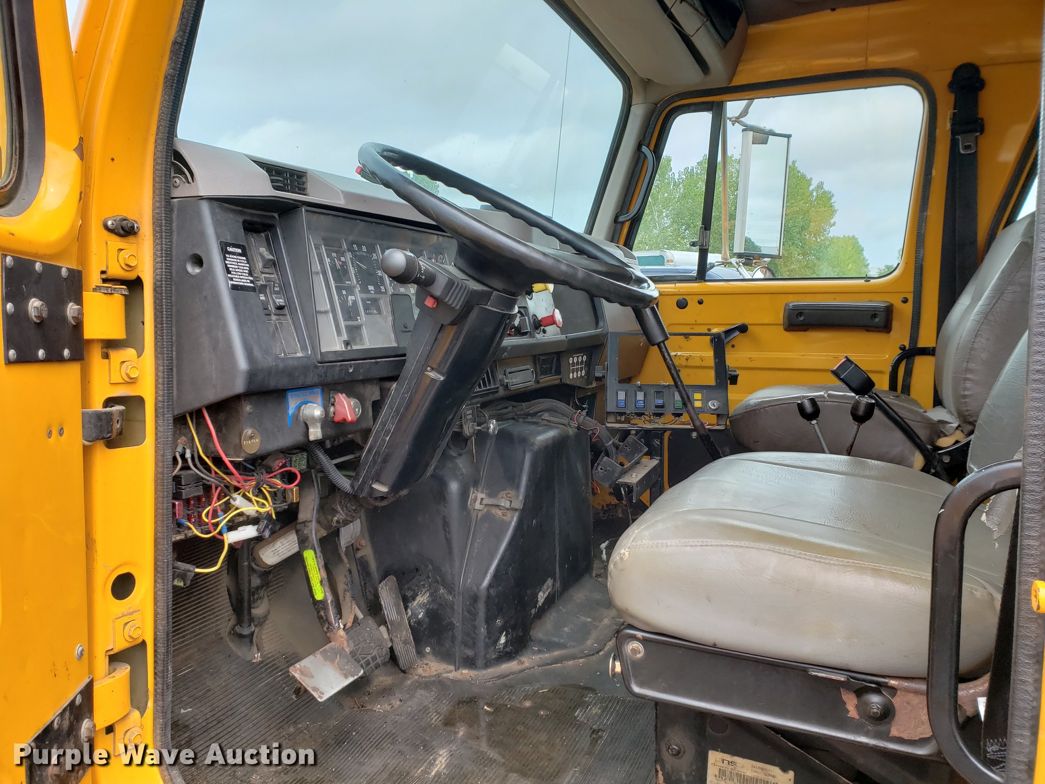 Purple Wave is selling a used Construction Dump Truck in Missouri. This item is a 2000 International 4900 dump truck with the following: 79,337 miles on odometer, 12,595 hours on meter, International DT466E 7.6L L6 turbo diesel engine, Seven speed manual transmission, Single axle, Heat, Cruise, Heated mirrors, Air suspension seat, 10'L x 8'W dump bed, 24" side height, Roll tarp, Front plow mount, Plow lights, Spring suspension, Air brakes, 11R22.5 tires, PTO shaft u-joint loose, Hole in exhaust muffler, Engine and hydraulic leaks, ABS light on, Batteries need replaced, Unit# 6132