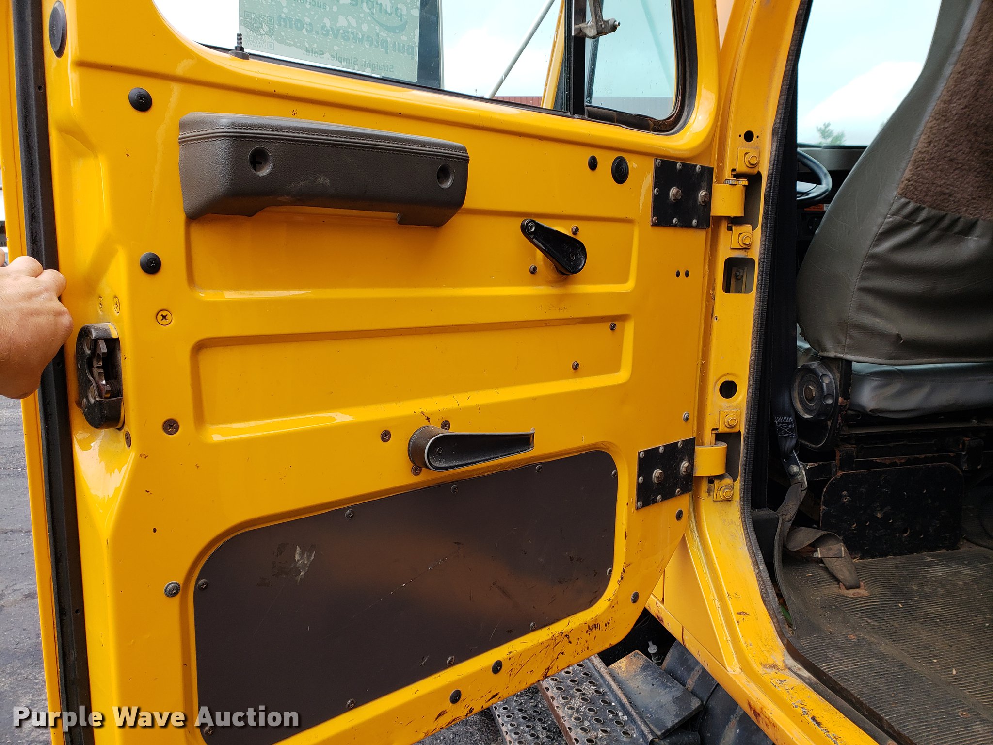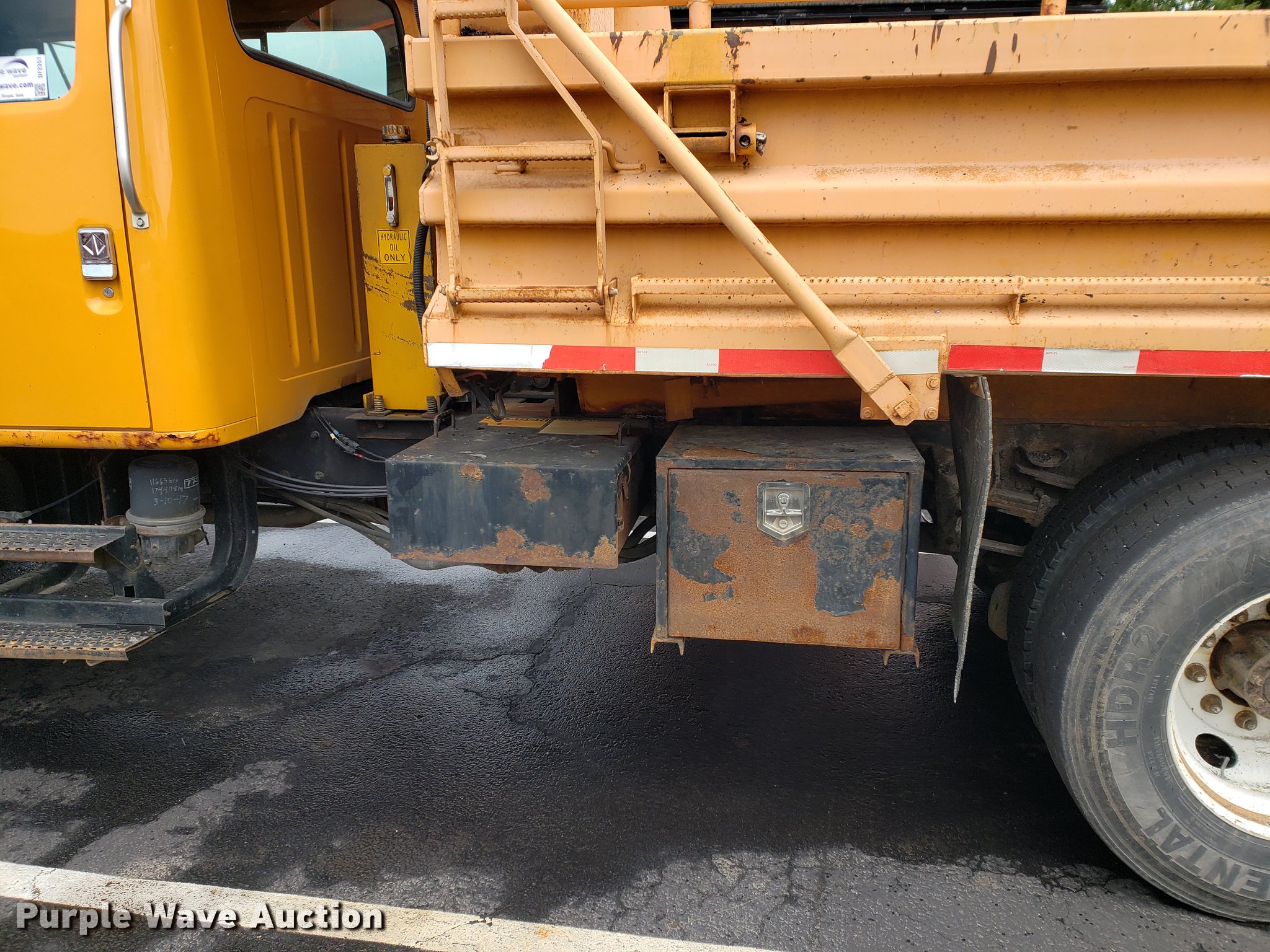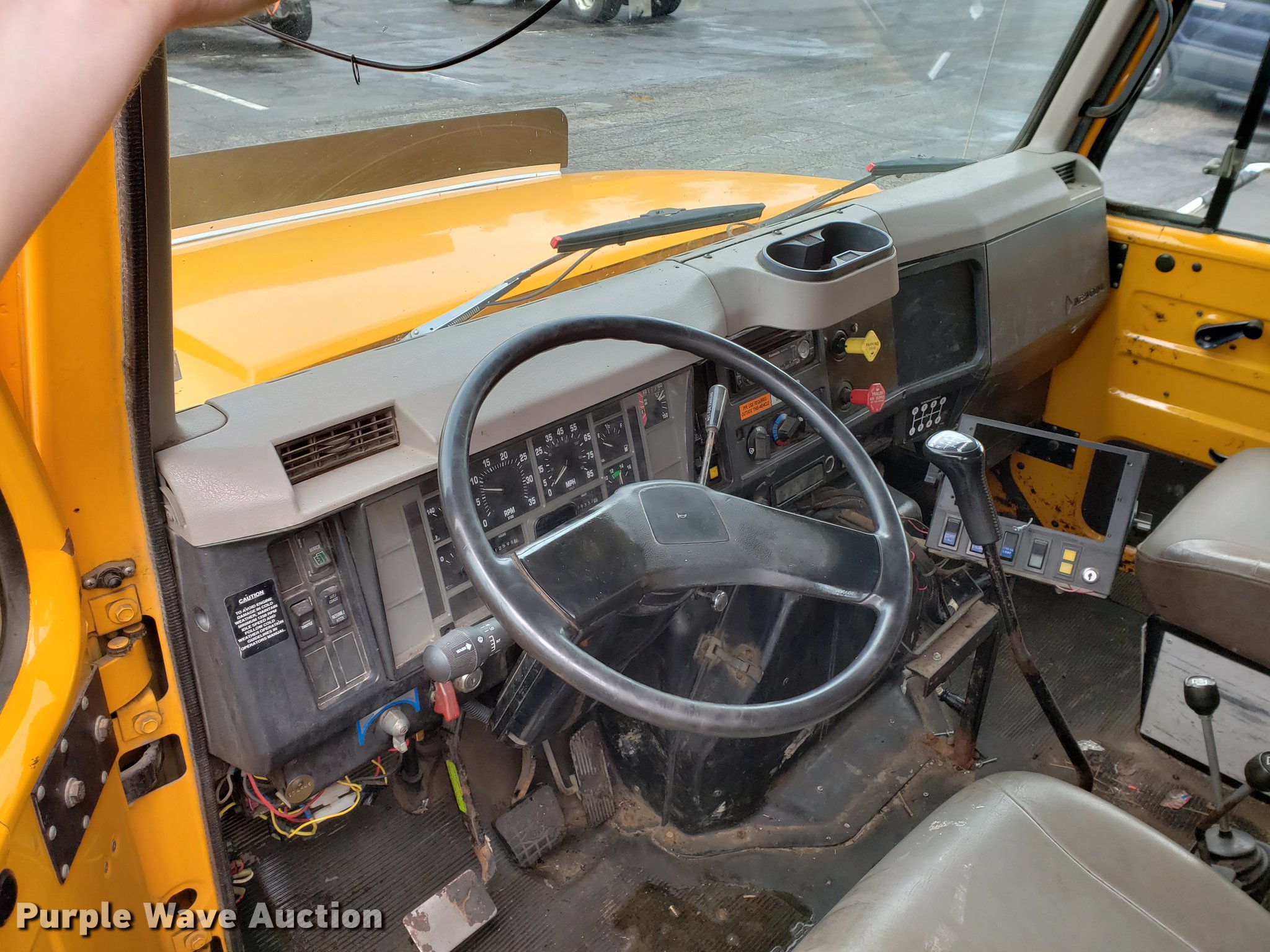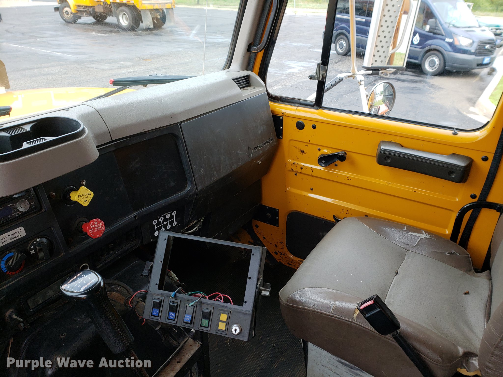 Purple Wave is selling a used Construction Dump Truck in Missouri. This item is a 2000 International 4900 dump truck with the following: 79,337 miles on odometer, 12,595 hours on meter, International DT466E 7.6L L6 turbo diesel engine, Seven speed manual transmission, Single axle, Heat, Cruise, Heated mirrors, Air suspension seat, 10'L x 8'W dump bed, 24" side height, Roll tarp, Front plow mount, Plow lights, Spring suspension, Air brakes, 11R22.5 tires, PTO shaft u-joint loose, Hole in exhaust muffler, Engine and hydraulic leaks, ABS light on, Batteries need replaced, Unit# 6132