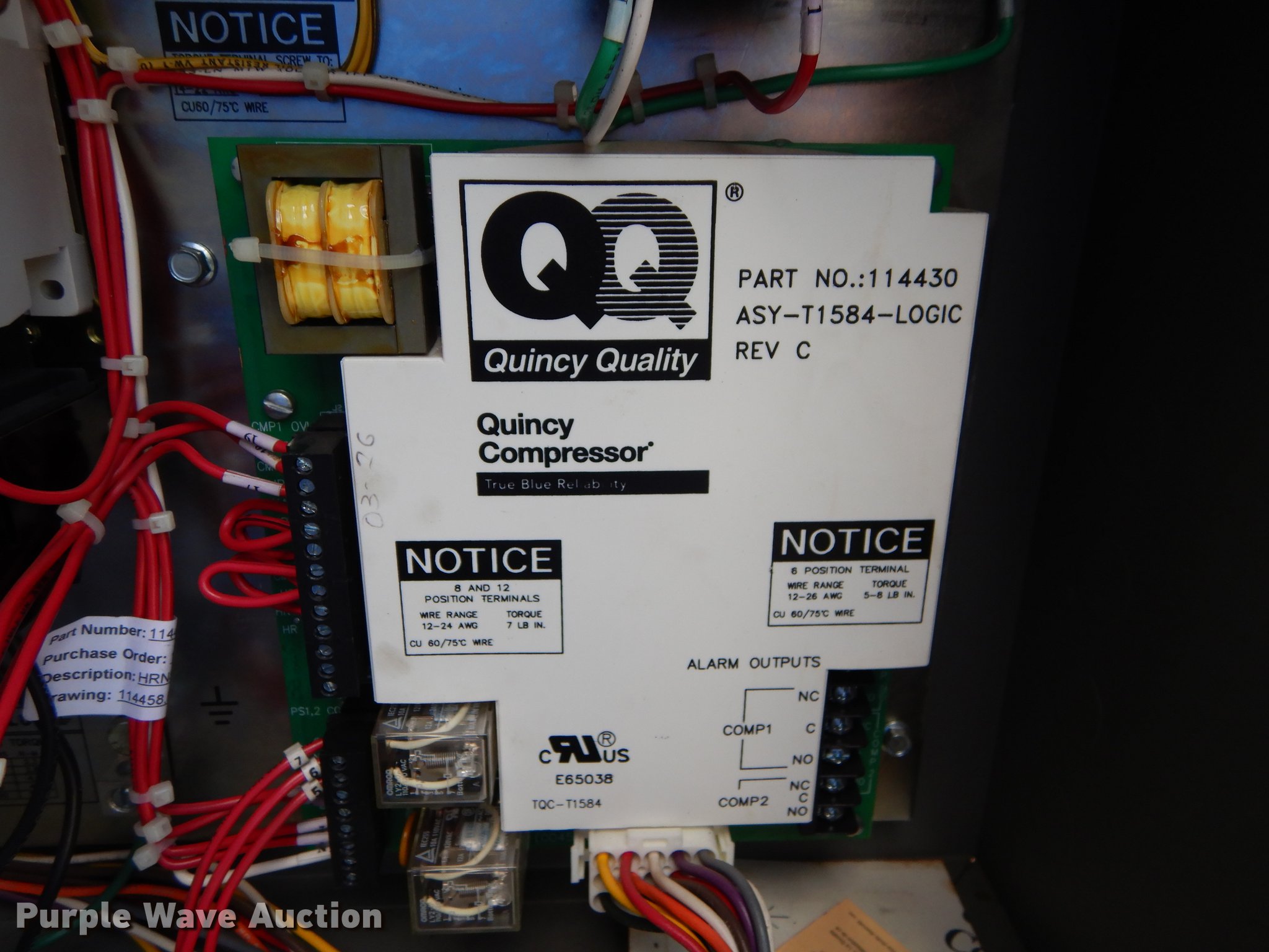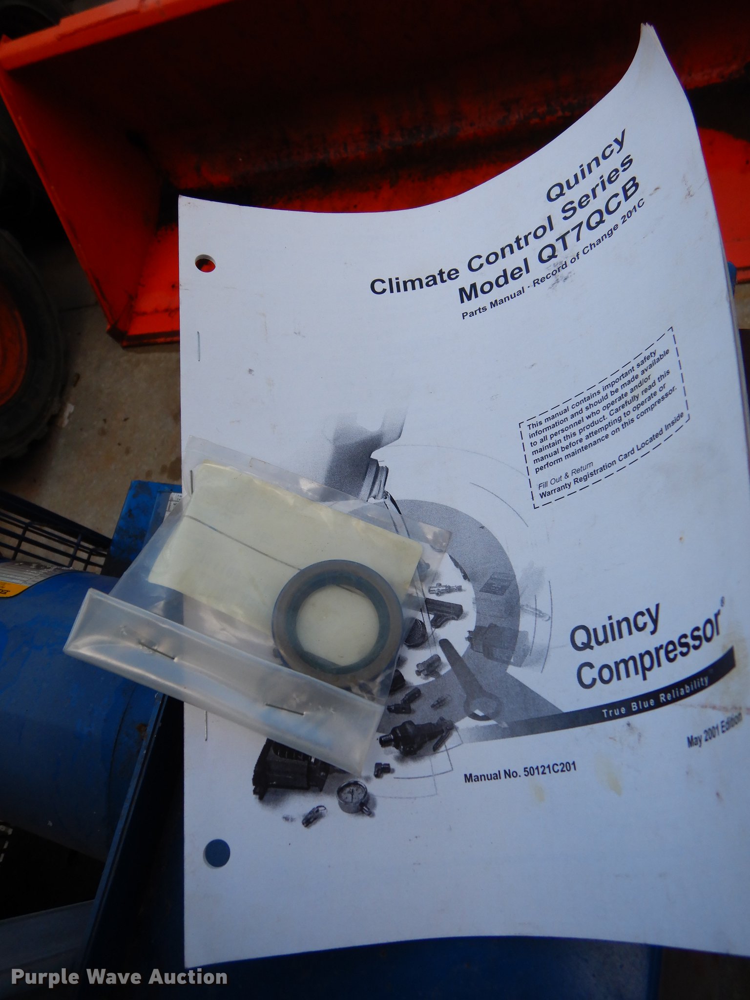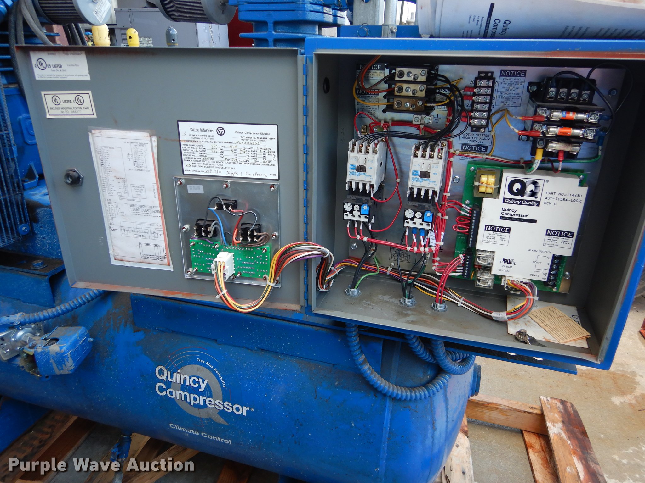 Purple Wave is selling a used Air Compressor in Kansas. This item is a 2003 Quincy air compressor with the following: Model QC05012D00257, (2) 5 HP electric motors, 1,750 RPM, Three phase, Square D circuit breaker, Operator manuals, Unit has been covered, Removed from service in July 2018, Serial 20030808-0088