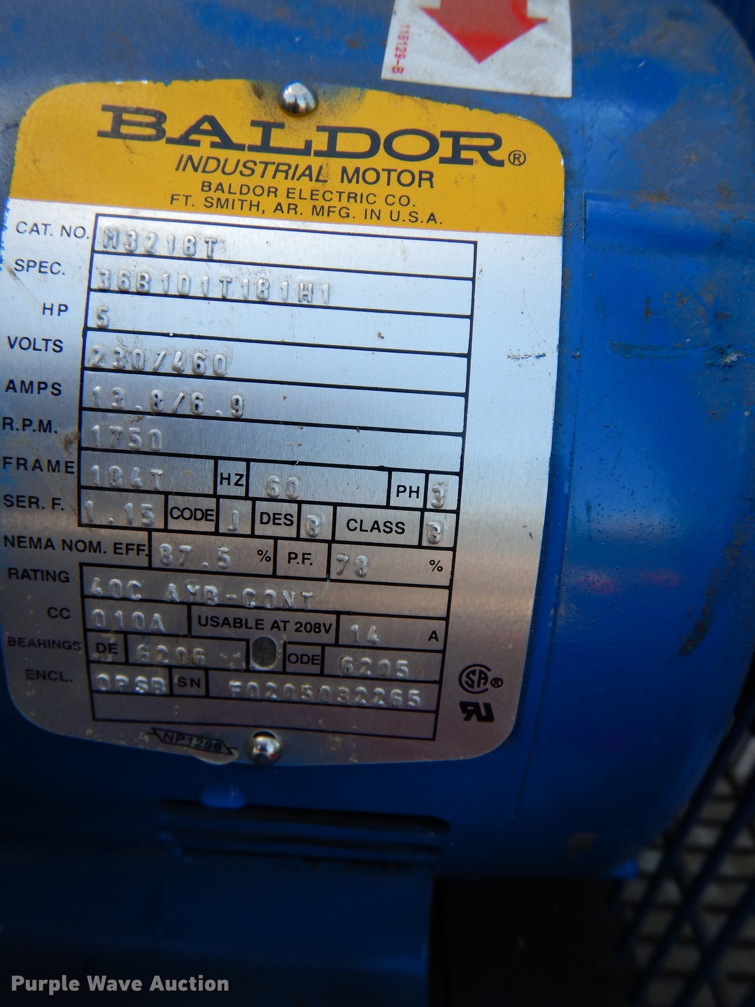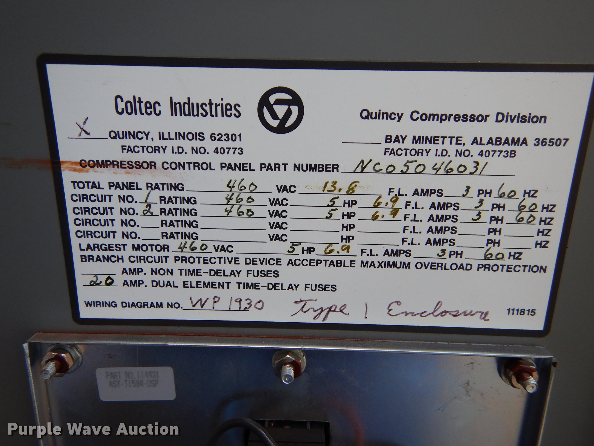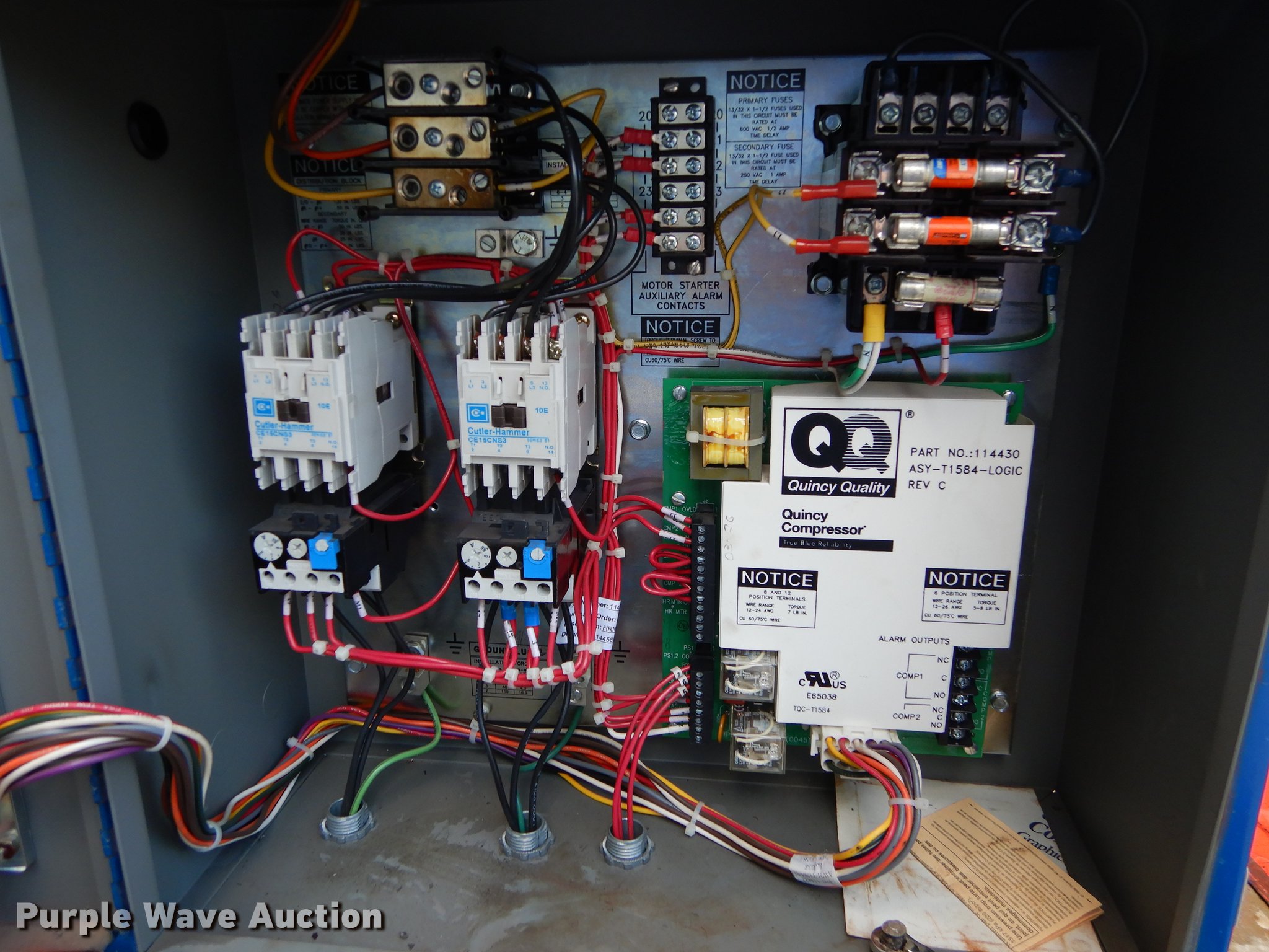 Purple Wave is selling a used Air Compressor in Kansas. This item is a 2003 Quincy air compressor with the following: Model QC05012D00257, (2) 5 HP electric motors, 1,750 RPM, Three phase, Square D circuit breaker, Operator manuals, Unit has been covered, Removed from service in July 2018, Serial 20030808-0088