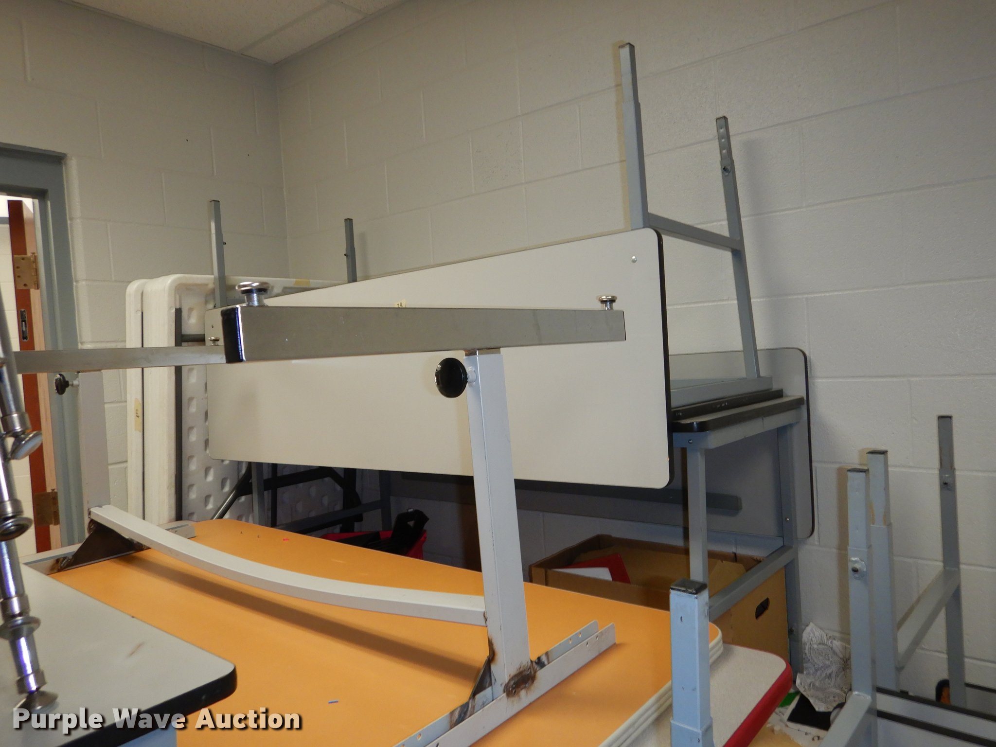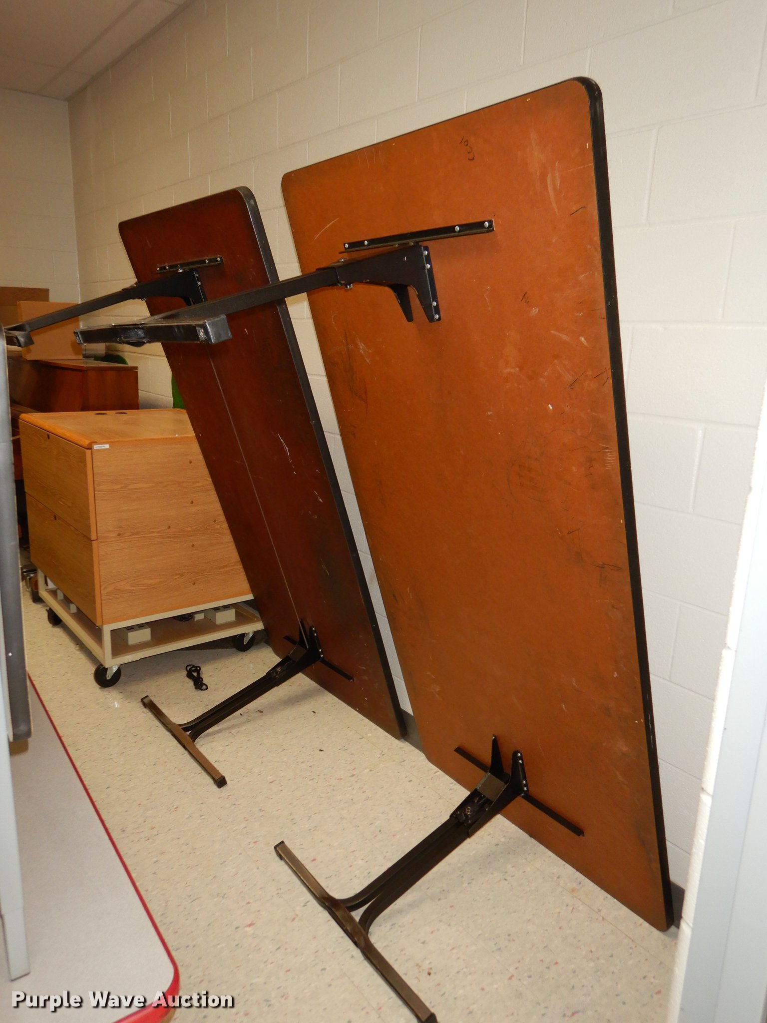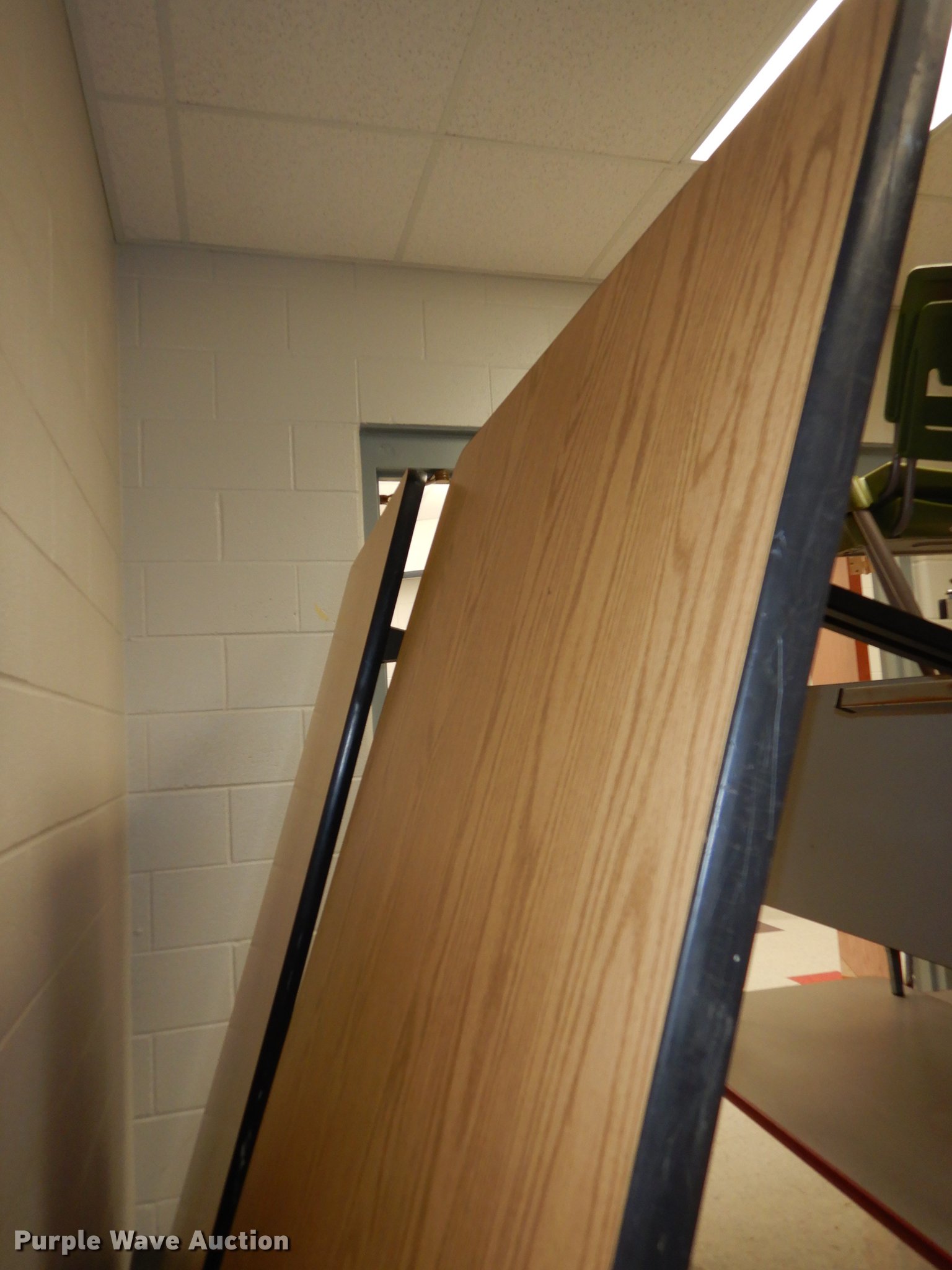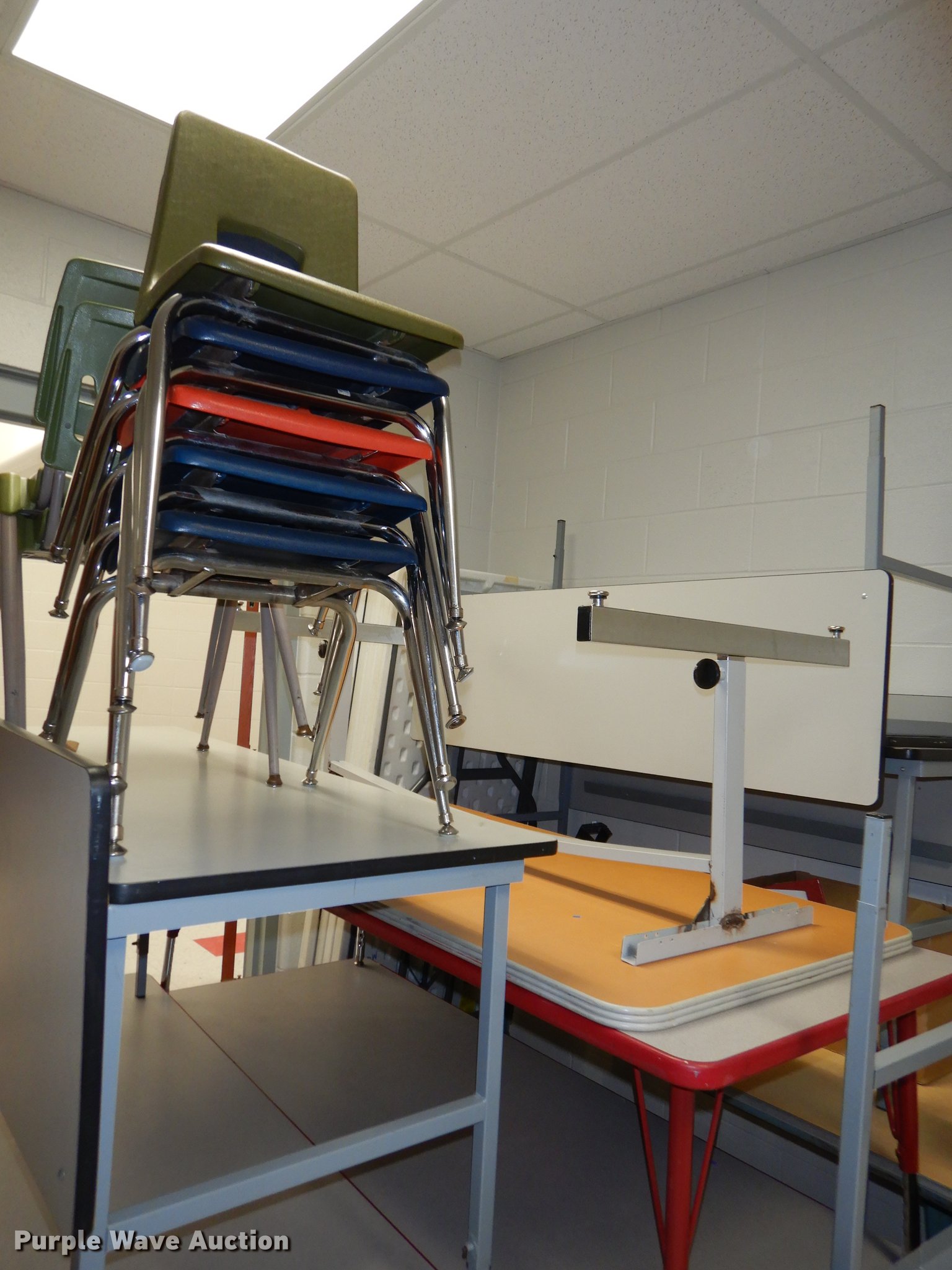 Purple Wave is selling a used Furniture in Kansas. This item is a Furniture with the following: (15) tables, 6'L to 8'L, Some damaged, (2) fold up tables, (8) classroom chairs