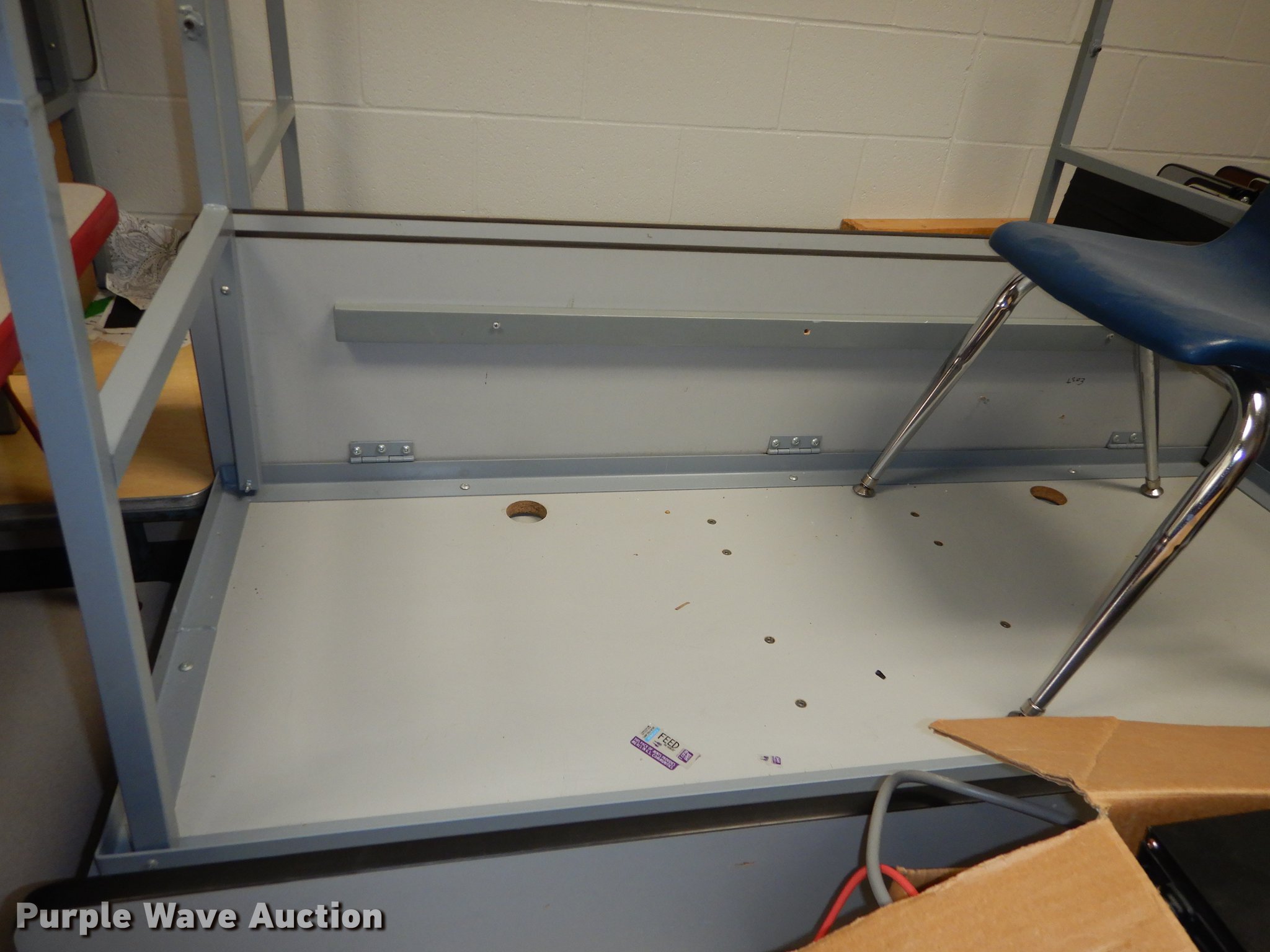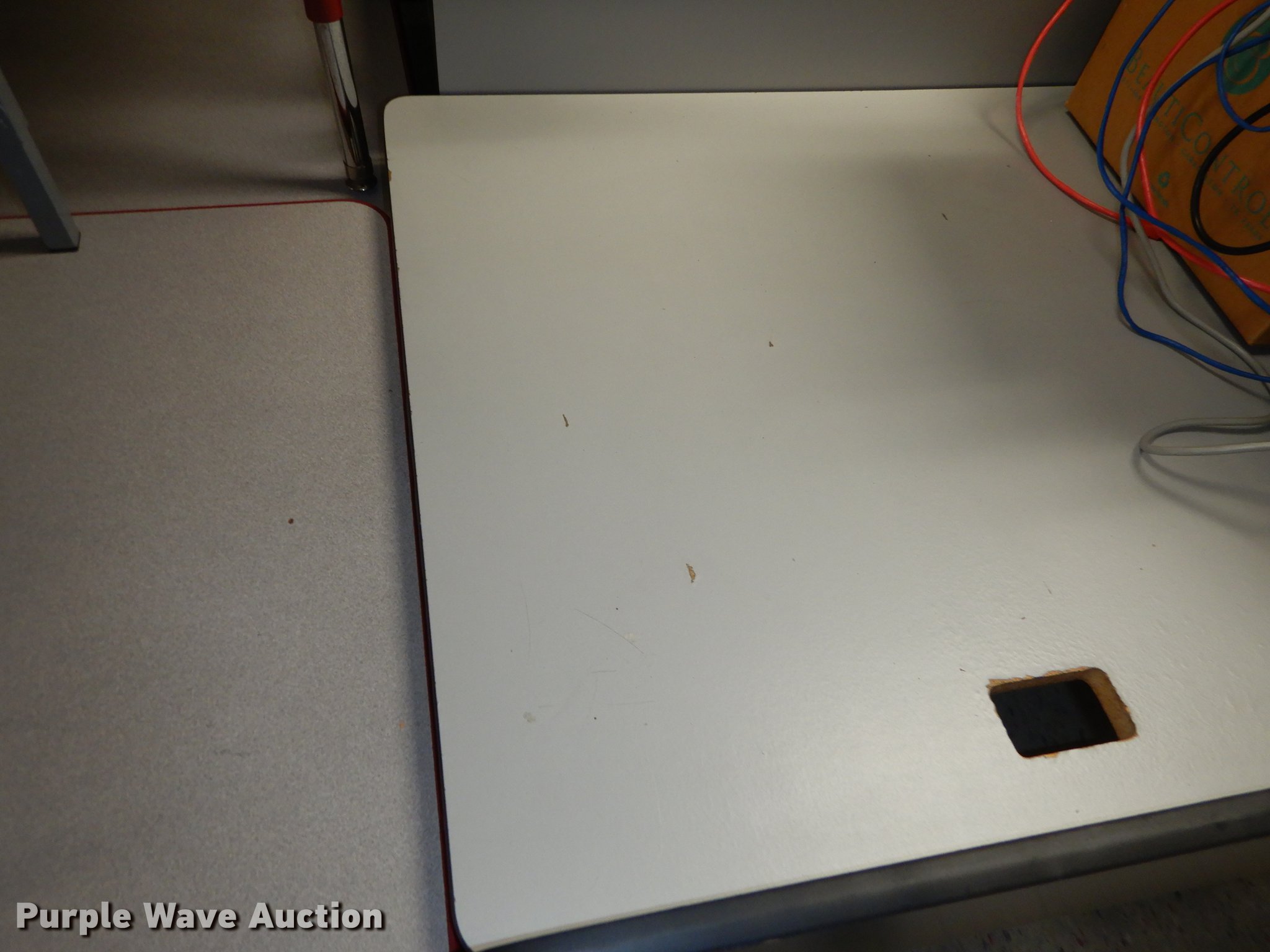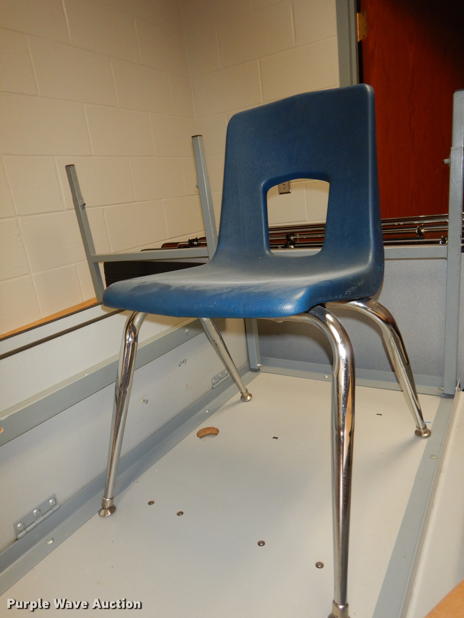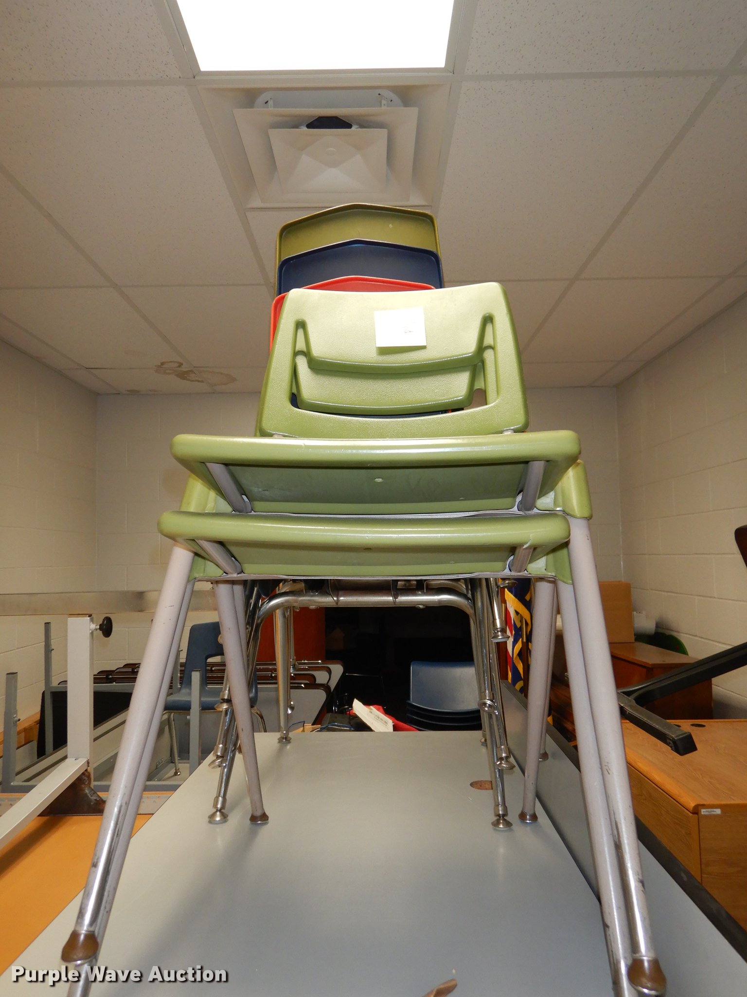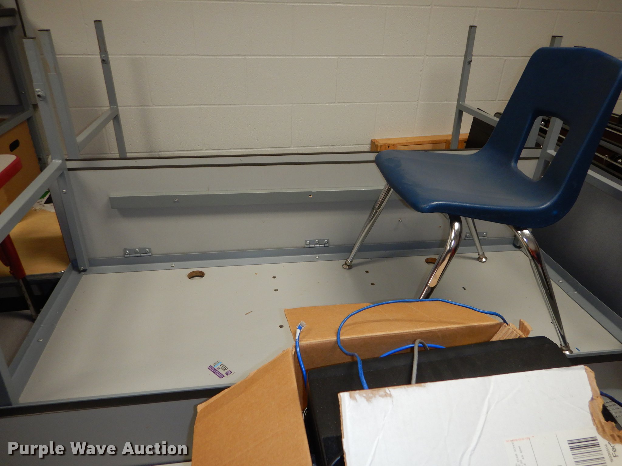 Purple Wave is selling a used Furniture in Kansas. This item is a Furniture with the following: (15) tables, 6'L to 8'L, Some damaged, (2) fold up tables, (8) classroom chairs