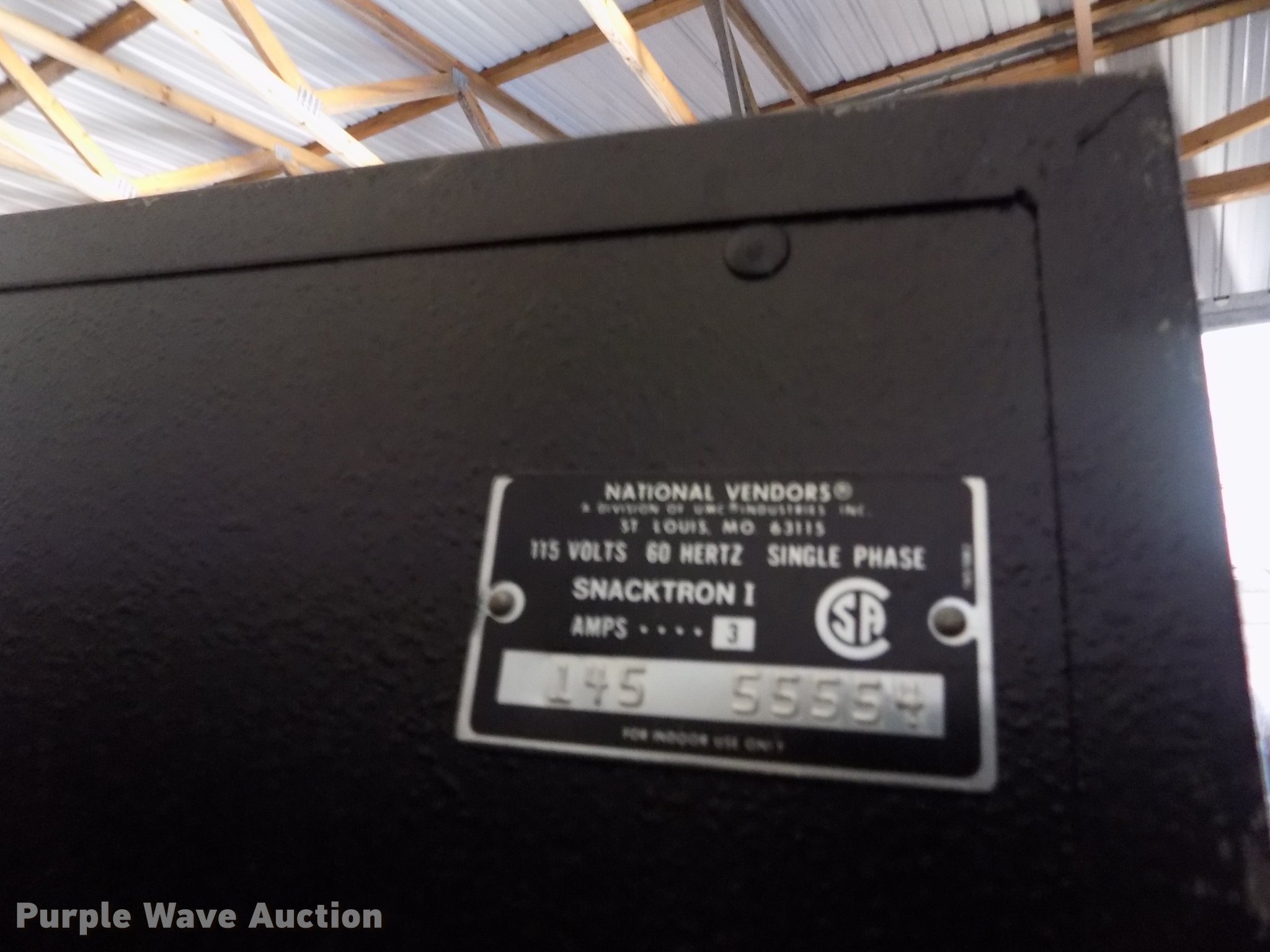 Purple Wave is selling a used Retail Displays in Kansas. This item is a National Vendors Snacktron 1 vending machine with the following: Coin and bill capable, Lock damaged