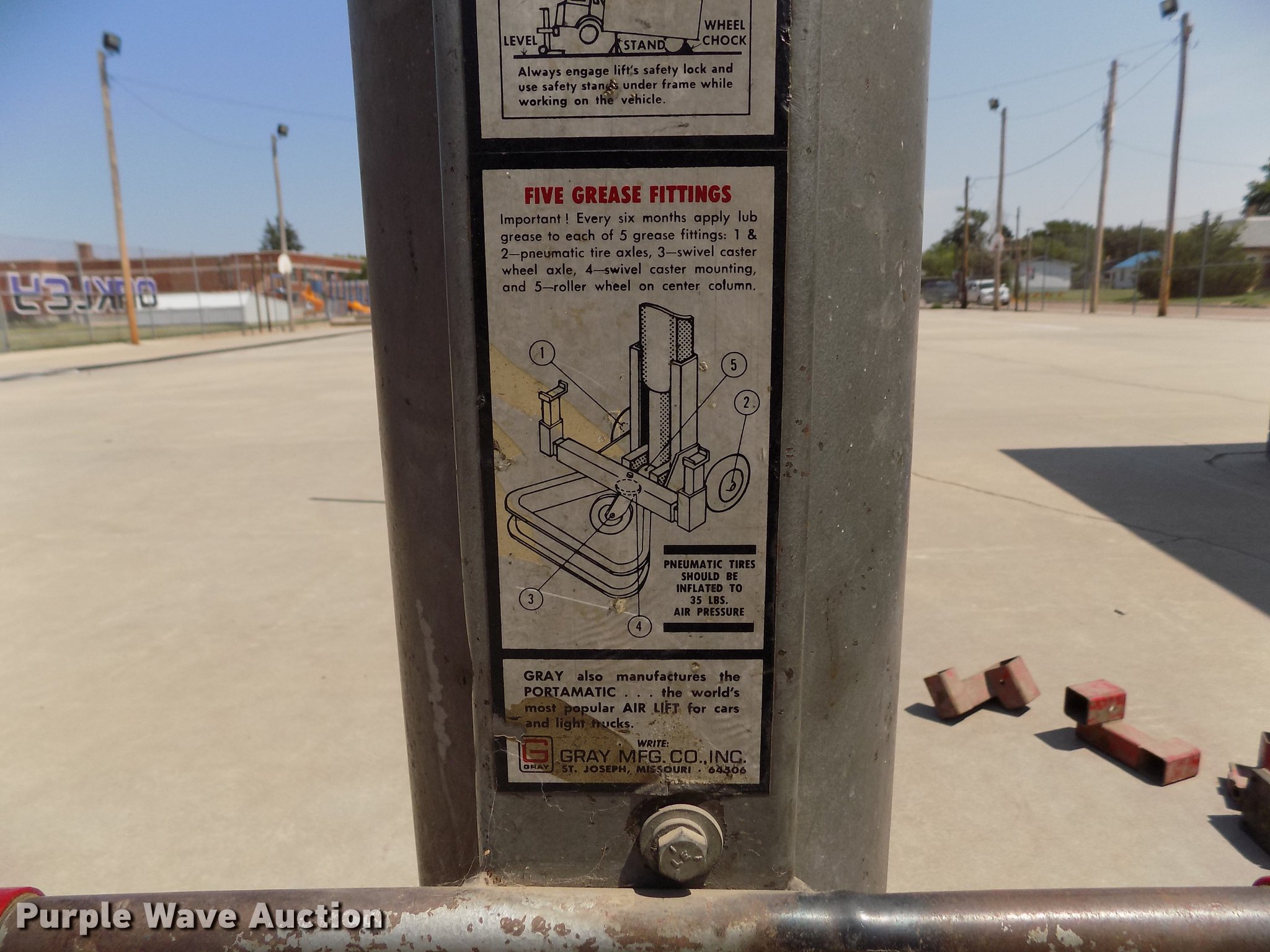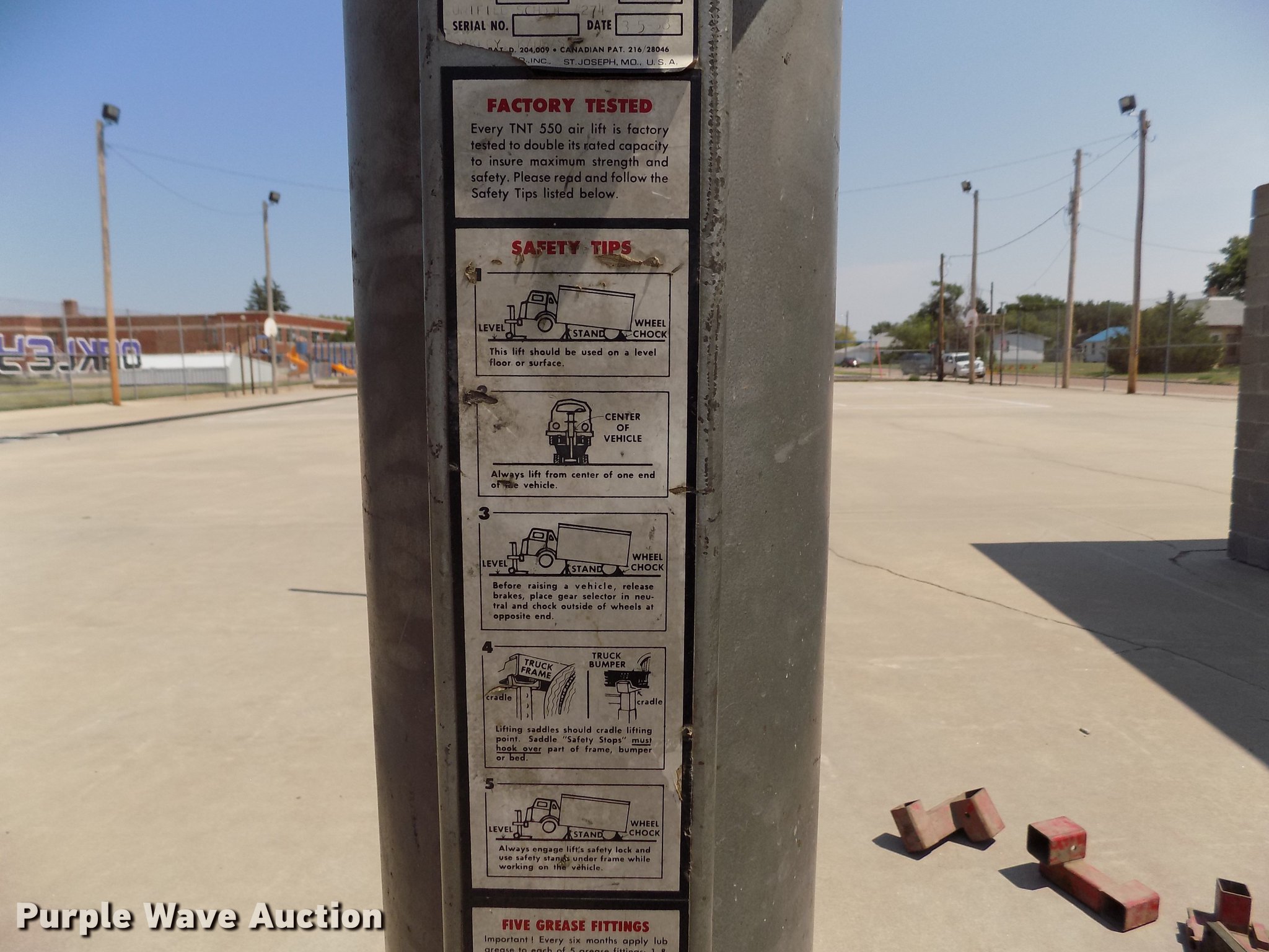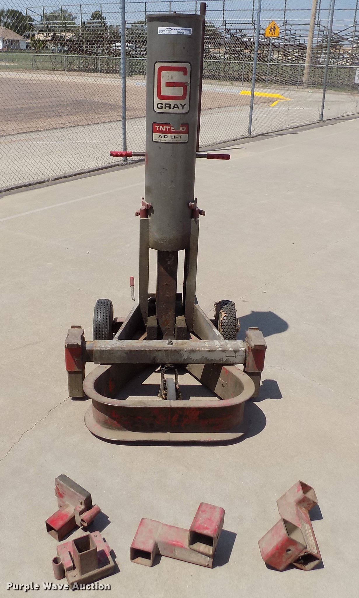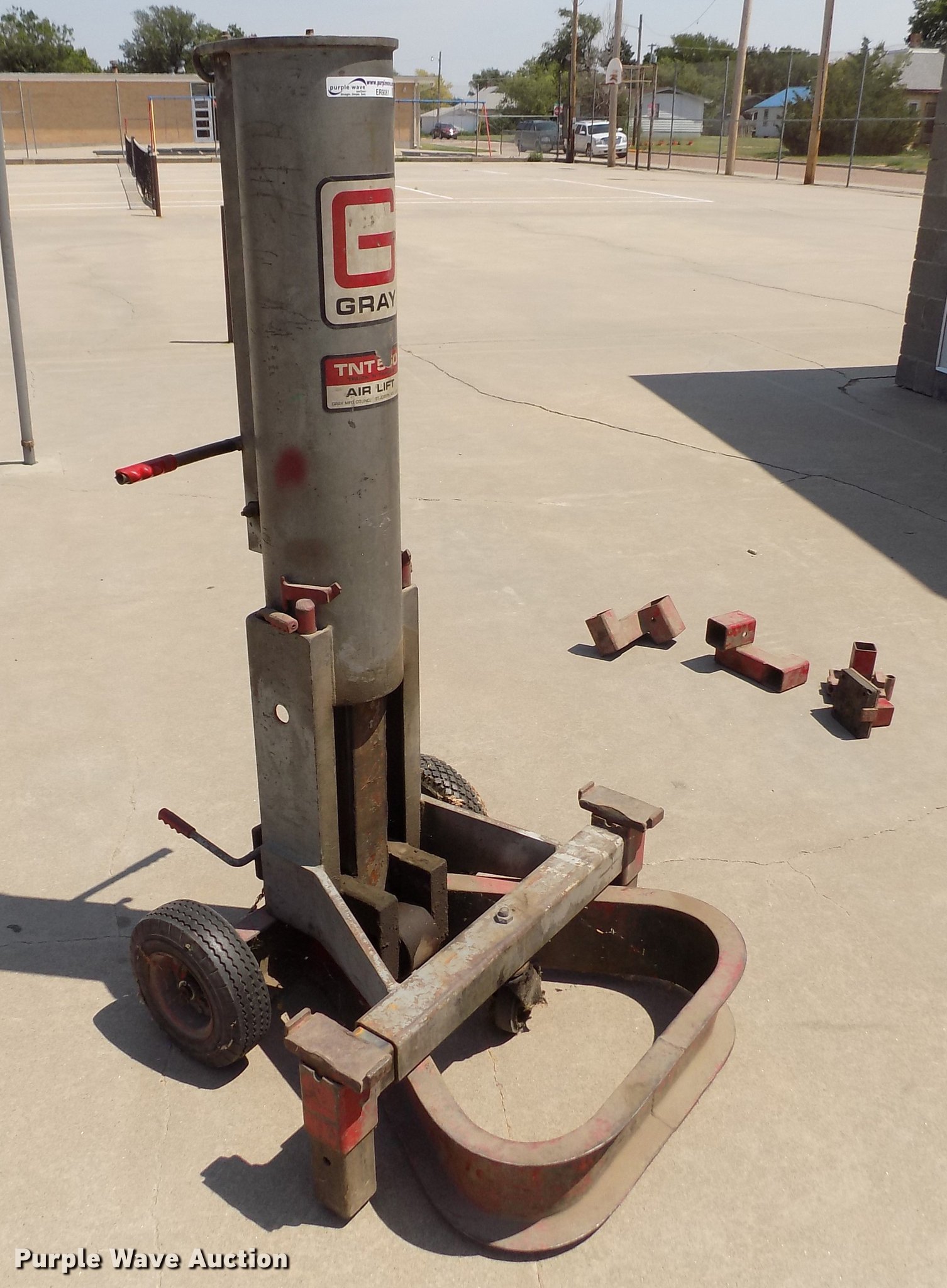 Gray TNT 550 jack. 5.5 ton capacity, Pneumatic operation, Extensions, 4.10/3.50-6 tires. USD 274 Oakley Public Schools. 621 Center Ave Ste 103. Oakley, KS 67748