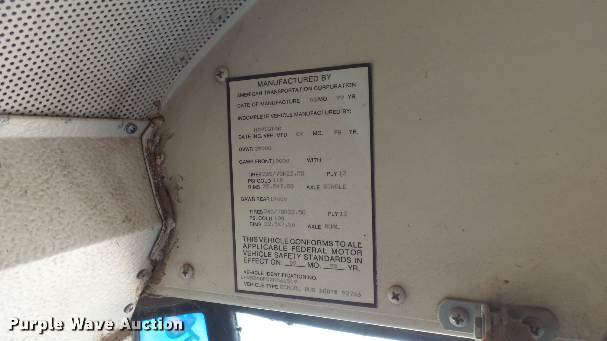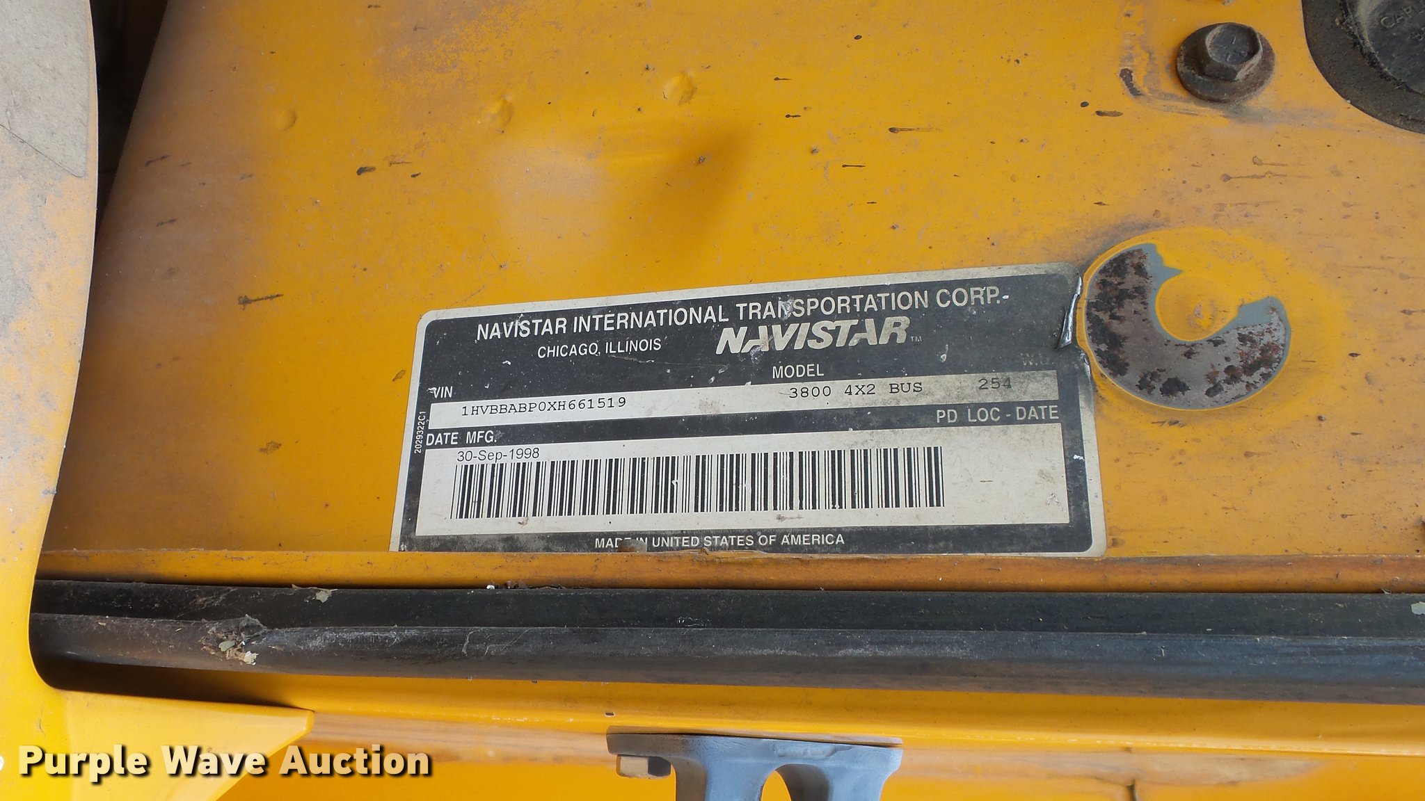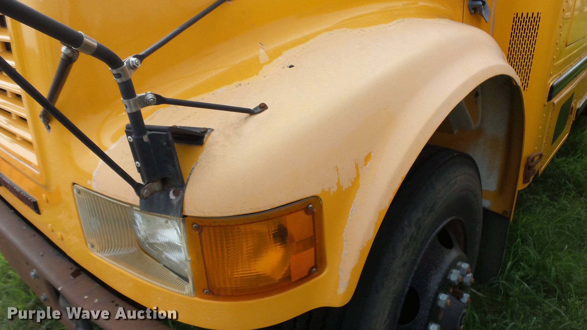 Purple Wave is selling a used Bus in Kansas. This item is a 1999 International 3800 school bus with the following: 158,842 miles on odometer, 7,997 hours on meter, International T444 7.3L V8 diesel engine, Spicer five speed manual transmission, Heat, AM/FM, Vinyl interior, Roof, rear, and side emergency exits, Block heater, Tow hooks, Hydraulic brakes, 10R22.5 tires, Dead battery