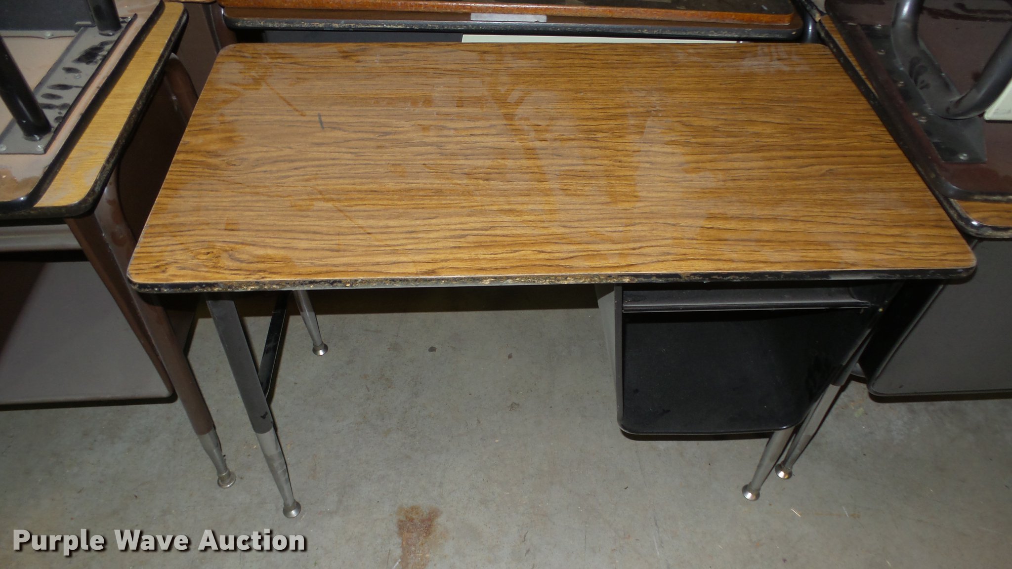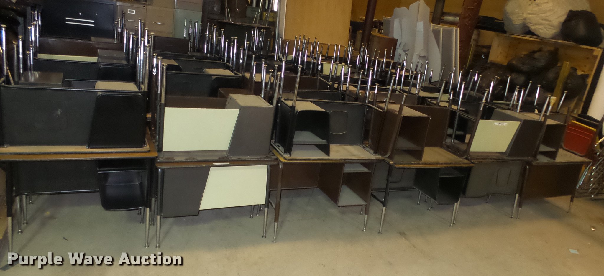 Purple Wave is selling a used Furniture in Kansas. This item is a Approximately 90 desks with the following: Most metal with wood tops, Assorted styles and conditions