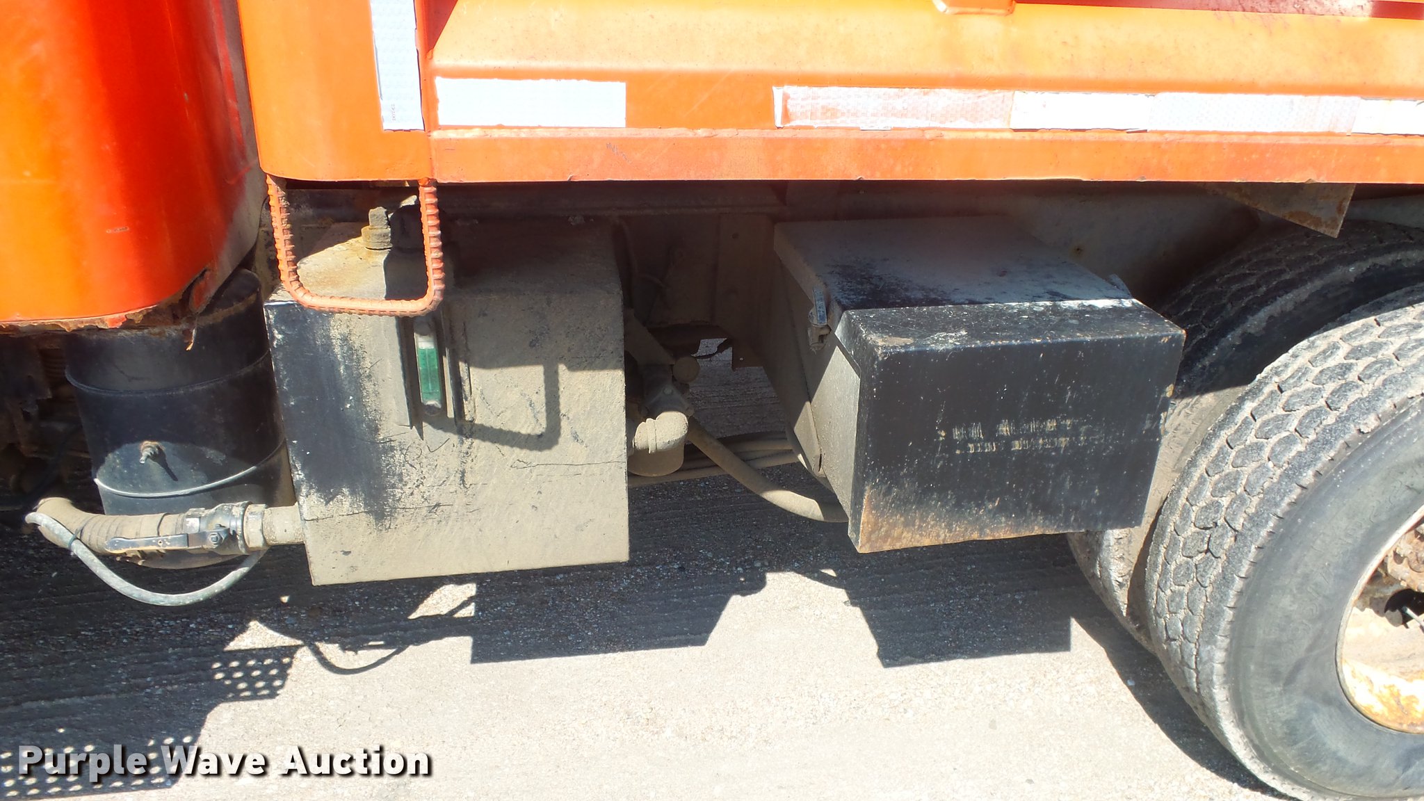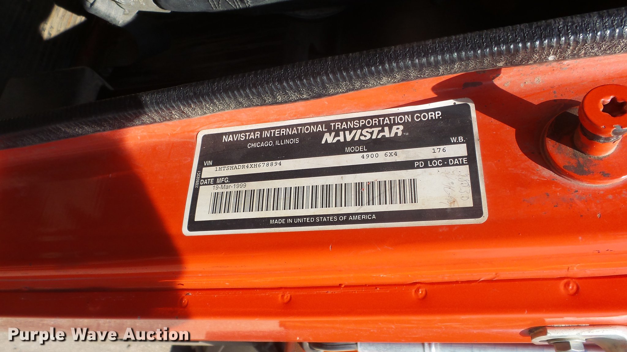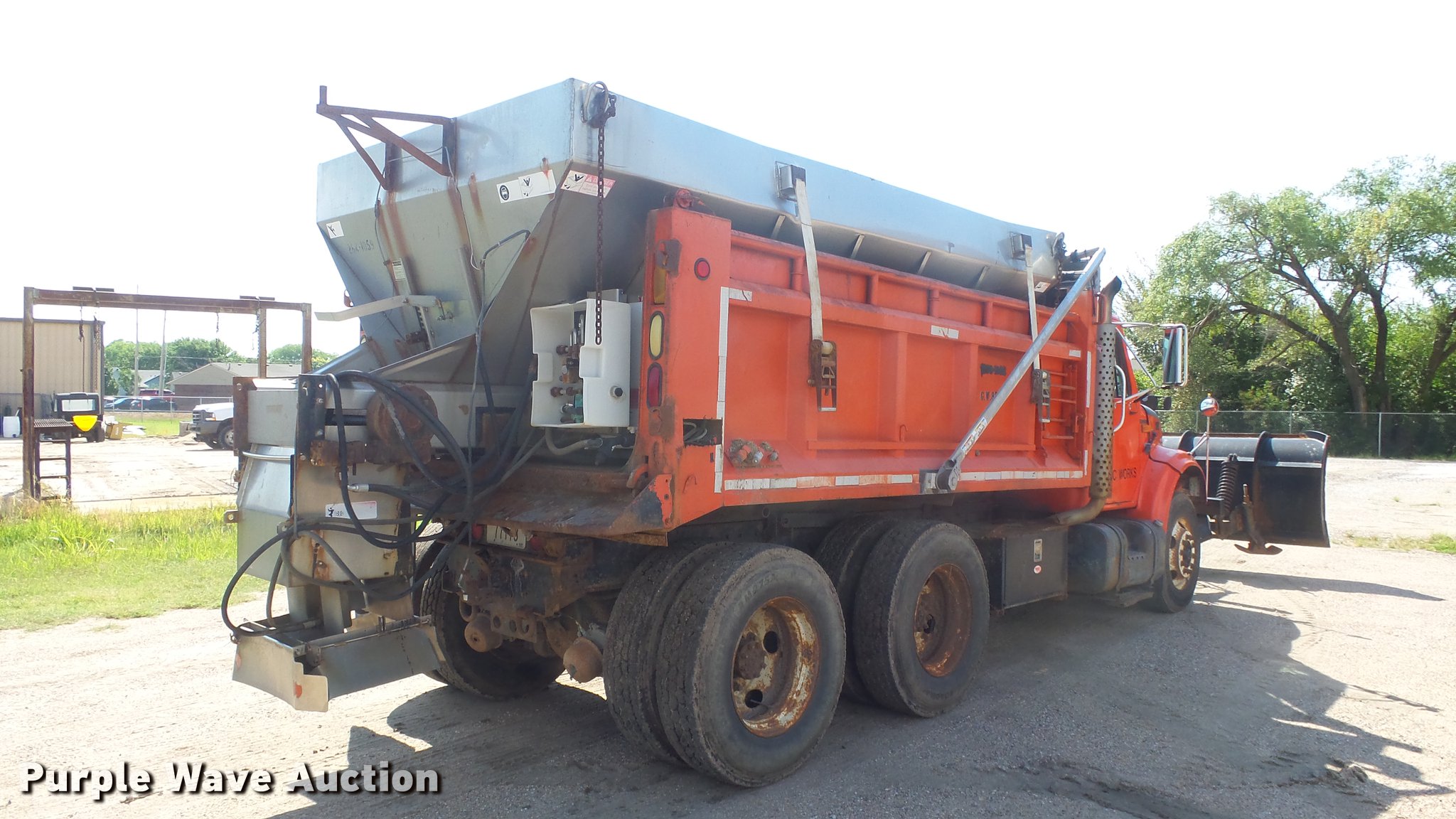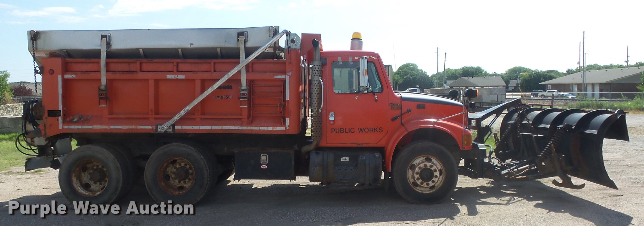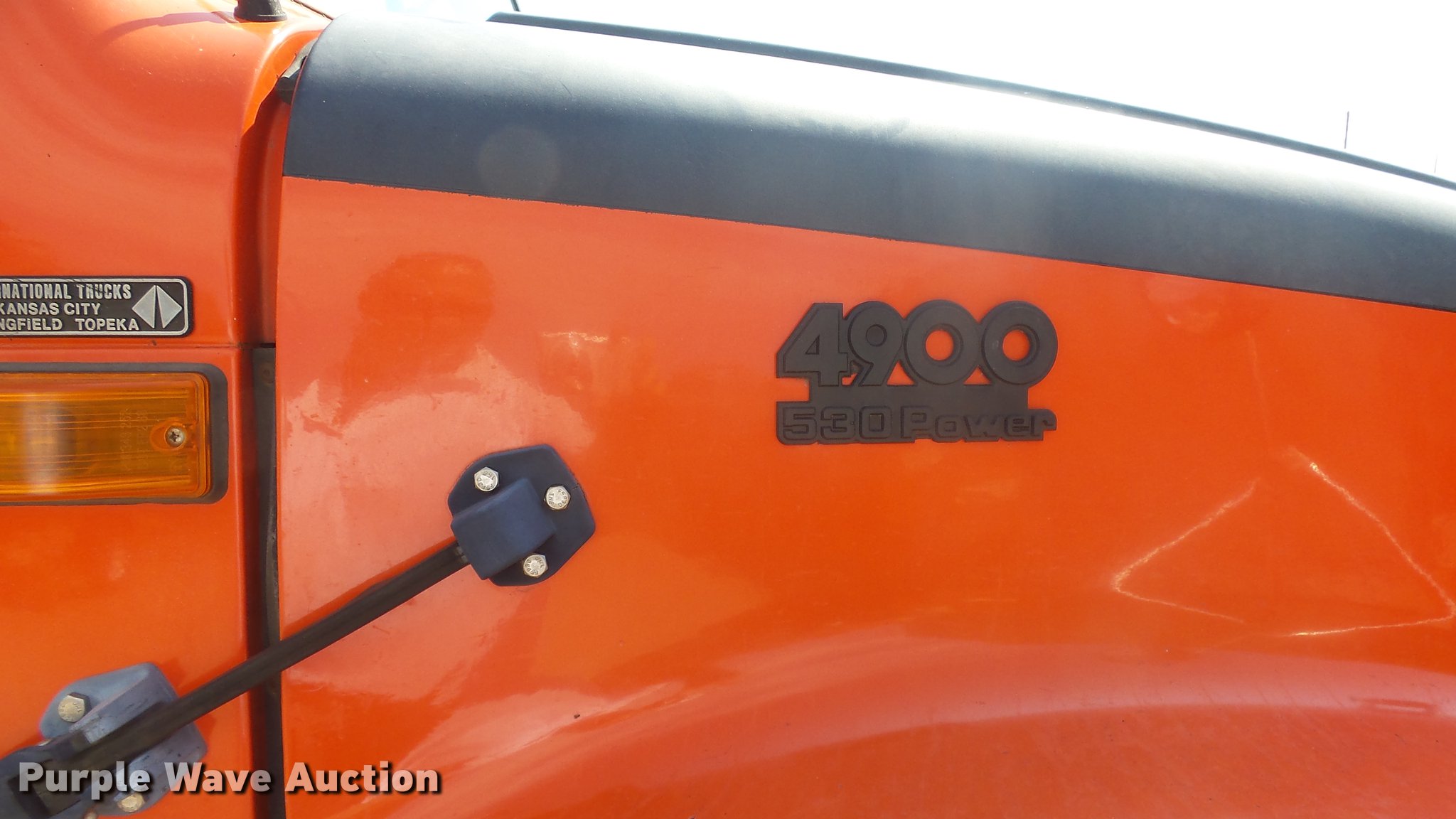 Purple Wave is selling a used Construction Dump Truck in Kansas. This item is a 1999 International 4900 dump truck with the following: 221,883 miles on odometer, 10,223 hours on meter, International DT530 8.7L L6 diesel engine, Automatic transmission, Tandem axle, Power divider lock, AC and heat, Cruise, Heated mirrors, Air suspension seat, Vinyl interior, Beacon light, Gresen cab controls, 13'L x 8'W steel dump bed, 45" side height, Roll tarp, 11'W plow, Lights, Stainless steel spreader, Single fuel tank, Pintle hitch, Spring suspension, Air brakes, 11R22.5 front tires, 295/75R22.5 rear tires
