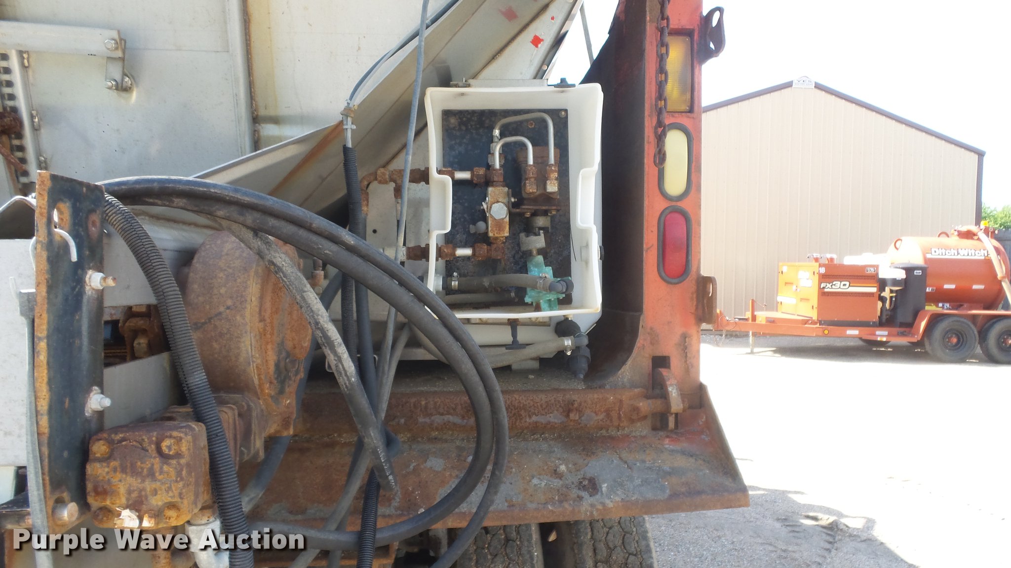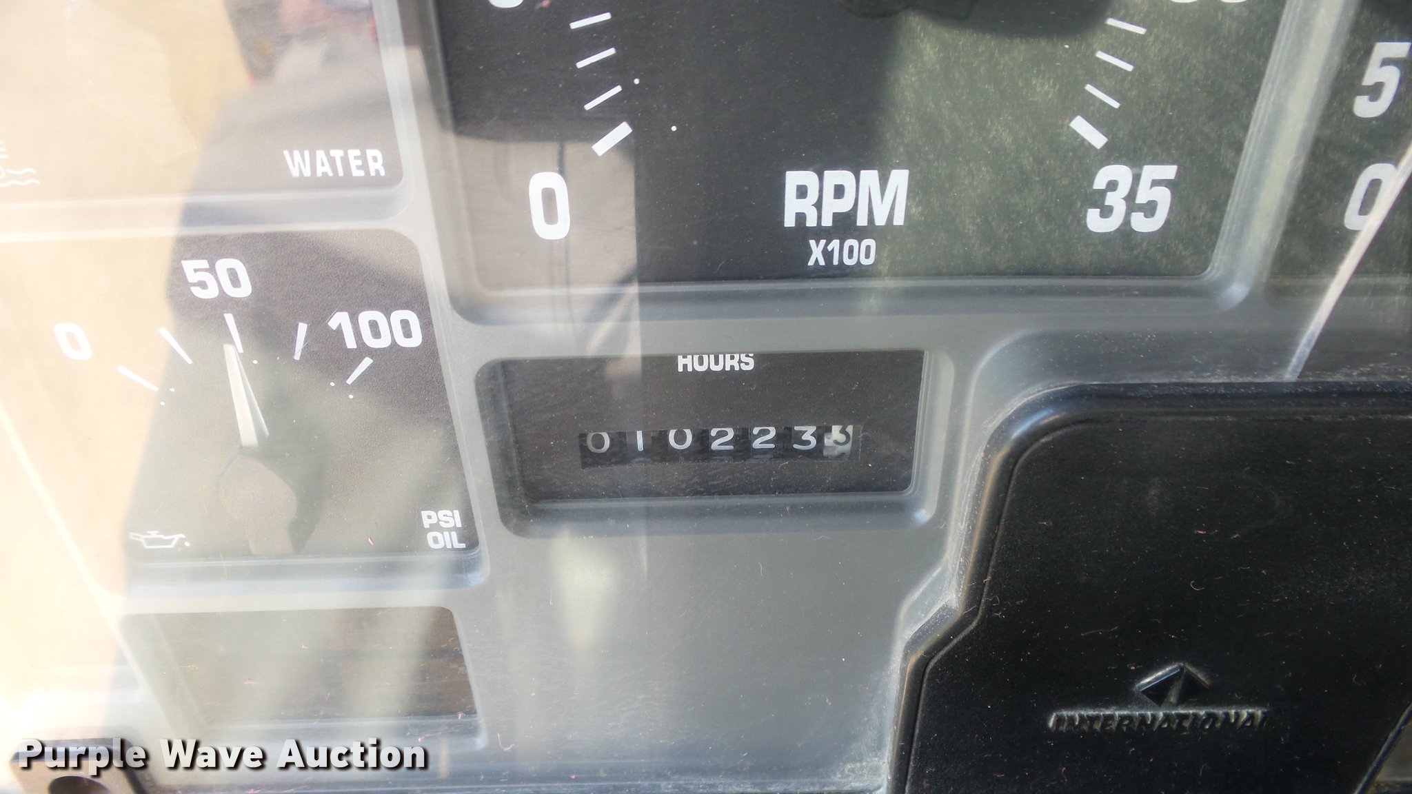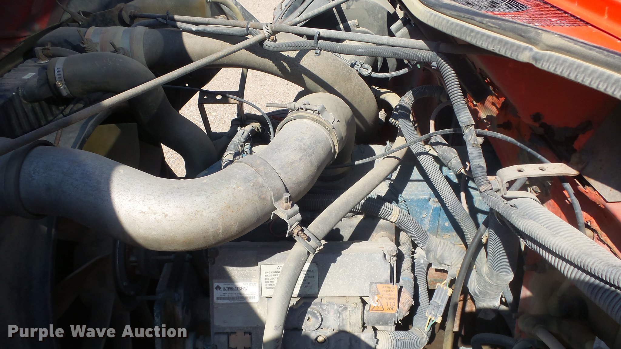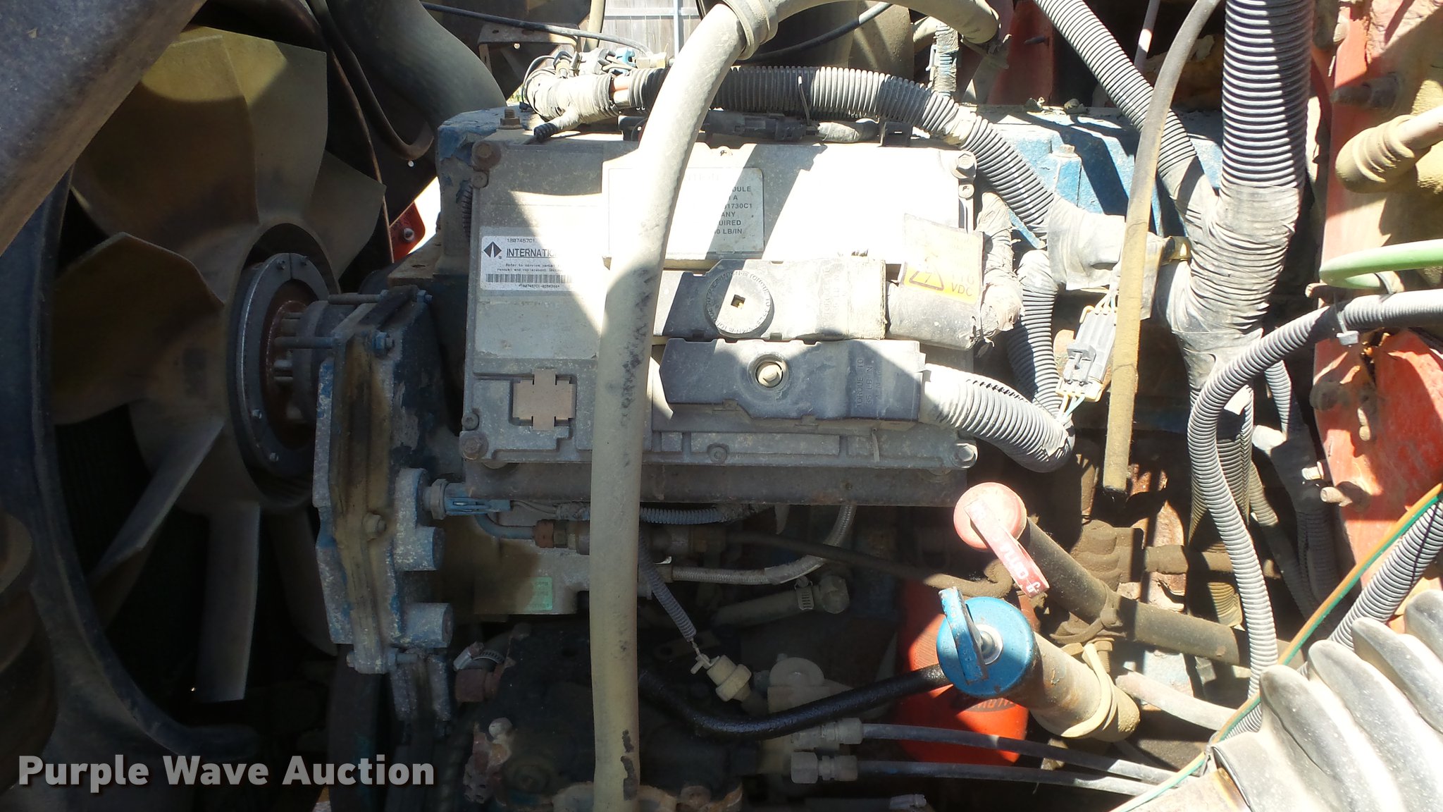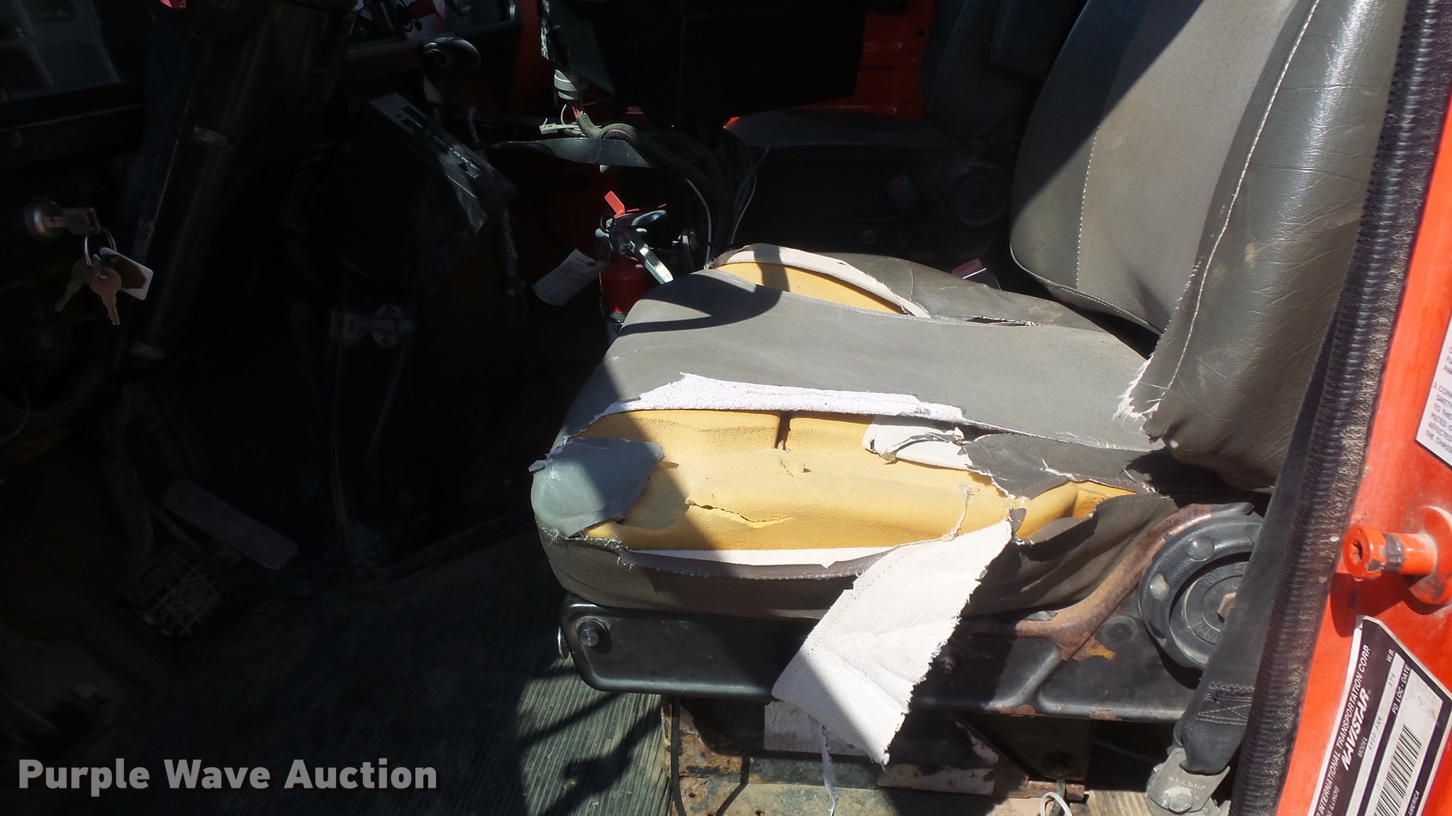 Purple Wave is selling a used Construction Dump Truck in Kansas. This item is a 1999 International 4900 dump truck with the following: 221,883 miles on odometer, 10,223 hours on meter, International DT530 8.7L L6 diesel engine, Automatic transmission, Tandem axle, Power divider lock, AC and heat, Cruise, Heated mirrors, Air suspension seat, Vinyl interior, Beacon light, Gresen cab controls, 13'L x 8'W steel dump bed, 45" side height, Roll tarp, 11'W plow, Lights, Stainless steel spreader, Single fuel tank, Pintle hitch, Spring suspension, Air brakes, 11R22.5 front tires, 295/75R22.5 rear tires