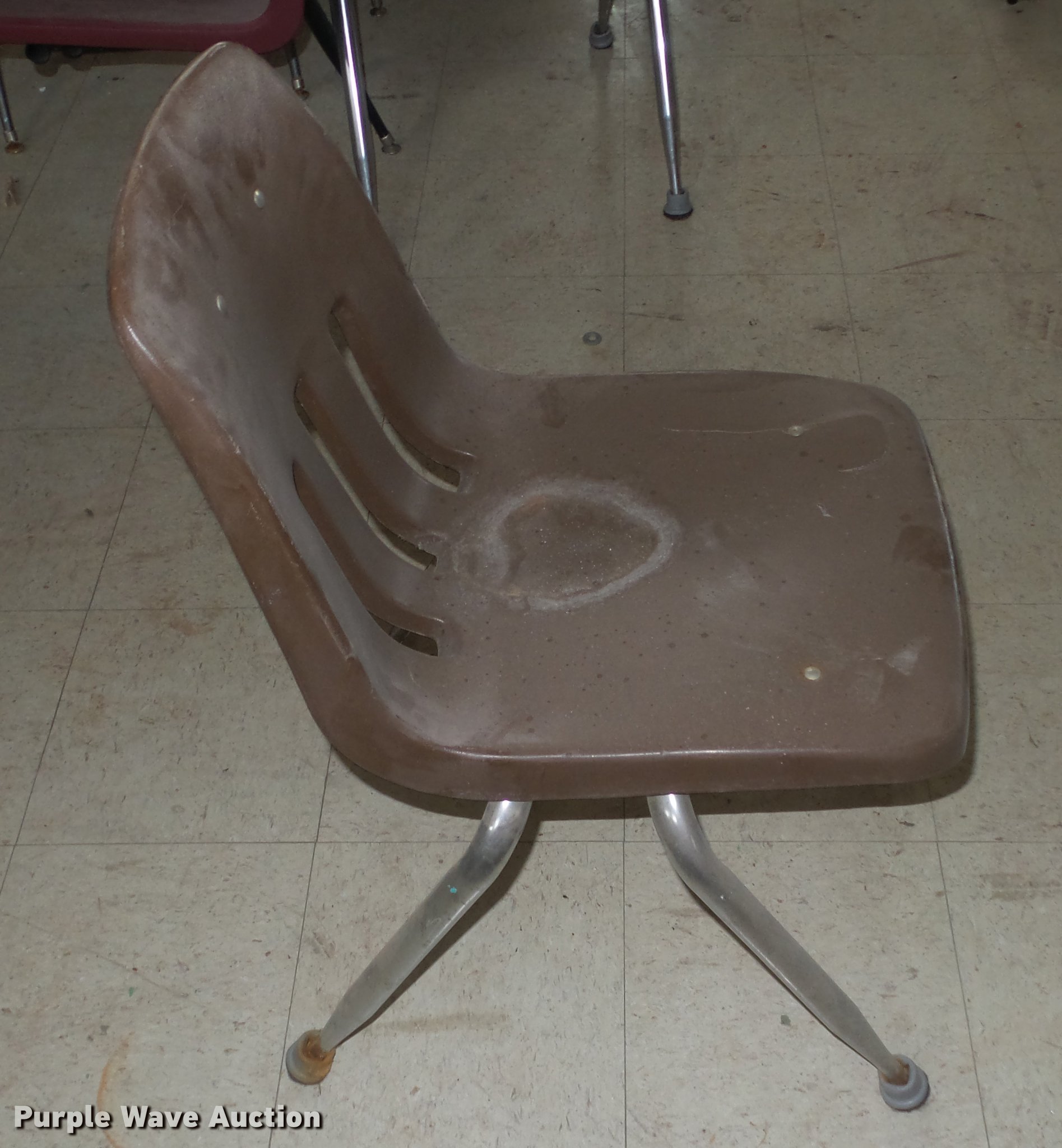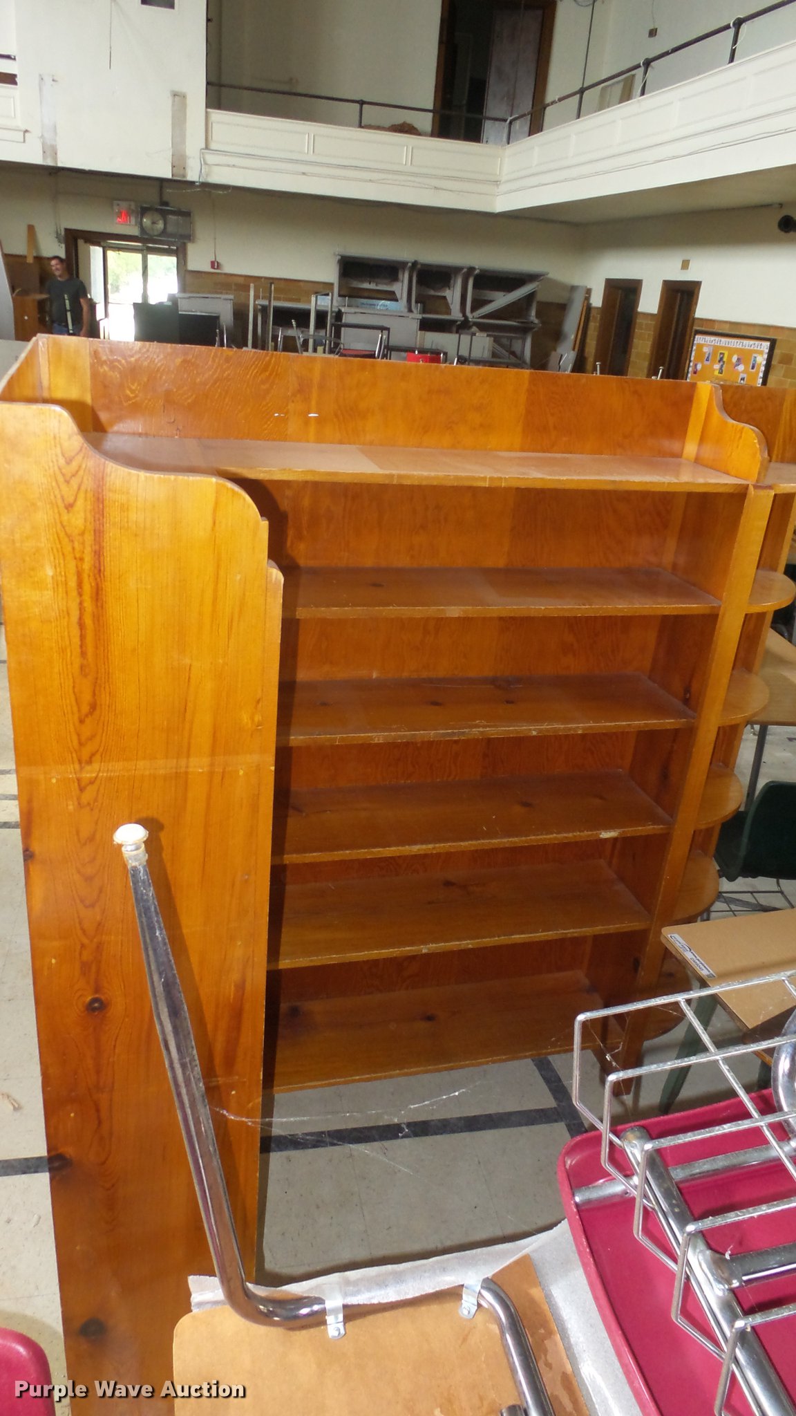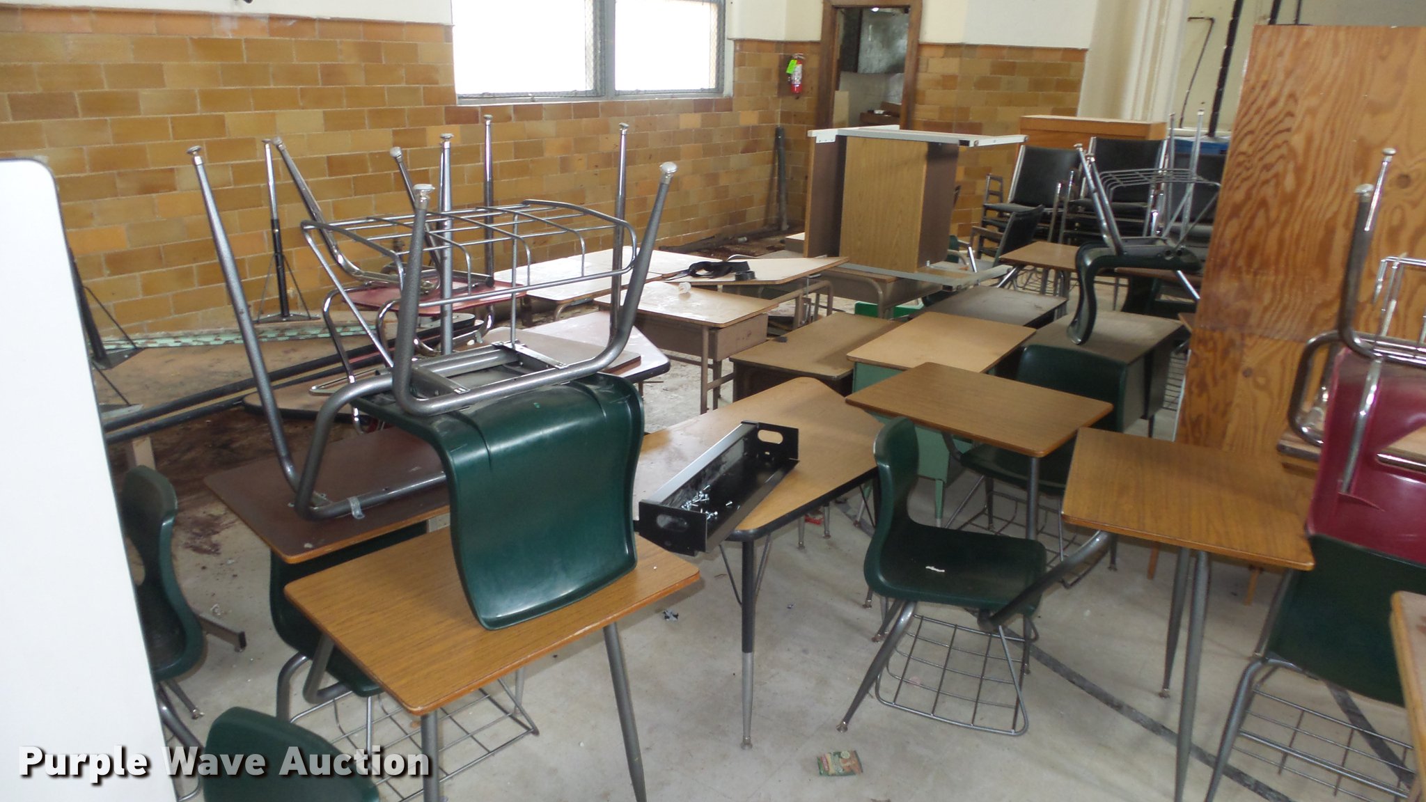 Purple Wave is selling a used Furniture in Kansas. This item is a Furniture with the following: School desks, Various styles and conditions, Wood cabinet, Chairs, Tables, Wood shelf