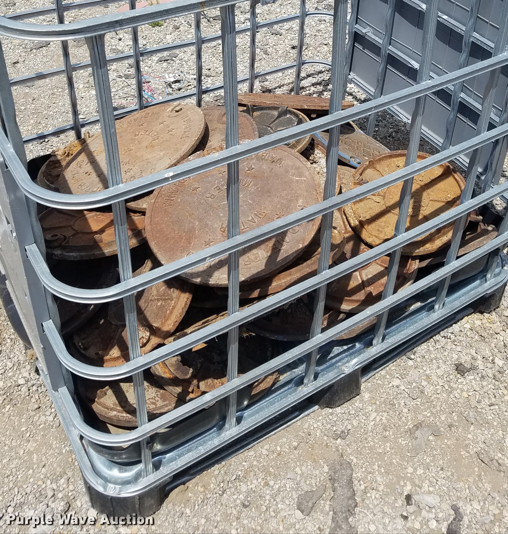 Purple Wave is selling a used Building Materials in Kansas. This item is a (50) cast iron water meter lids with the following: Various sizes, Steel frame skid, Tote not included