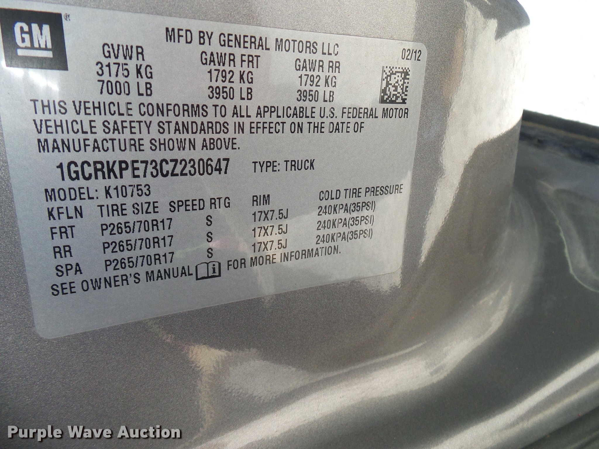 Purple Wave is selling a used 1/2 Ton Pickup or Van in Oklahoma. This item is a 2012 Chevrolet Silverado 1500 Ext. Cab pickup truck with the following: 104,289 miles on odometer, 5.3L V8 OHV 16V gas engine, Automatic transmission, Four wheel drive, AC and heat, Tilt, Cruise, Power locks, windows, and mirrors, Vinyl interior, Front tow hooks, Grill guard, Toolbox, Trailer wiring, Receiver hitch, LT265/70R17 tires, Check engine light on, Code P0446 - Evaporative Emission Control System Vent Control Circuit Malfunction, Code P0455 - Evaporative Emission Control System Purge Control Valve Circuit Shorted