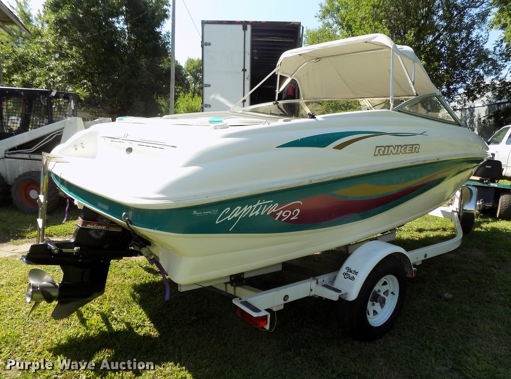 Purple Wave is selling a used Boat in Nebraska. This item is a 1996 Rinker Captiva 192 boat with the following: 18'11" hull length, Mercruiser 4.3L six cylinder gas engine, AM/FM/CD/DVD, Eight person or 1,200 lbs capacity, Alpha One out drive, Hull I.D. RNK51114K596, 1996 Yacht Club trailer, 19'L, Winch, 2" ball hitch, ST215/75D14 tires, Additional prop included, Anchor included, Battery not included