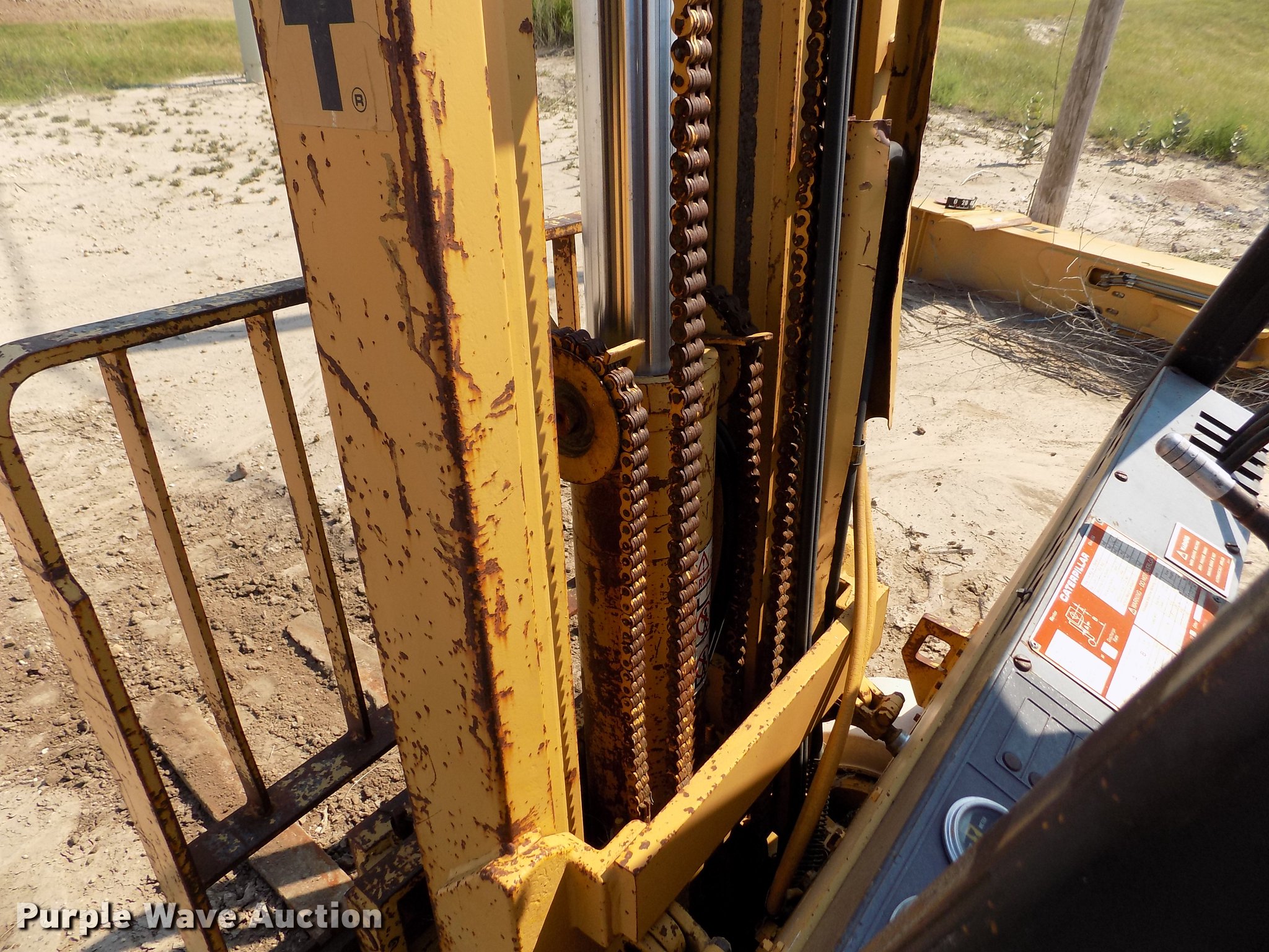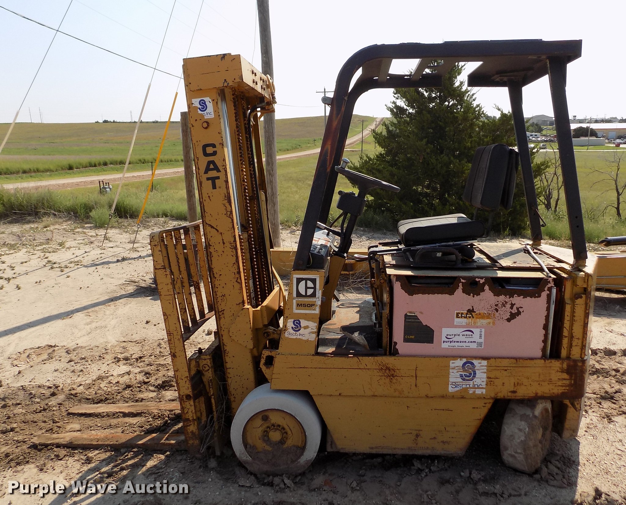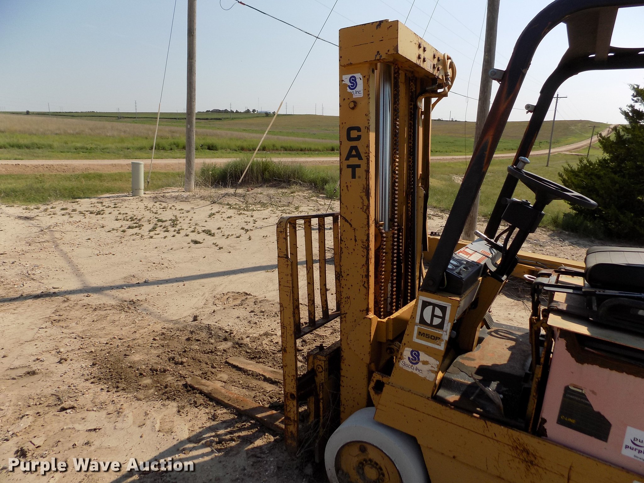 Caterpillar M50B forklift. 6,630 hours on meter, Electric operation, Manual transmission 1F-1R gears, OROPS, 5,000 lbs max lift capacity, 191" max lift height, Three stage mast Side shift, Mast tilt, 42" fork length, 18x8x12 1/8 non-marking solid tires, 16x6x10.5 non-marking solid tires, Charger not included, Non-operational unit, Serial 35Y00343. Foley Equipment. 1600 E Wyatt Earp Blvd. Dodge City, KS 67801