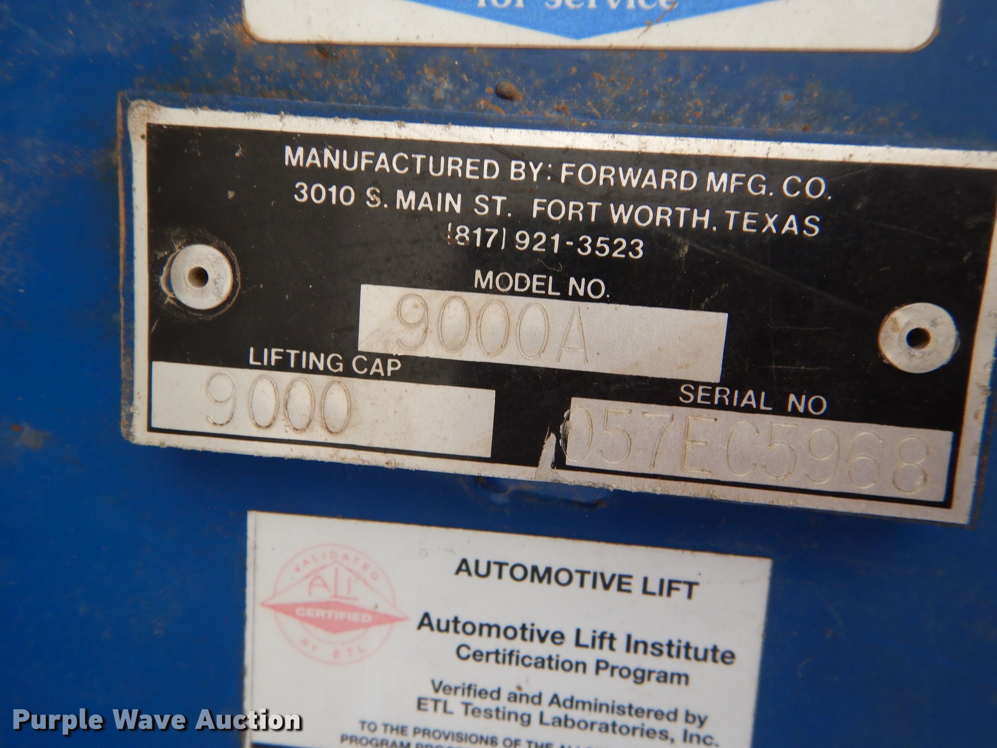 Purple Wave is selling a used Tools in Kansas. This item is a Forward 9000A automotive lift with the following: 9,000 lbs maximum lift capacity, Manuals, Unit has not been used in four years, Serial 057EC5968