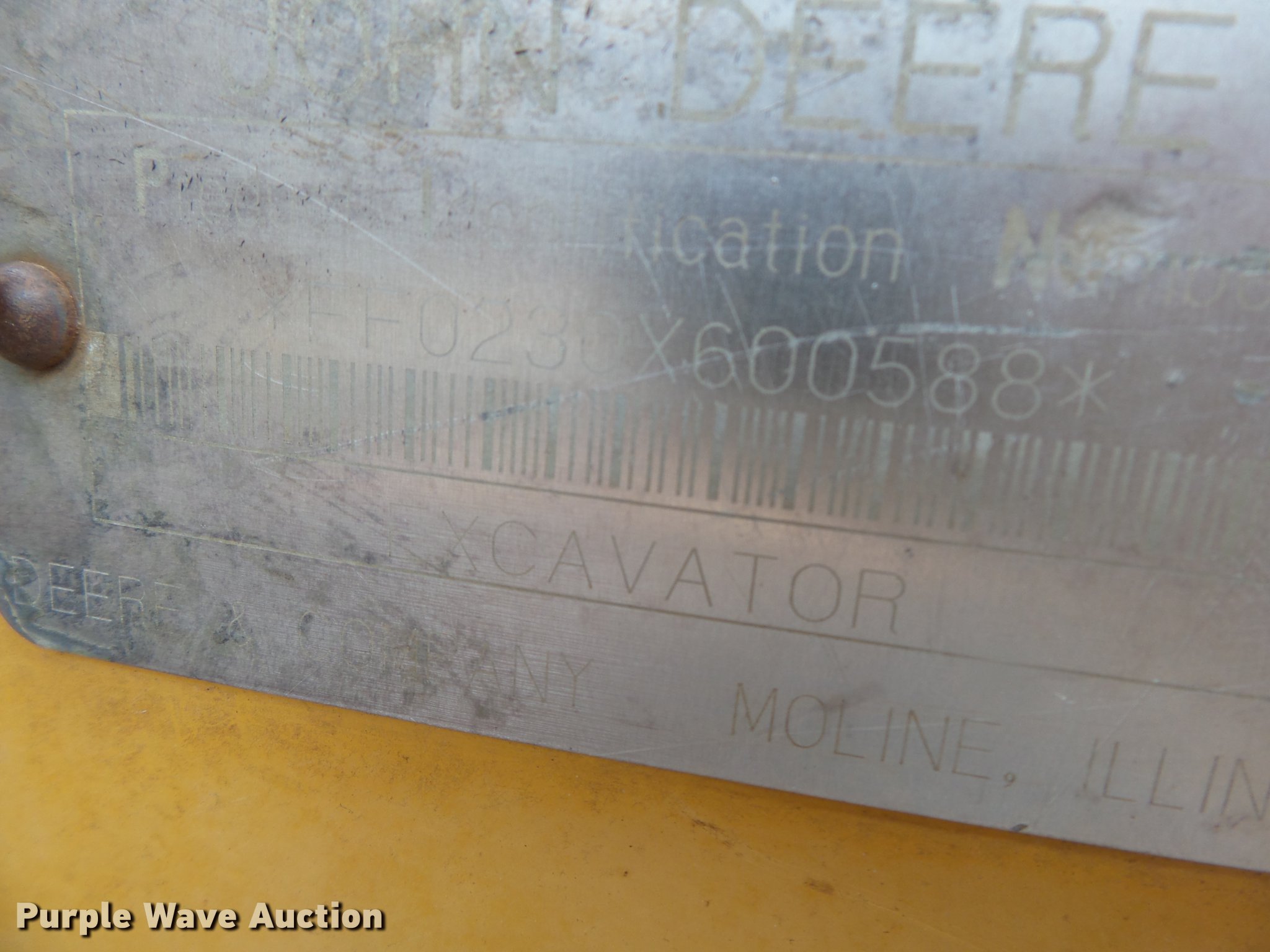 Purple Wave is selling a used Hydraulic Excavator in Missouri. This item is a 2000 John Deere 230LC excavator with the following: 4,270 hours on meter, John Deere 6068H 6.8L six cylinder turbo diesel engine, 180 HP, Two speed hydrostatic transmission, Enclosed cab, AC and heat, AM/FM, Suspension seat, Standard boom, 10' stick length, 60"W bucket, (6) bolt-on teeth, 31.5"W steel triple grouser track pads, Serial FF0230X600588