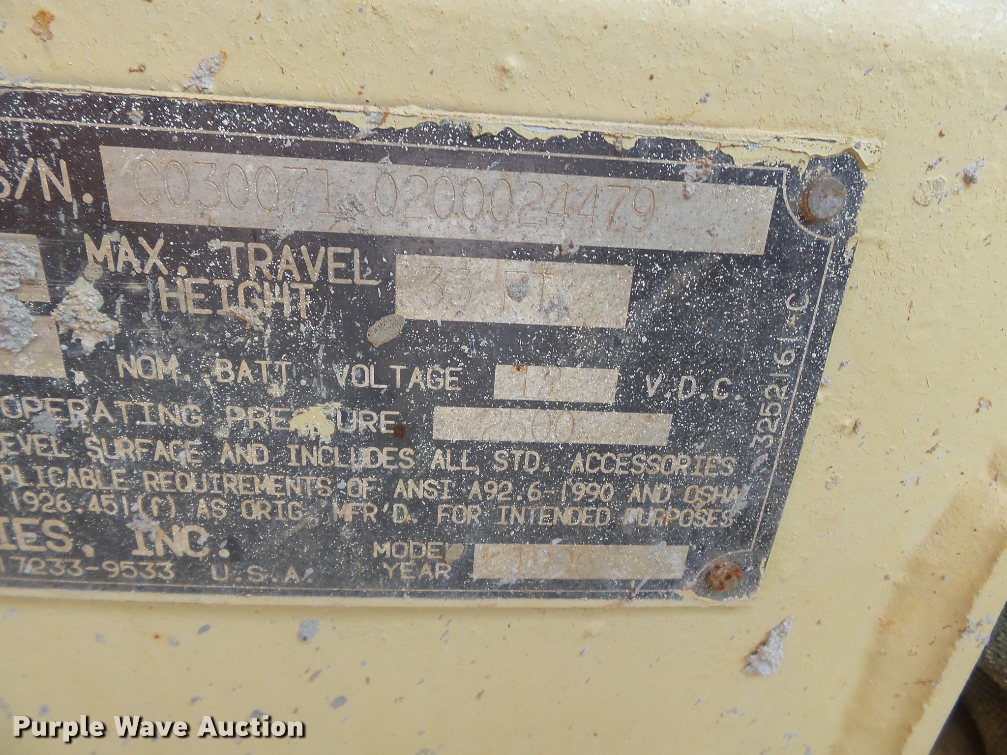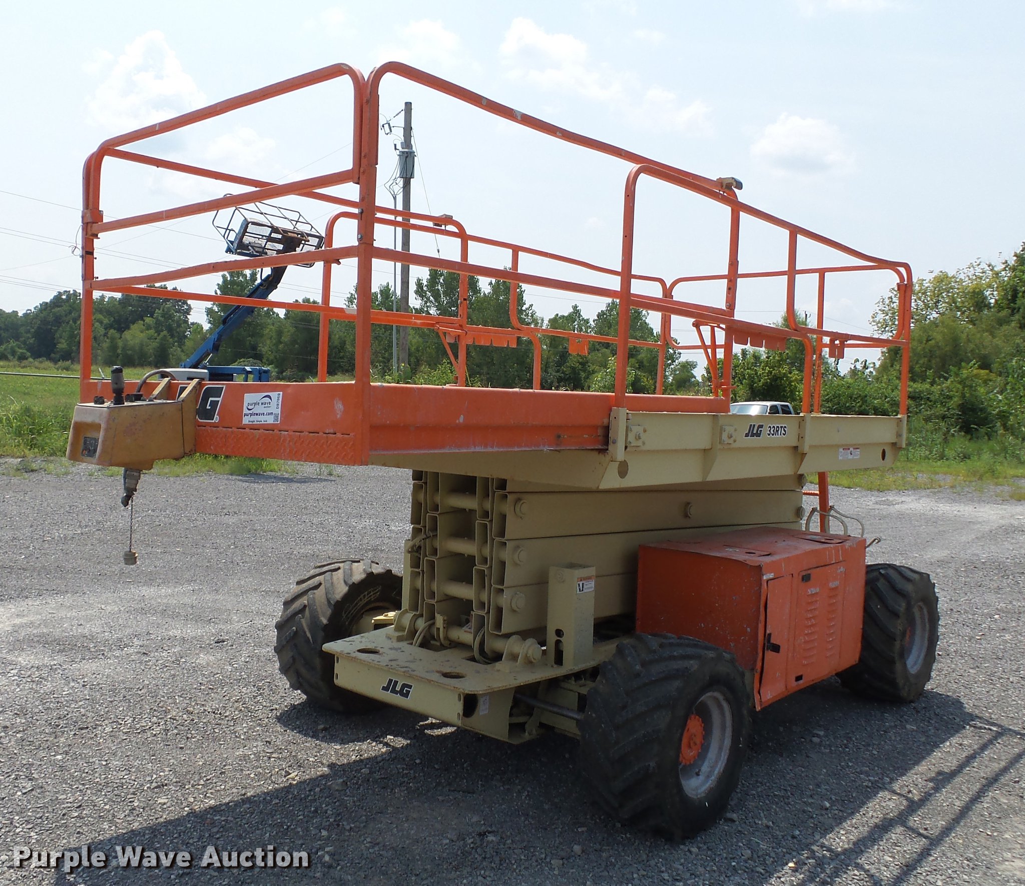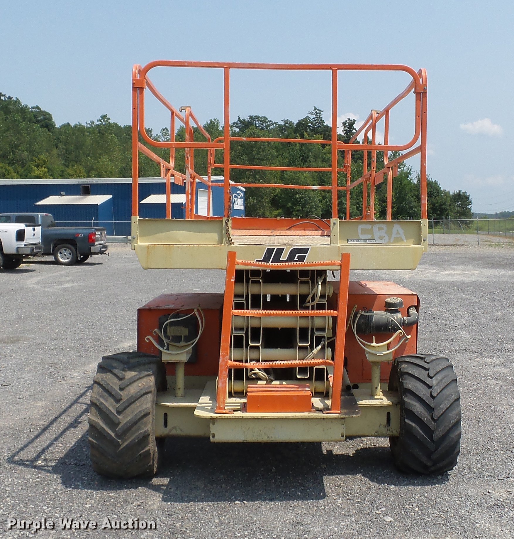 Purple Wave is selling a used Scissor or Vertical Lift in Missouri. This item is a JLG 33RTS scissor lift with the following: 6,224 hours on meter, 2.3L four cylinder dual fuel engine, Four wheel drive, 500 lbs maximum lift capacity, 33' maximum lift height, 10.5'L x 6'W platform, Ground and platform controls, Manual platform extensions, 31 x 15.5 x 15NHS pneumatic tires, Serial 0030071-0200024479