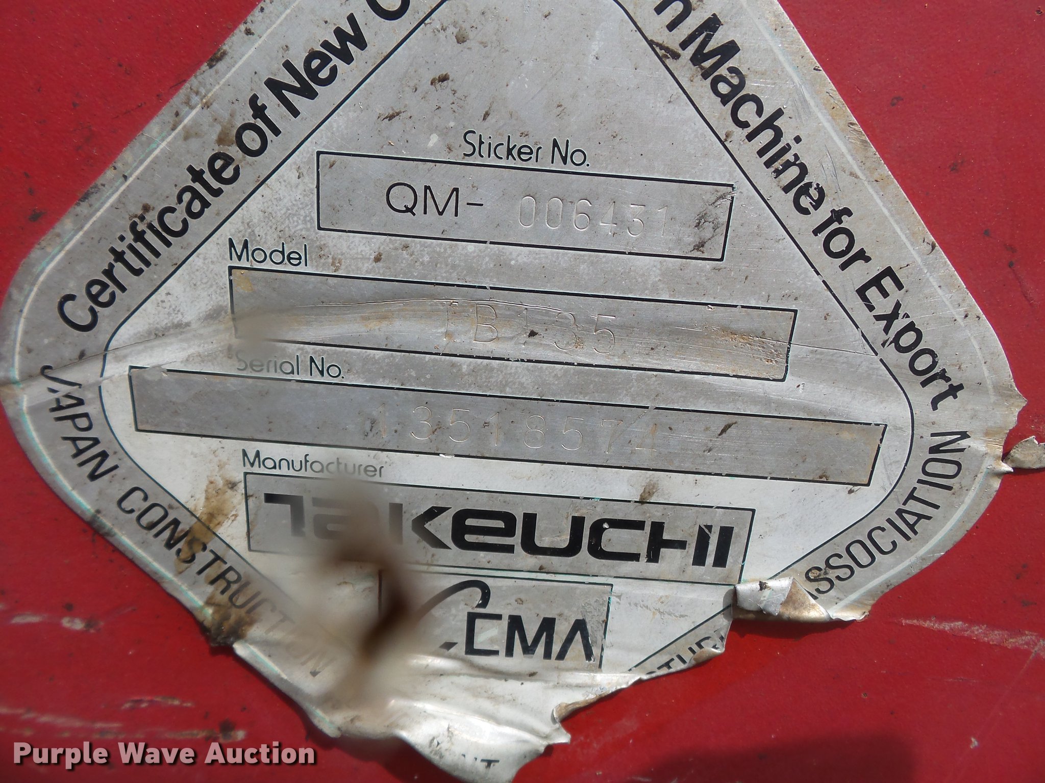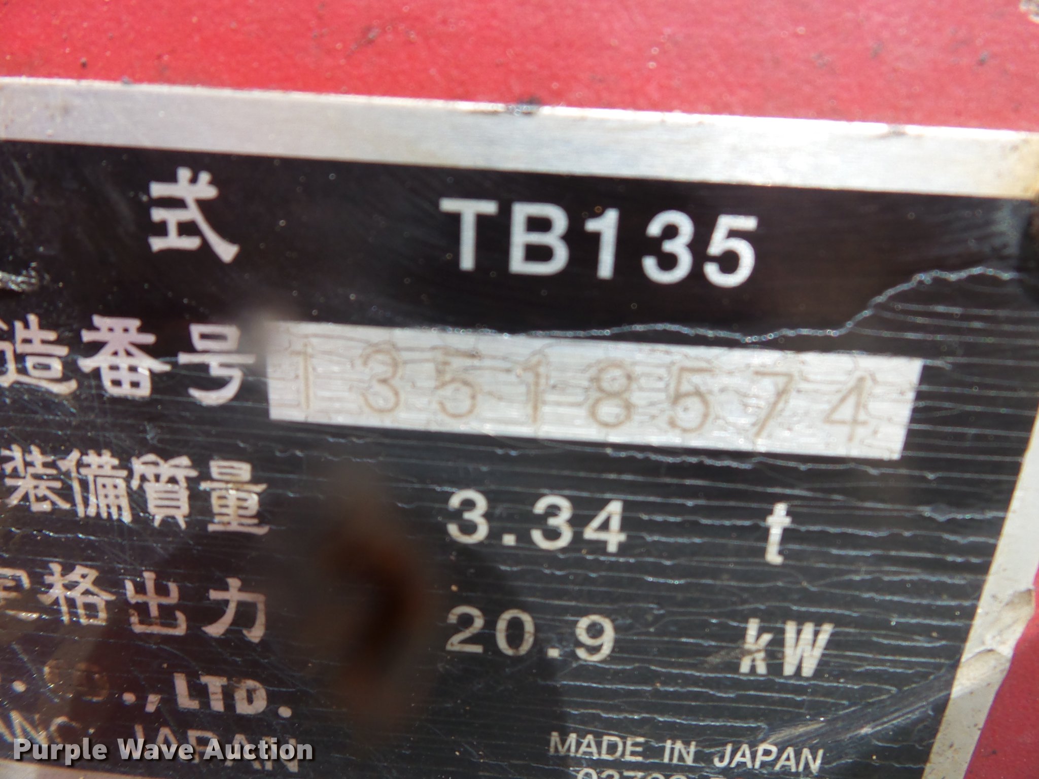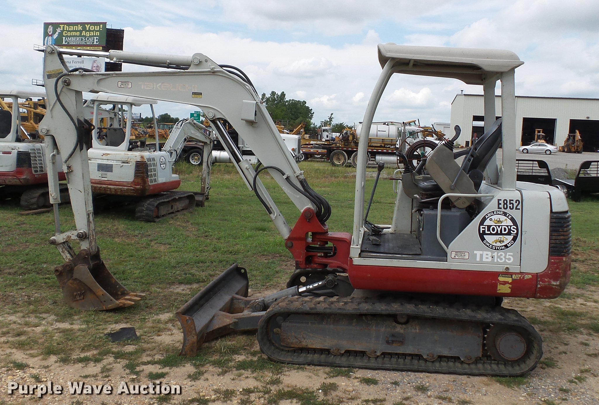 Purple Wave is selling a used Mini Excavator in Missouri. This item is a 2007 Takeuchi TB135 mini excavator with the following: 3,231 hours on meter, Yanmar 3TNV88Q 1.642L three cylinder diesel engine, 21.3 kW, Two speed hydrostatic transmission, EROPS, Suspension seat, Front work lights, Standard boom, Tag 12"W bucket, (3) bolt-on teeth, Thumb mount, 13.5"W rubber tracks, Serial 13518574, Unit# E852