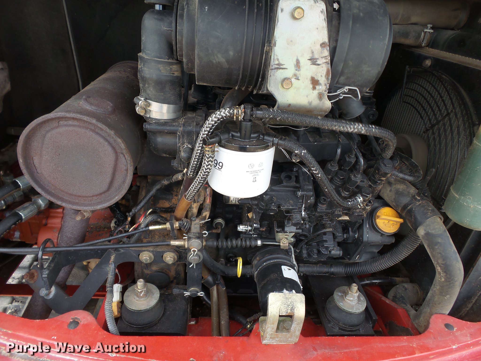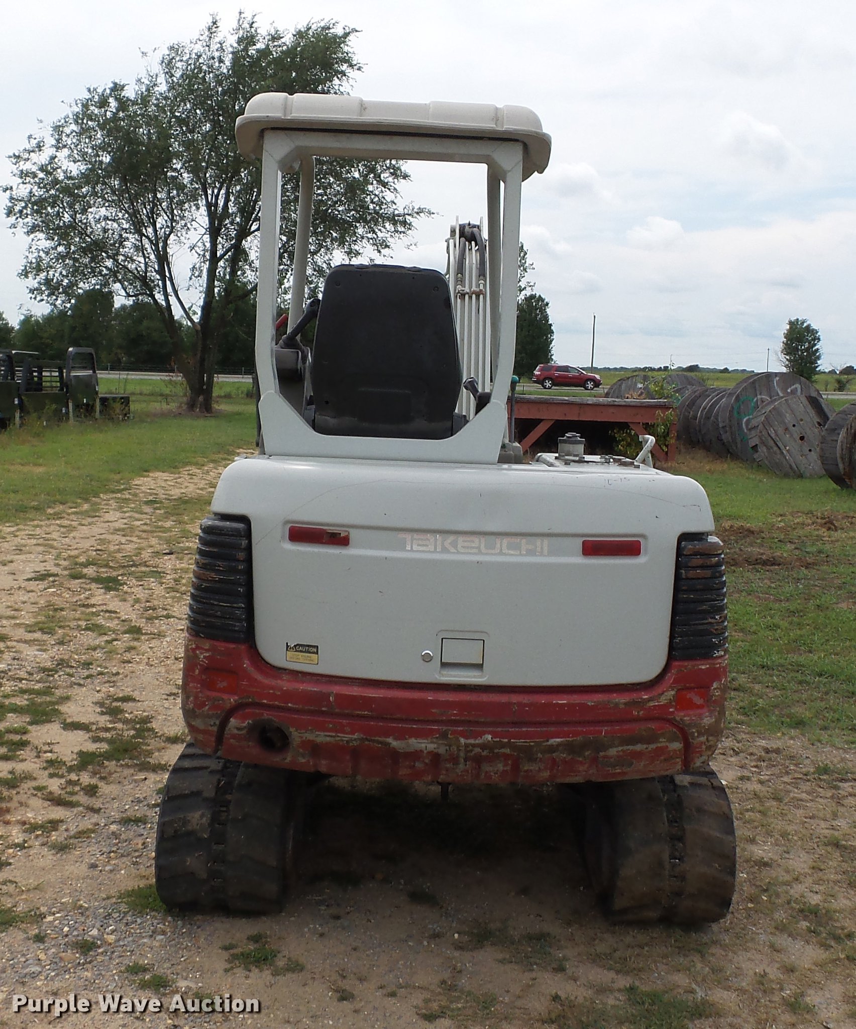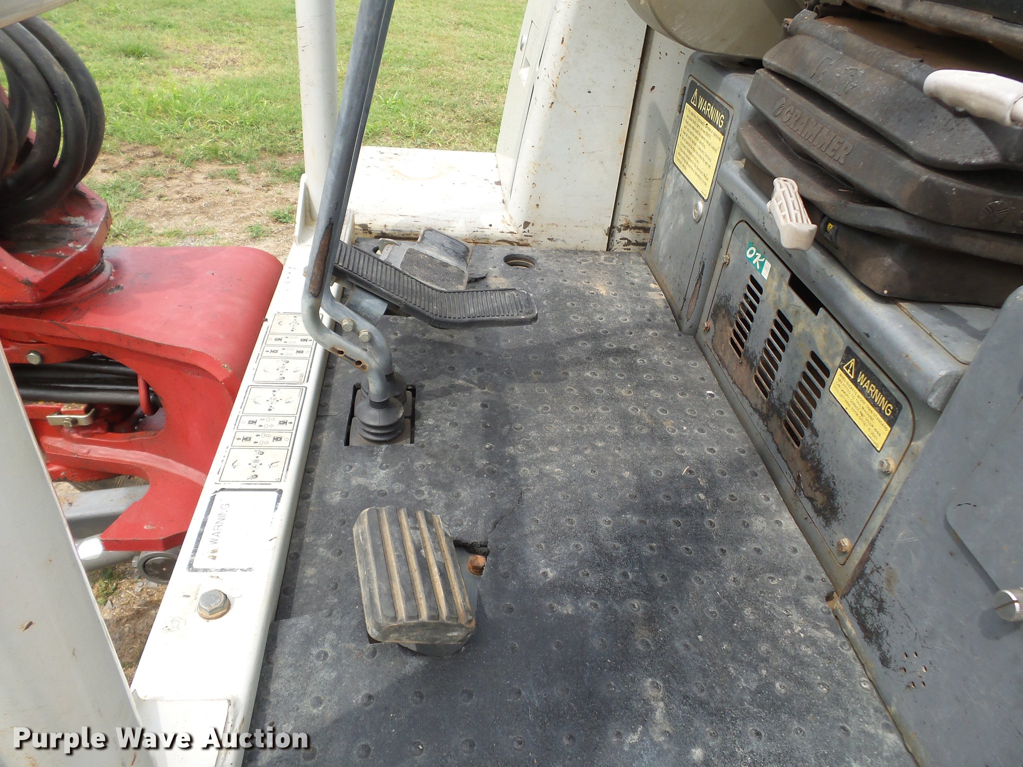 Purple Wave is selling a used Mini Excavator in Missouri. This item is a 2007 Takeuchi TB135 mini excavator with the following: 3,231 hours on meter, Yanmar 3TNV88Q 1.642L three cylinder diesel engine, 21.3 kW, Two speed hydrostatic transmission, EROPS, Suspension seat, Front work lights, Standard boom, Tag 12"W bucket, (3) bolt-on teeth, Thumb mount, 13.5"W rubber tracks, Serial 13518574, Unit# E852