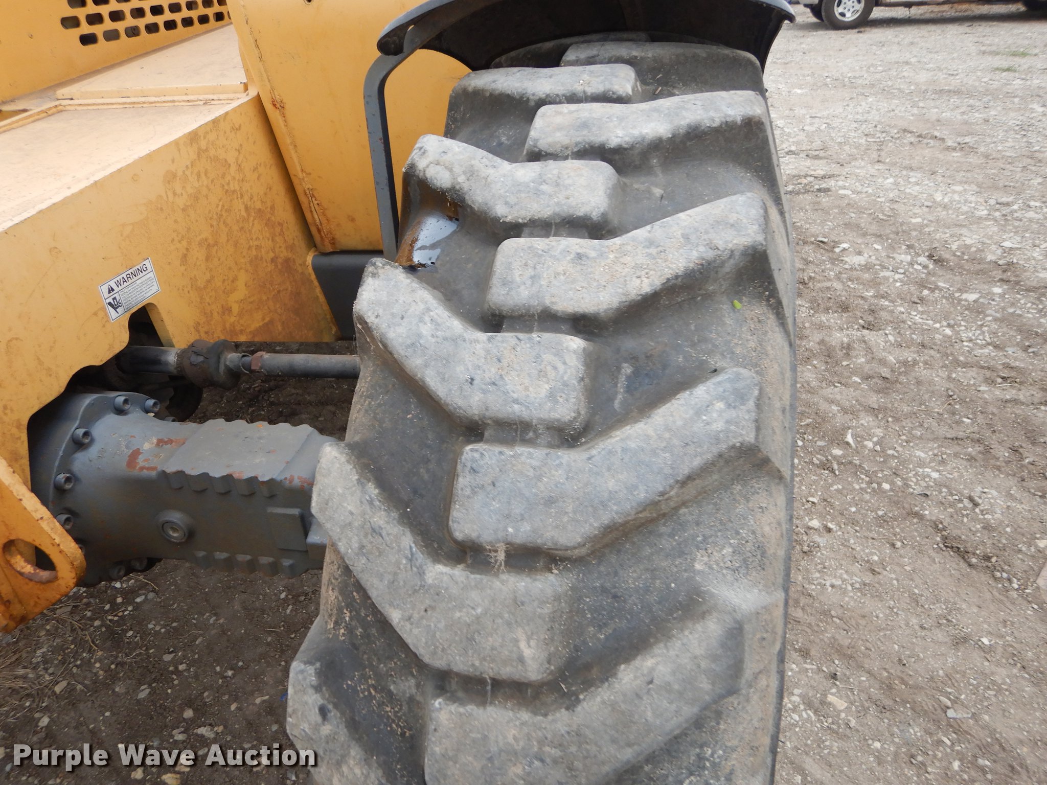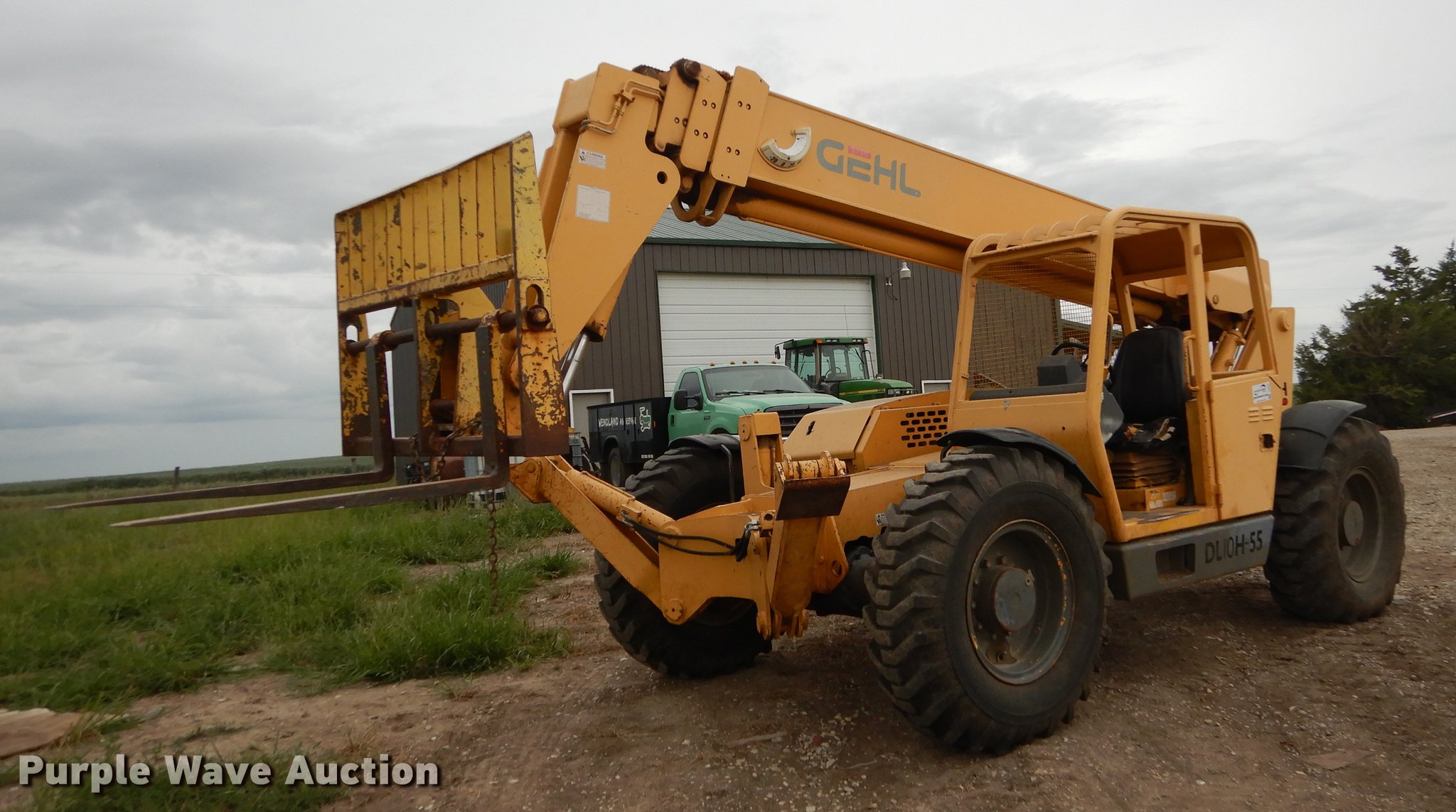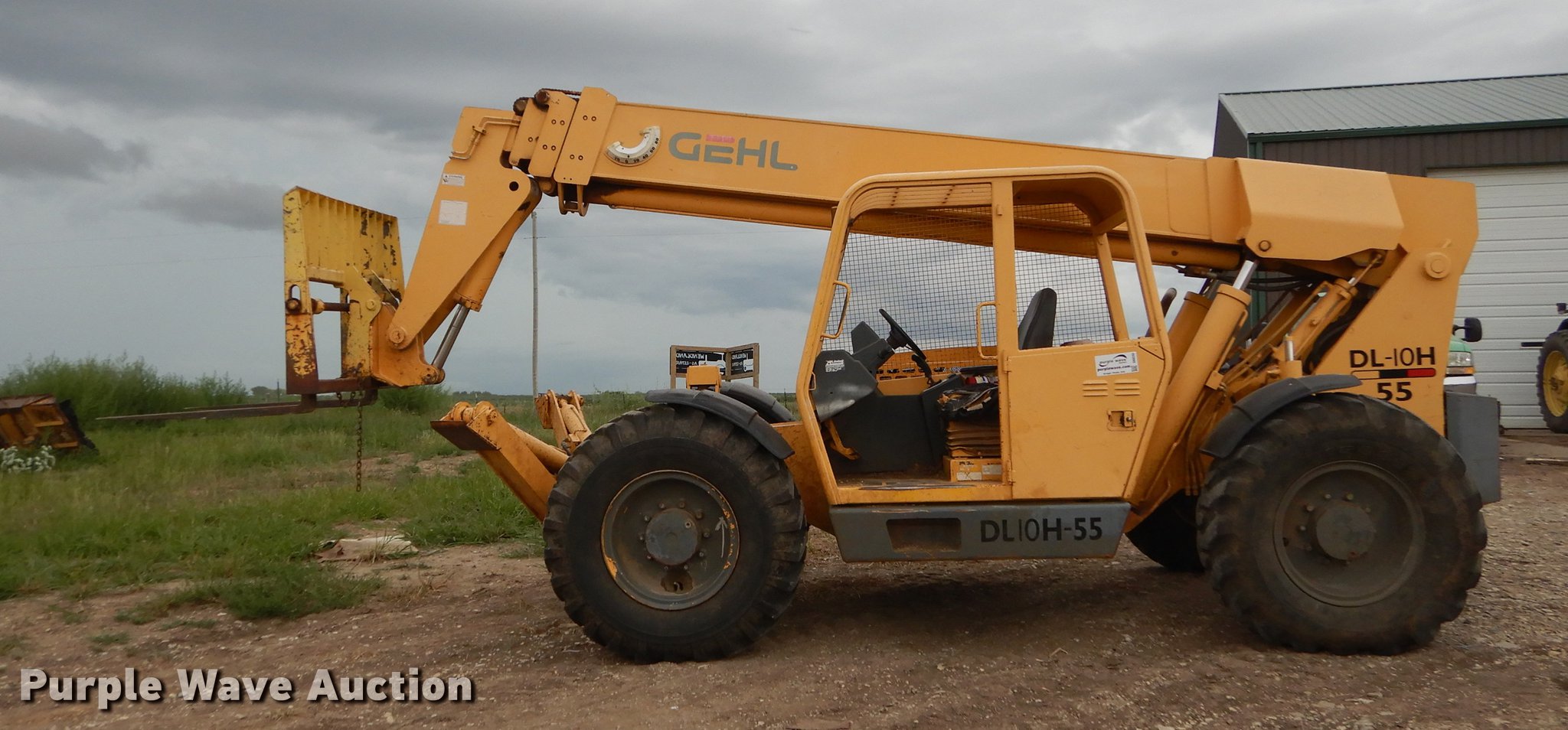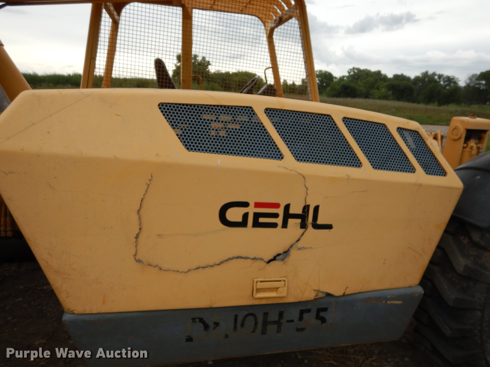 Purple Wave is selling a used Telehandler in Kansas. This item is a Gehl DL10H-55 telehandler with the following: 2,405 hours on meter, John Deere four cylinder turbo diesel engine, Four wheel drive, OROPS, Tilt cab, 10,000 lbs maximum lift capacity, 55' maximum lift height, 45' maximum reach, Three boom stages, 4'L x 4"W forks, Hydraulic outriggers, counter weights, 14.00-24 tires, Battery weak, Hood damaged, Hose leaking antifreeze