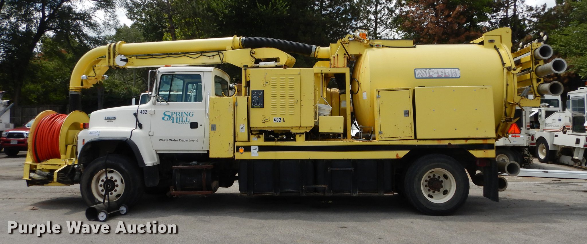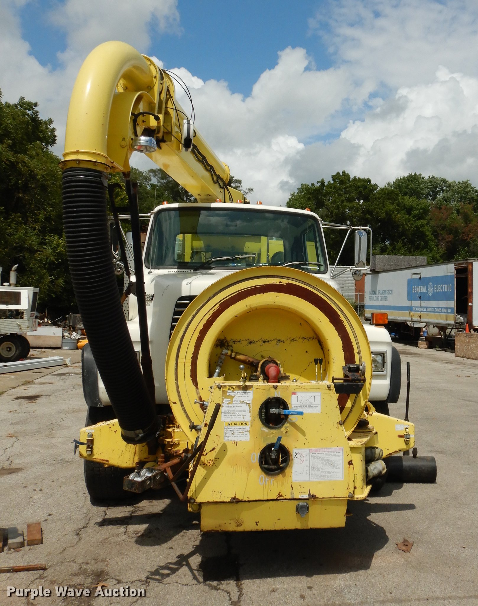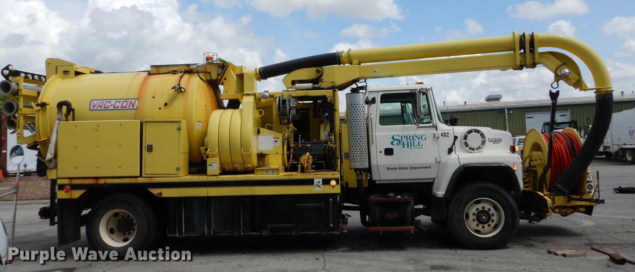 Purple Wave is selling a used Vacuum Truck in Kansas. This item is a 1996 Ford LN8000 vacuum truck with the following: 32,549 miles on odometer, 5,618 hours on meter, Cummins 8.3L L6 diesel engine, Allison automatic trasnmission, Heat, AM/FM, Vacuum unit, 255 hours on meter, John Deere diesel engine, Serial T04039T527934, Storage boxes, Nine cu.yd. debris tank, 1,000 gallon water tank, 65 gallon per minute capacity at 3,000 psi, 10' to 22' boom reach, Hose reel, 600' hose, Arrow board, Work lights, Dual fuel tanks, 224" wheelbase, Spring suspension, Air brakes, 315/65R22.5 front tires, 11R22.5 rear tires, GVWR 45,000 lbs, FAWR 18,000 lbs, RAWR 23,000 lbs