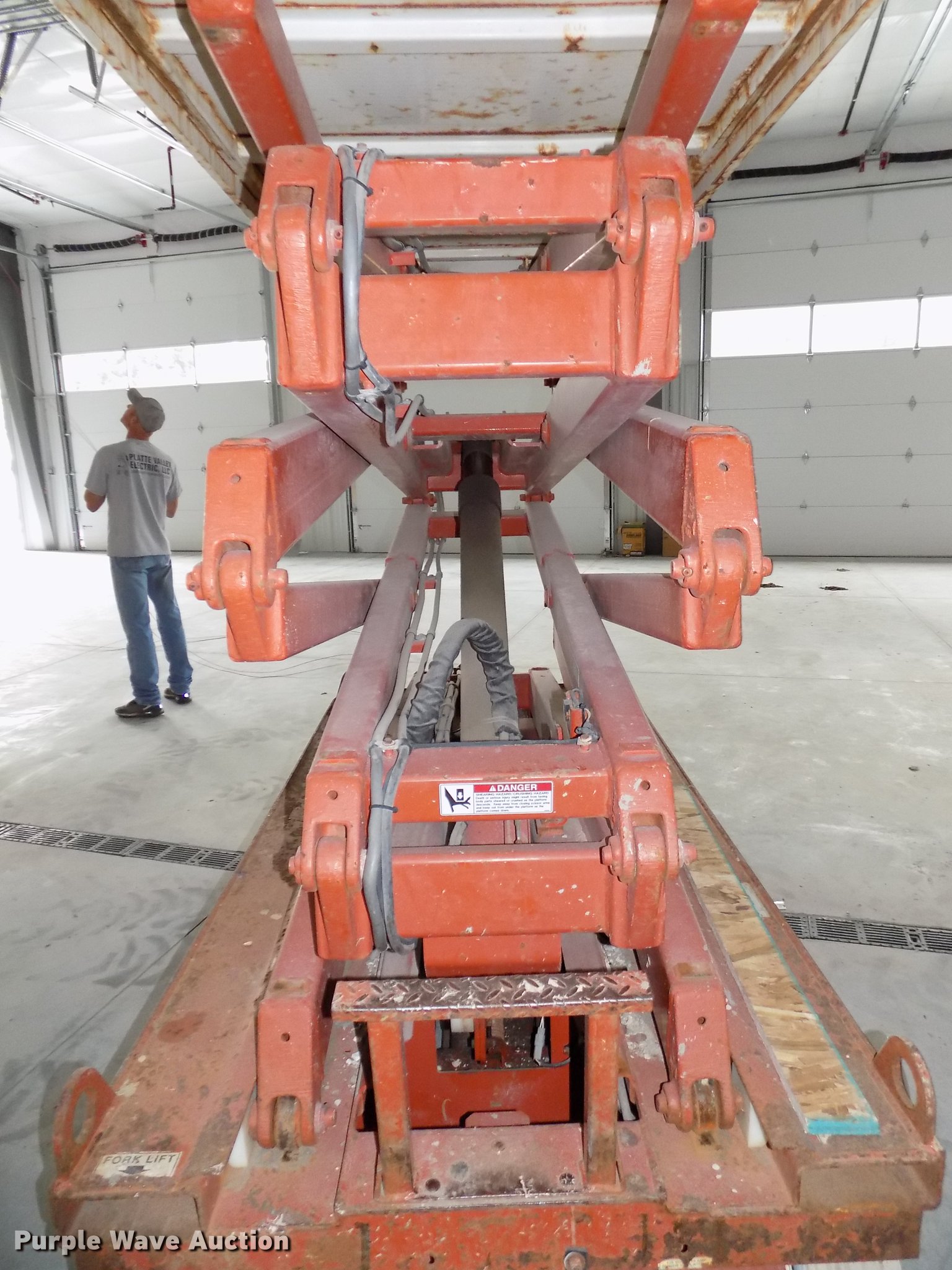 Snorkel SL25 scissor lift. 376 hours on meter, Electric operation, 850 lbs maximum lift capacity, 25' maximum lift height, 90"L x 44"W platform 36" manual platform extensions 250 lbs maximum lift capacity extended, AC power outlet, Platform and ground controls, Safety alarm, Pot hole protectors, Forklift pockets, Grounding strap, 16 x 5-8 solid non-marking tires, Unit# 254. TL Sund Inc.. 707 N. Ontario. Lexington, NE 68850