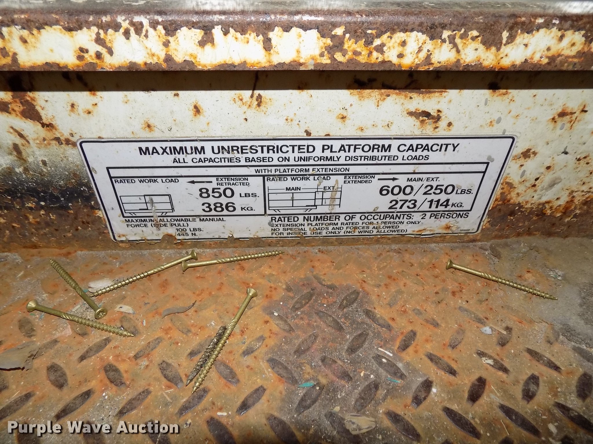 Purple Wave is selling a used Scissor or Vertical Lift in Nebraska. This item is a Snorkel SL25 scissor lift with the following: 376 hours on meter, Electric operation, 850 lbs maximum lift capacity, 25' maximum lift height, 90"L x 44"W platform, 36" manual platform extensions, 250 lbs maximum lift capacity extended, AC power outlet, Platform and ground controls, Safety alarm, Pot hole protectors, Forklift pockets, Grounding strap, 16 x 5-8 solid non-marking tires, Unit# 254