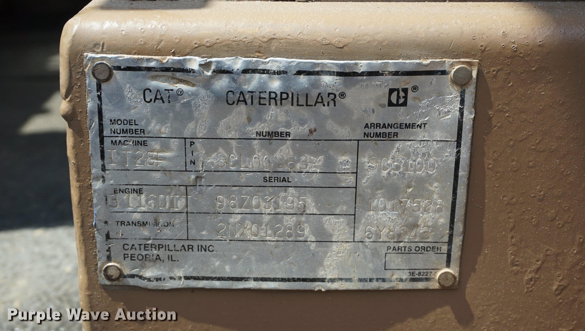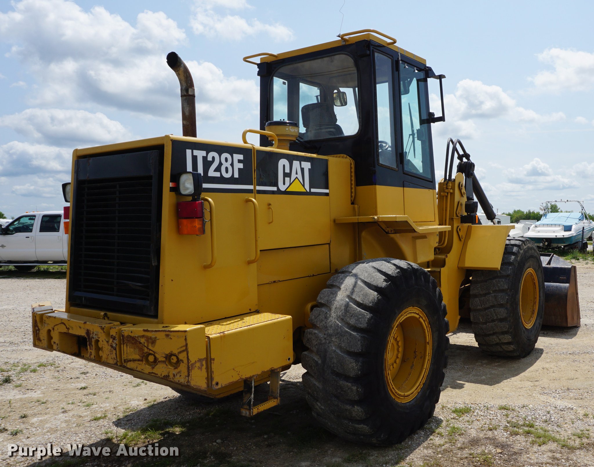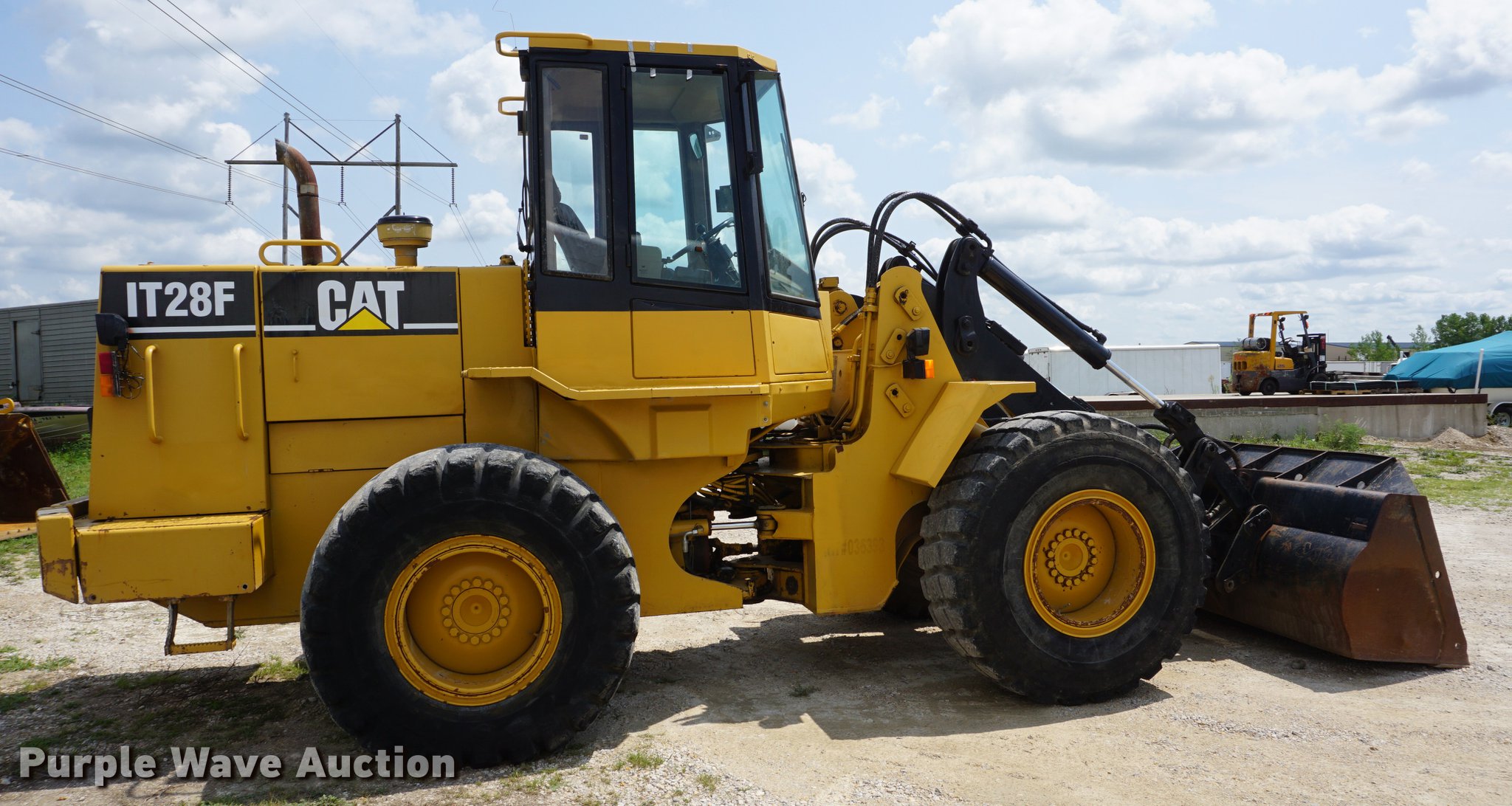 1993 Caterpillar IT28F wheel loader. 13,572 hours on meter, Caterpillar 3116 six cylinder turbo diesel engine 156 HP, Serial 98203195, Powershift transmission 4F-3R gears, Enclosed cab, Heat, Suspension seat, Two-lever bucket controls, 99"W general purpose bucket 2.2 cu. yd. capacity, Bolt-on cutting edge, Hydraulic quick coupler, 20.5-25 tires, Serial 3CL00363. Spring Hill, KS 66083