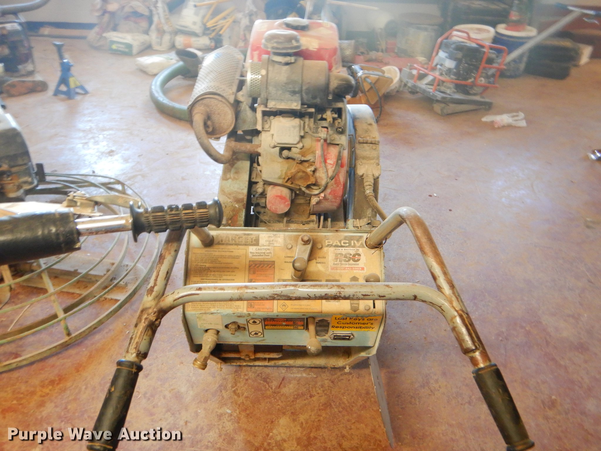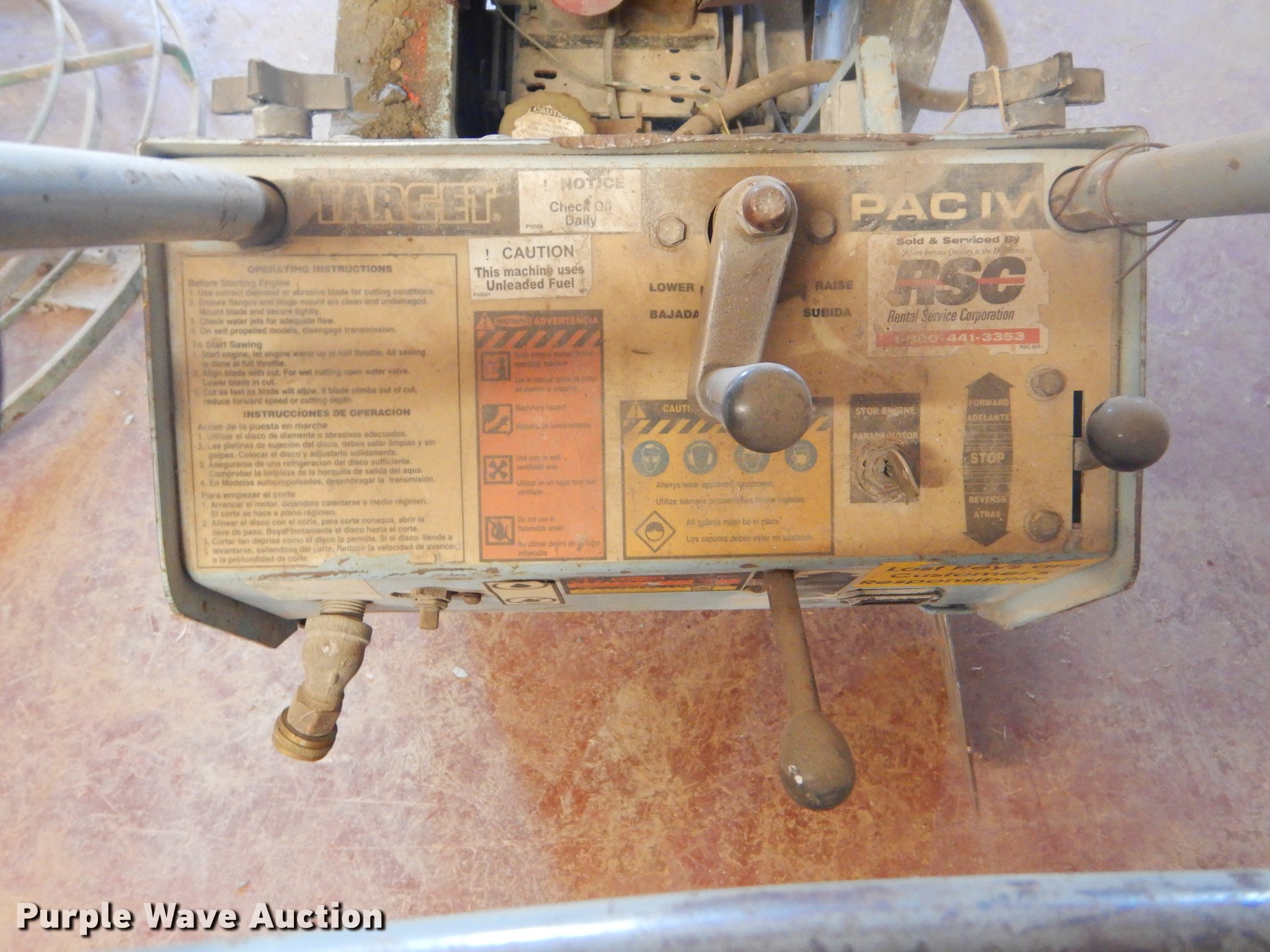 Concrete tools. Target PAC IV concrete saw 1,198 hours on meter, Gas engine, 13" blade capacity, Adjustable height, Additional blade included, Serial 296283, Whiteman concrete Trowel 45", Gas engine, Unknown operating conditions. Foot by Foot LLC. 2308 E 6th. Stillwater, OK 74076