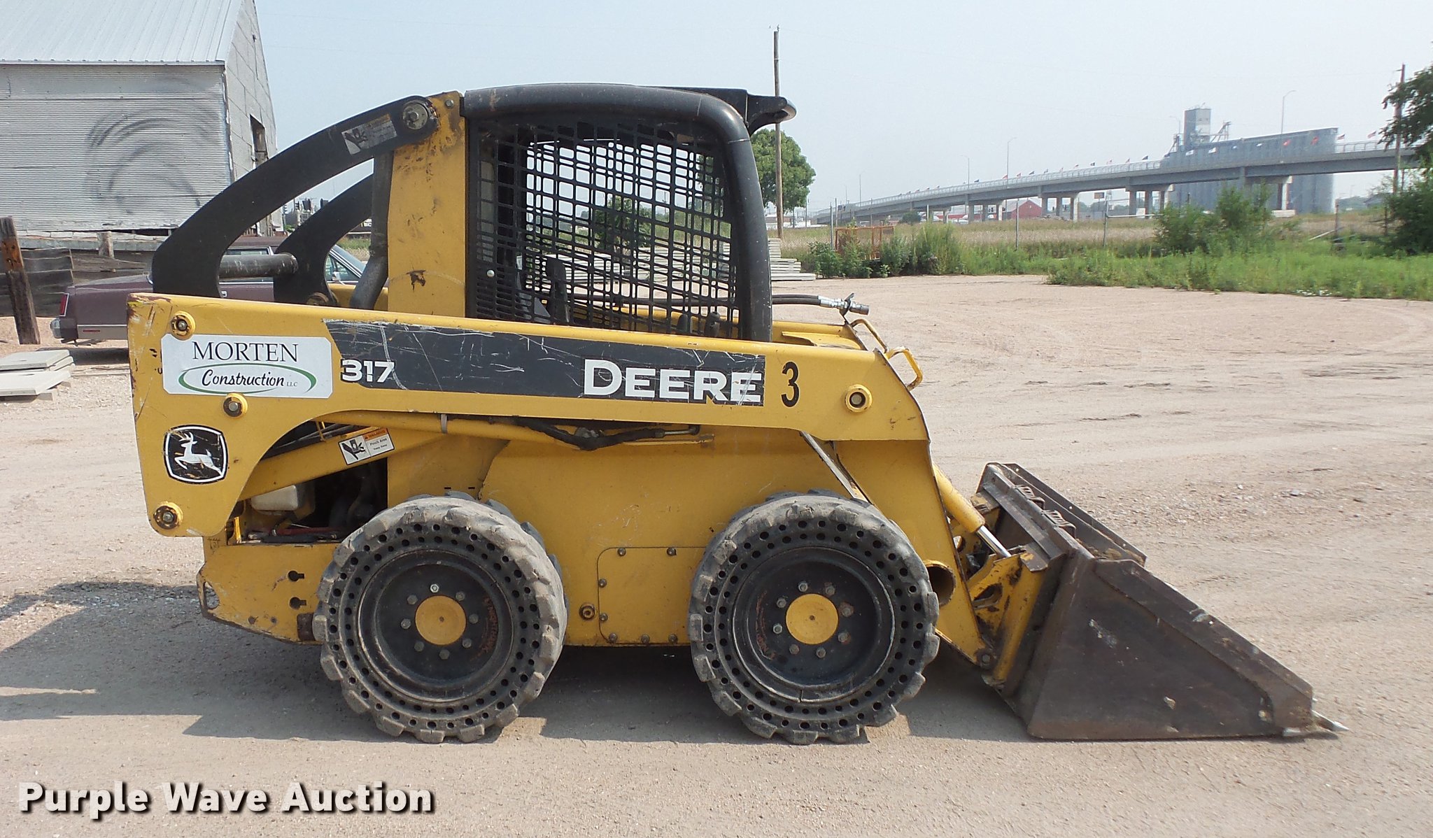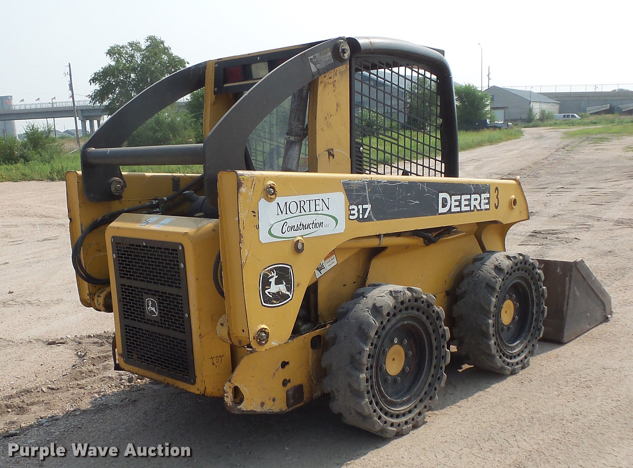 Purple Wave is selling a used Skid Steer Loader in Nebraska. This item is a 2008 John Deere 317 skid steer with the following: 2,134 hours on meter, John Deere 4024TT four cylinder turbo diesel engine, Hydrostatic transmission, Open station/canopy, Joystick controls, Front and rear work lights, 61"W bucket, Weld-on cutting edge, Bolt-on teeth, Manual quick coupler, Auxiliary hydraulics, 30 x 10-16 solid tires, Serial T00317A158487