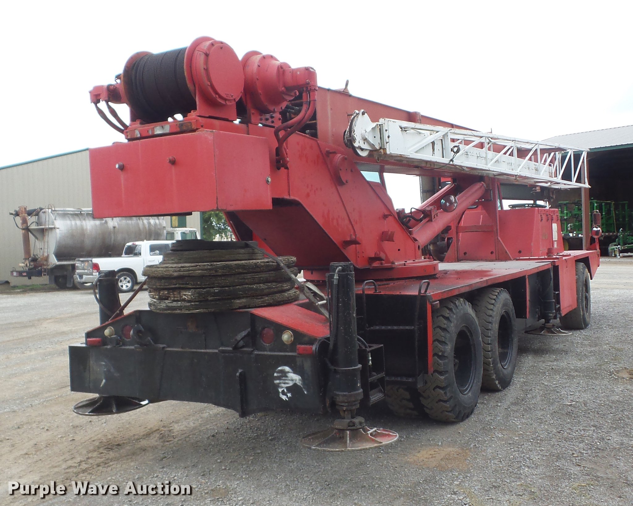 1983 Koehring Bantam T888B crane. 6,430 hours on meter, Detroit Diesel six cylinder turbo diesel engine, Eaton Fuller 13 speed manual transmission, Tandem axle, Differential lock, Heat, Stick crane controls, Air suspension seat, Telescopic boom, 76' boom length 30' jib, Three boom sections, 30 ton max lift capacity, (2) winches, In-cab boom controls, Three sheave crane block 30 ton capacity, Crane ball and hook, Stabilizers, 425/65R22.5 front tires, 10.00-20 rear tires, Oil leak on main boom cylinder, Serial 93121. Hutto Grain and Livestock. 6363 SE Messer Rd. Galena, KS 66739