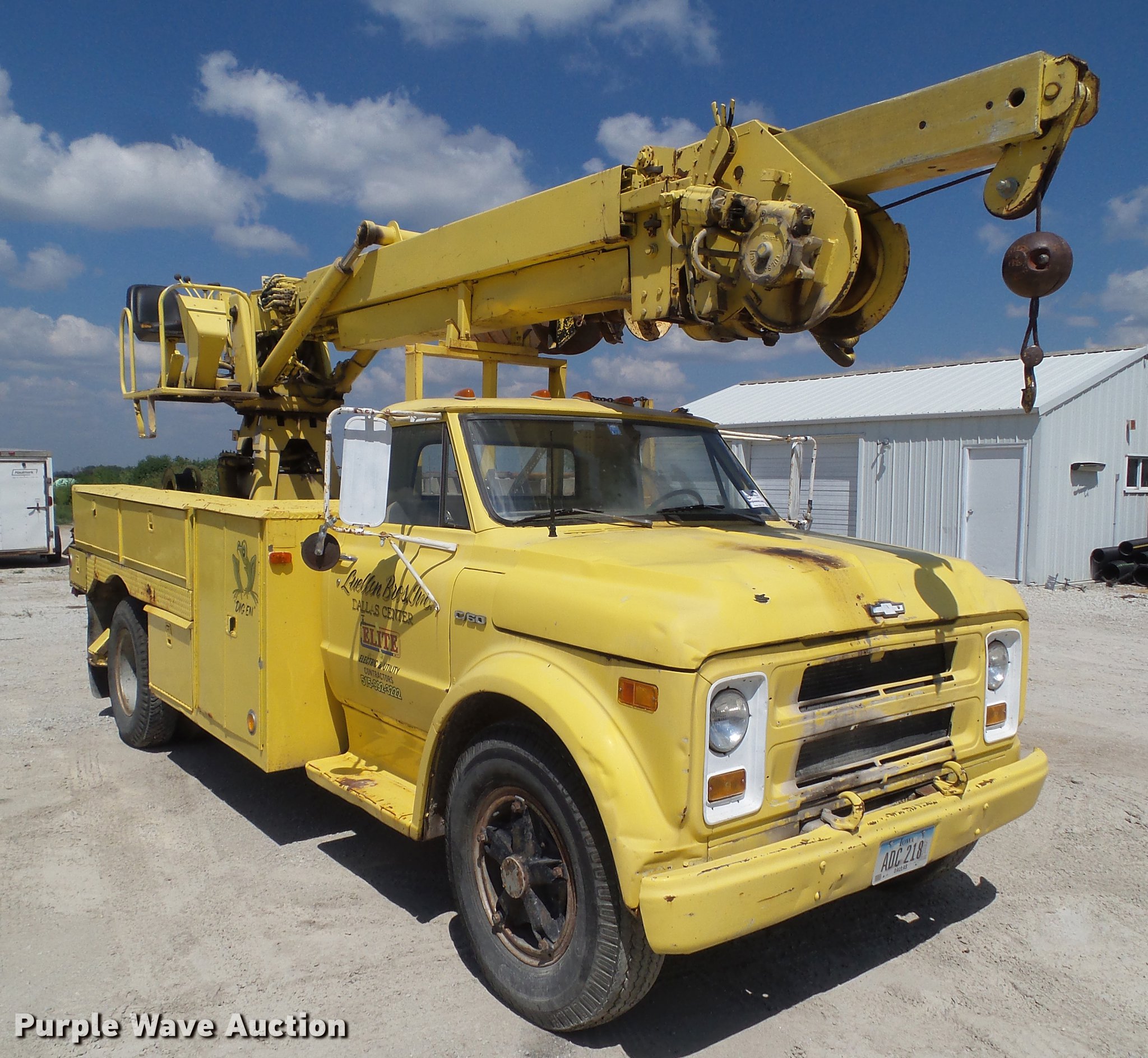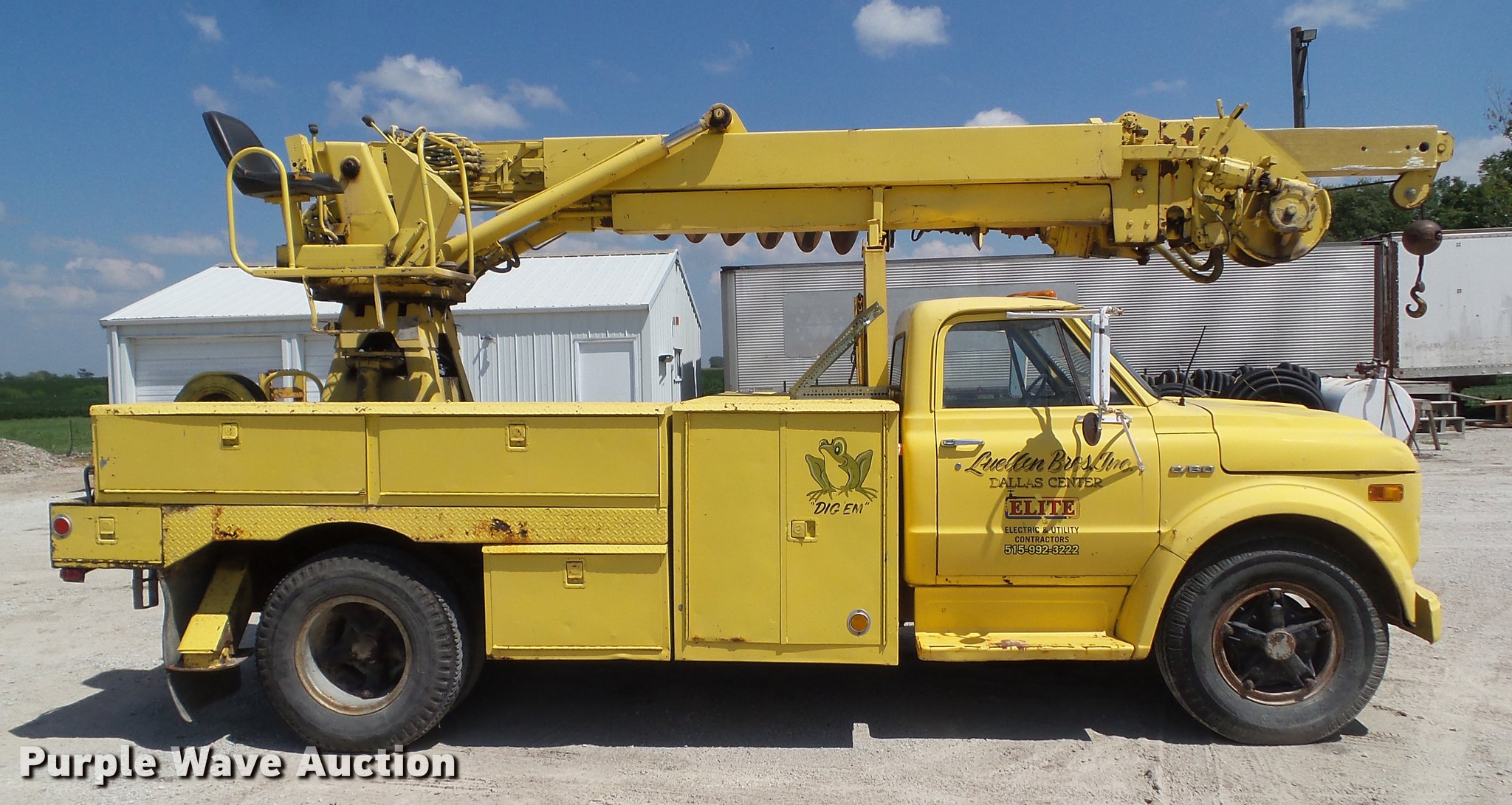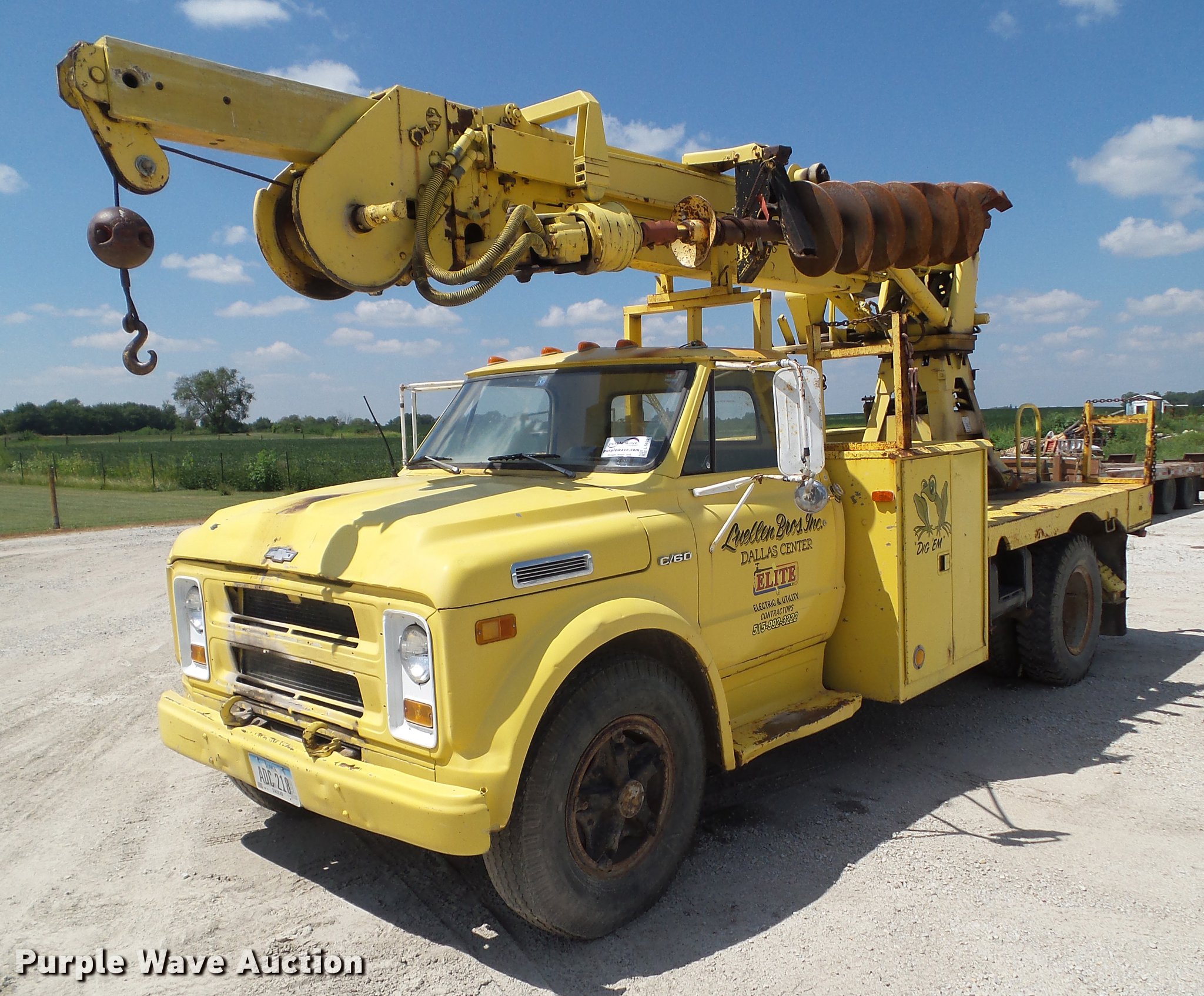 1970 Chevrolet C60 drill rig truck. 18,668 miles on odometer, 390 C.I.D. eight cylinder gas engine, Five speed manual transmission, Single axle, Heat, AM/FM, Suspension seat, PTO, Backup alarm, 13'L x 95"W bed Steel floor, 1970 Tel-E-Lect 1A100CP drill 18" diameter auger, 8" diameter auger, (2) outriggers, Operator's station, Serial 9353570, 169" wheelbase, Spring suspension, 9.00-20 tires, GVWR 32,000 lbs. Iowa title. CE630P167110. Elite Electric and Utility Contractors. 1403 Sugar Grove. Dallas Center, IA 50063