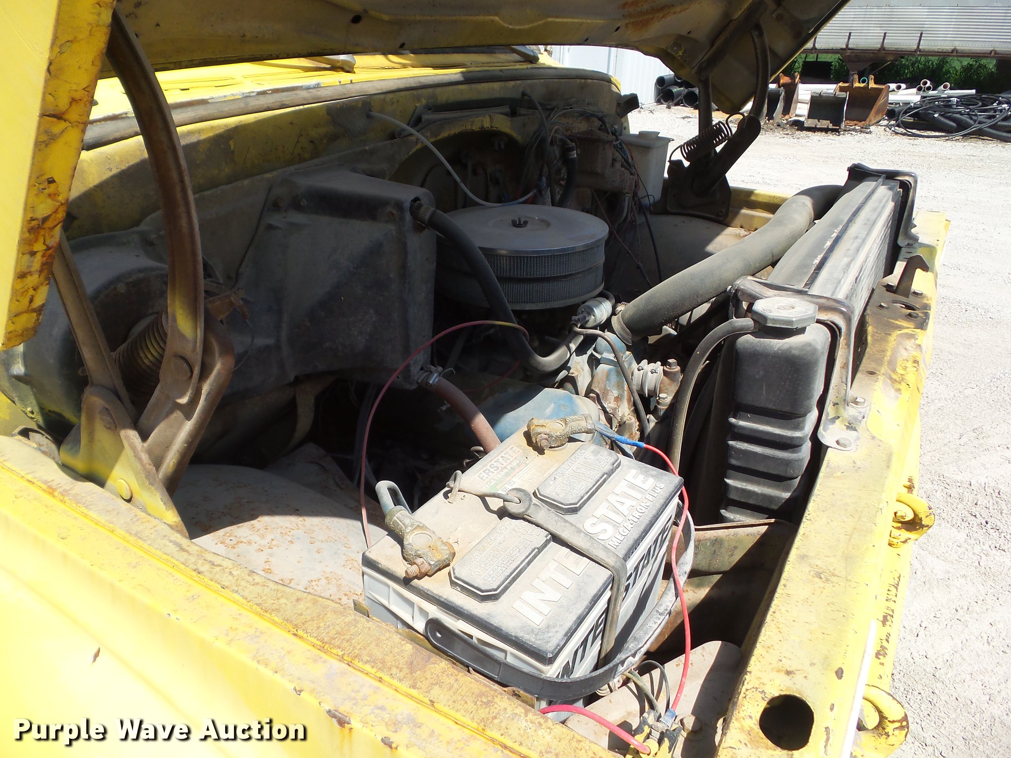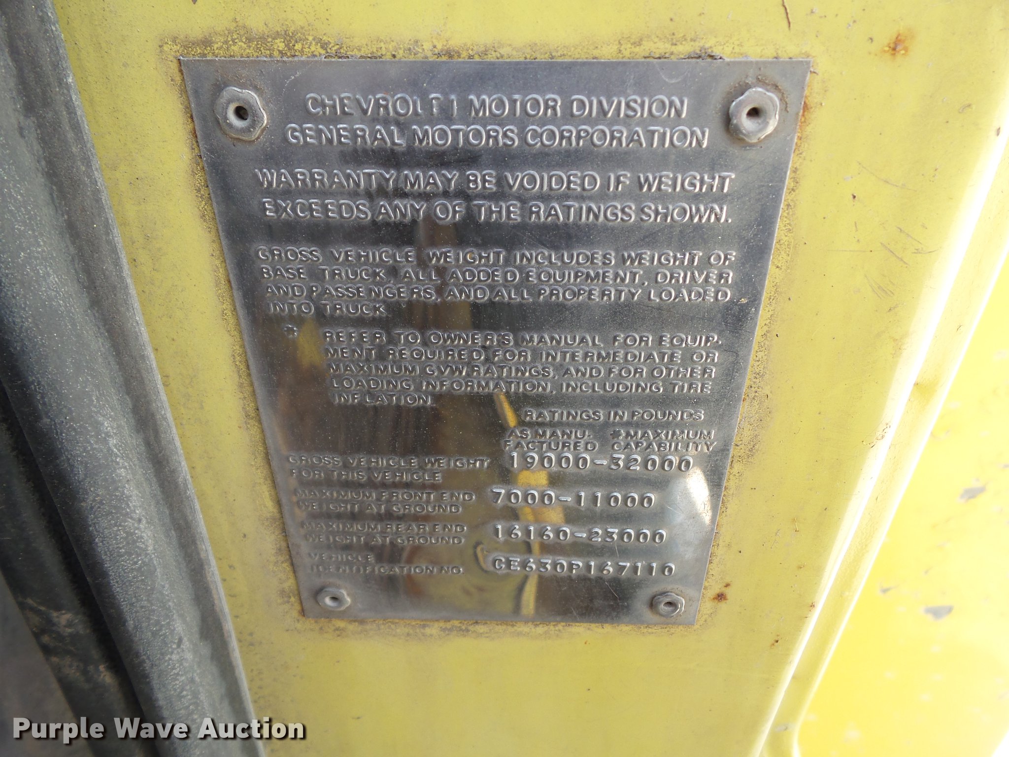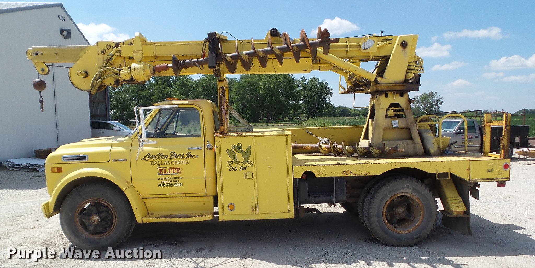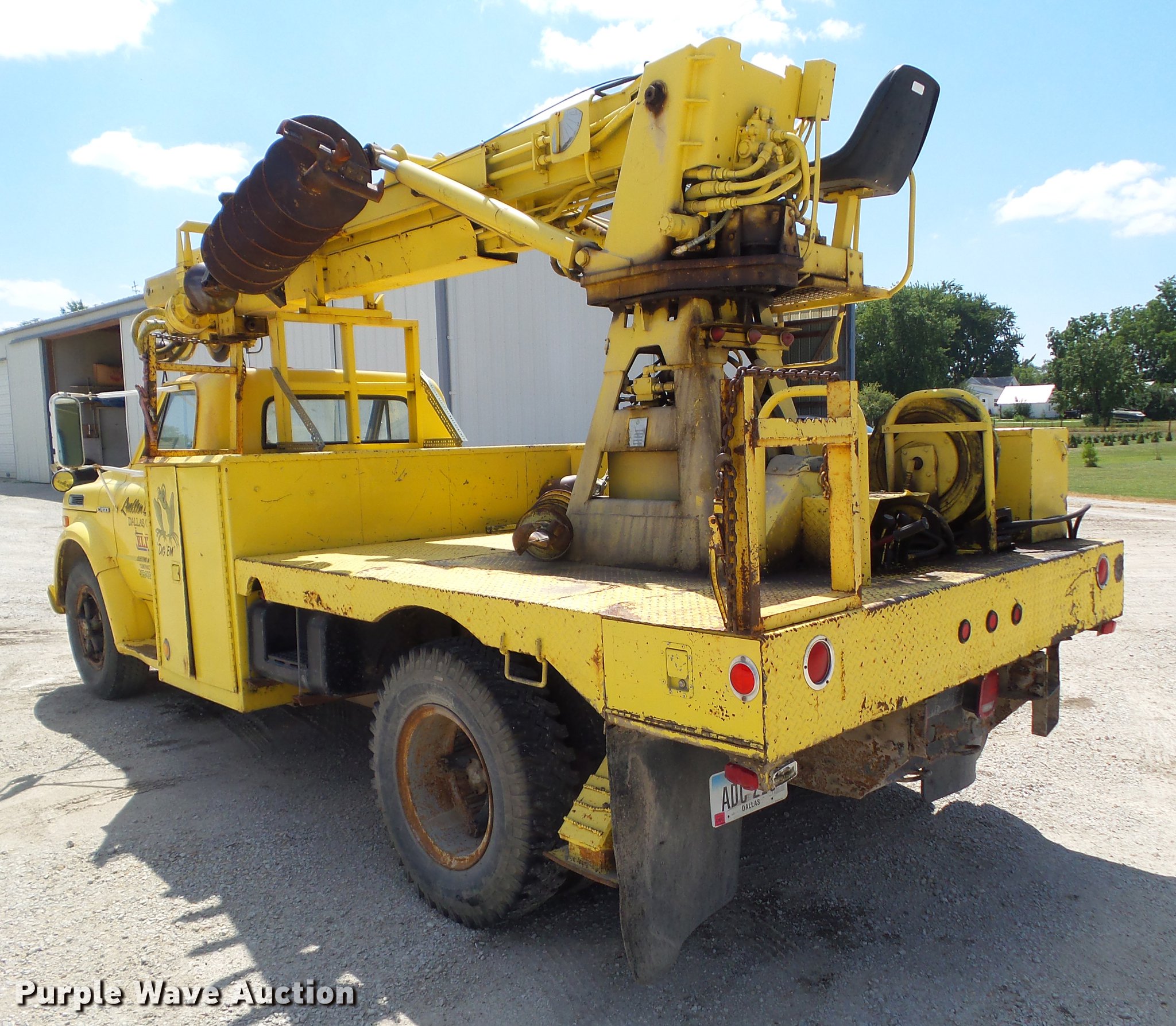 Purple Wave is selling a used Drilling Rig Truck in Iowa. This item is a 1970 Chevrolet C60 drill rig truck with the following: 18,668 miles on odometer, 390 C.I.D. eight cylinder gas engine, Five speed manual transmission, Single axle, Heat, AM/FM, Suspension seat, PTO, Backup alarm, 13'L x 95"W bed, Steel floor, 1970 Tel-E-Lect 1A100CP drill, 18" diameter auger, 8" diameter auger, (2) outriggers, Operator's station, Serial 9353570, 169" wheelbase, Spring suspension, 9.00-20 tires, GVWR 32,000 lbs